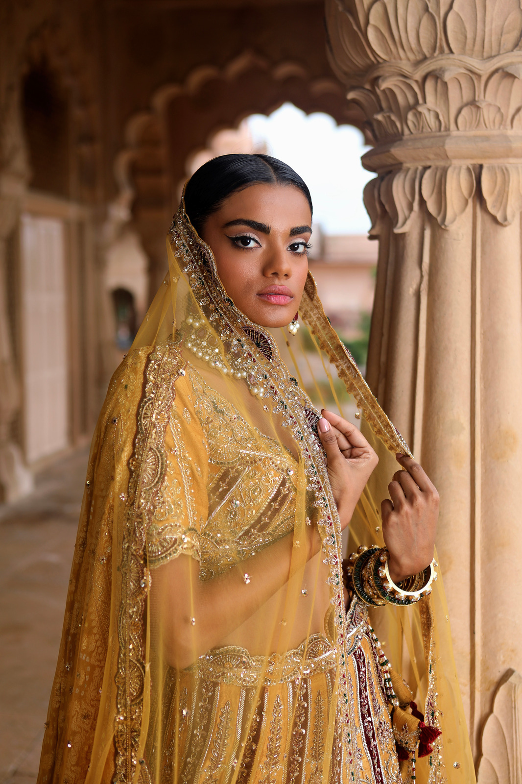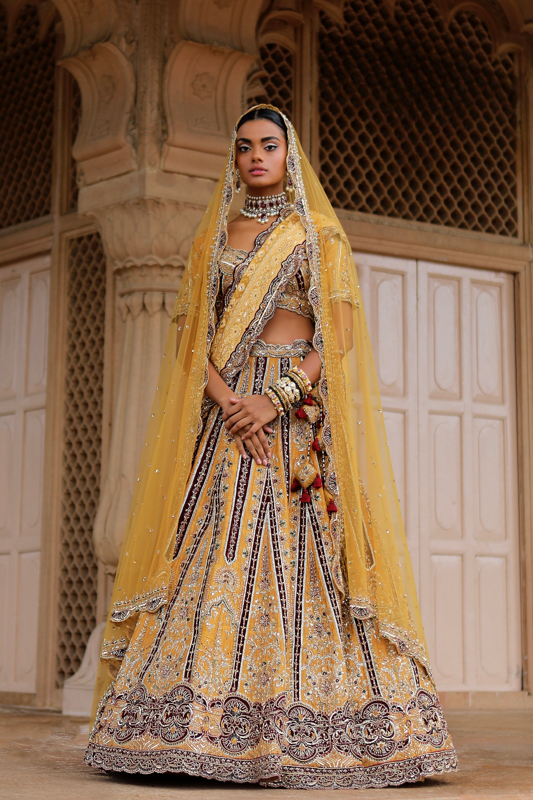 Featuring a mustard Raw Silk bridal lehenga set paired with a Butterfly Net and Satin dupatta with gold zardozi & aari embroidery
