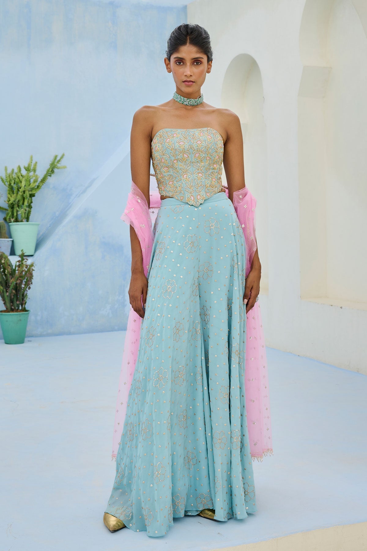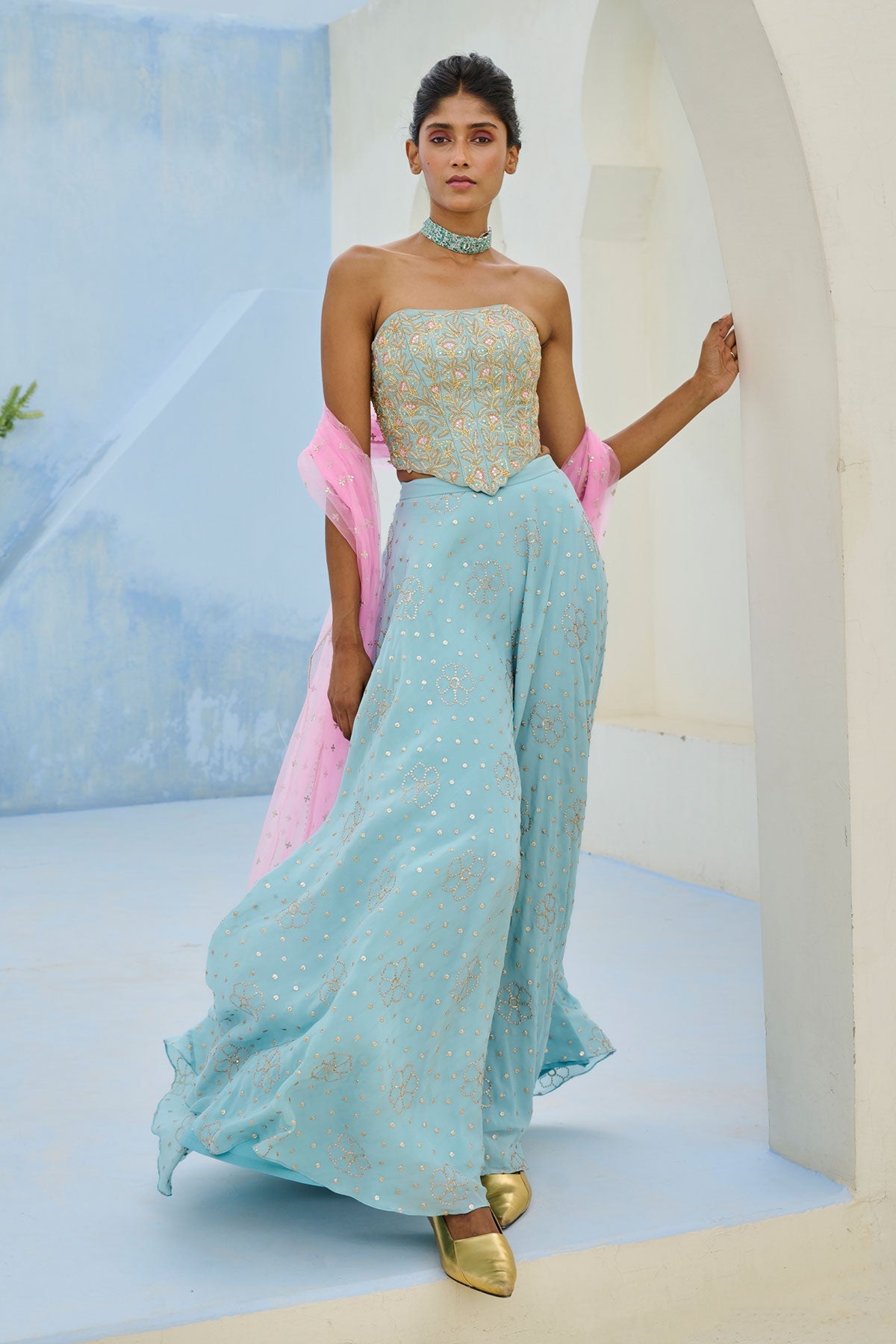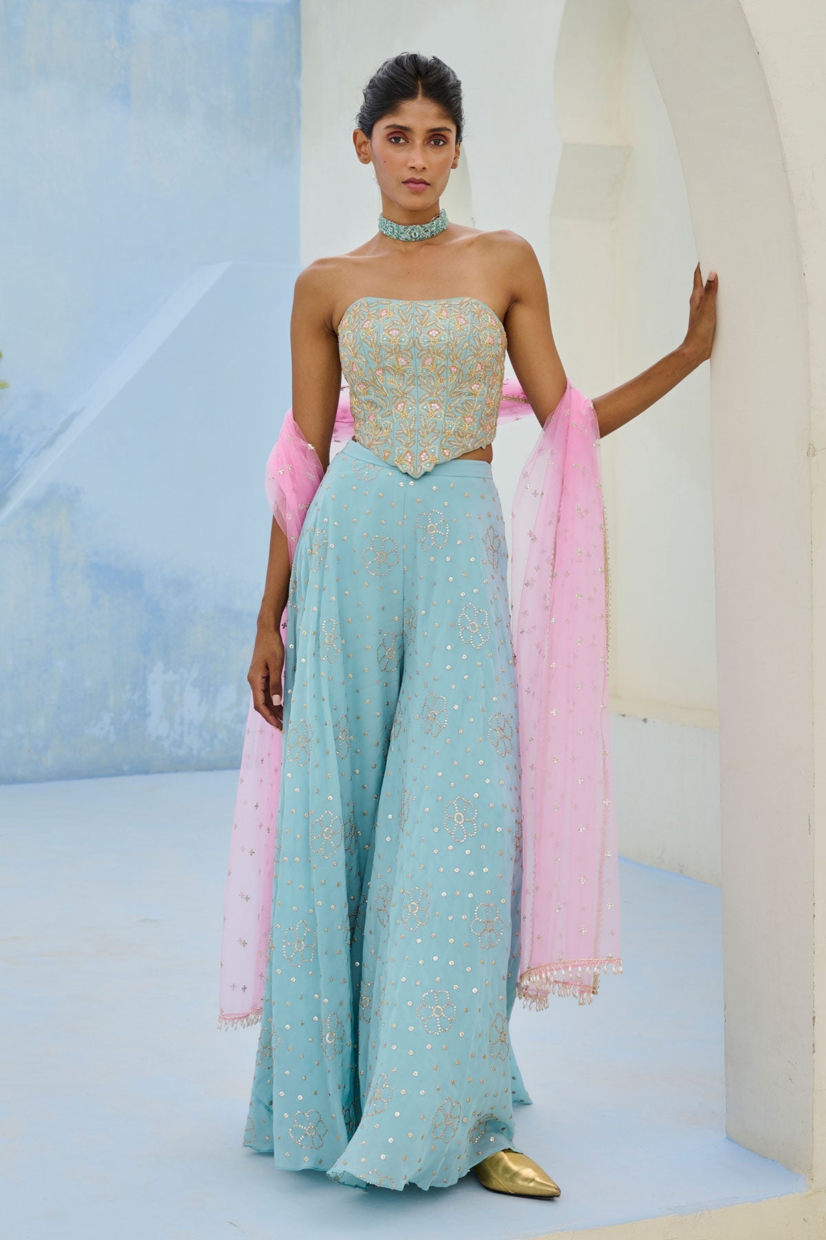 Crepe sequence embellished flared pant paired with floral glassbeads embroidered corset top and contrast pink tulle dupatta.