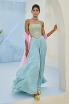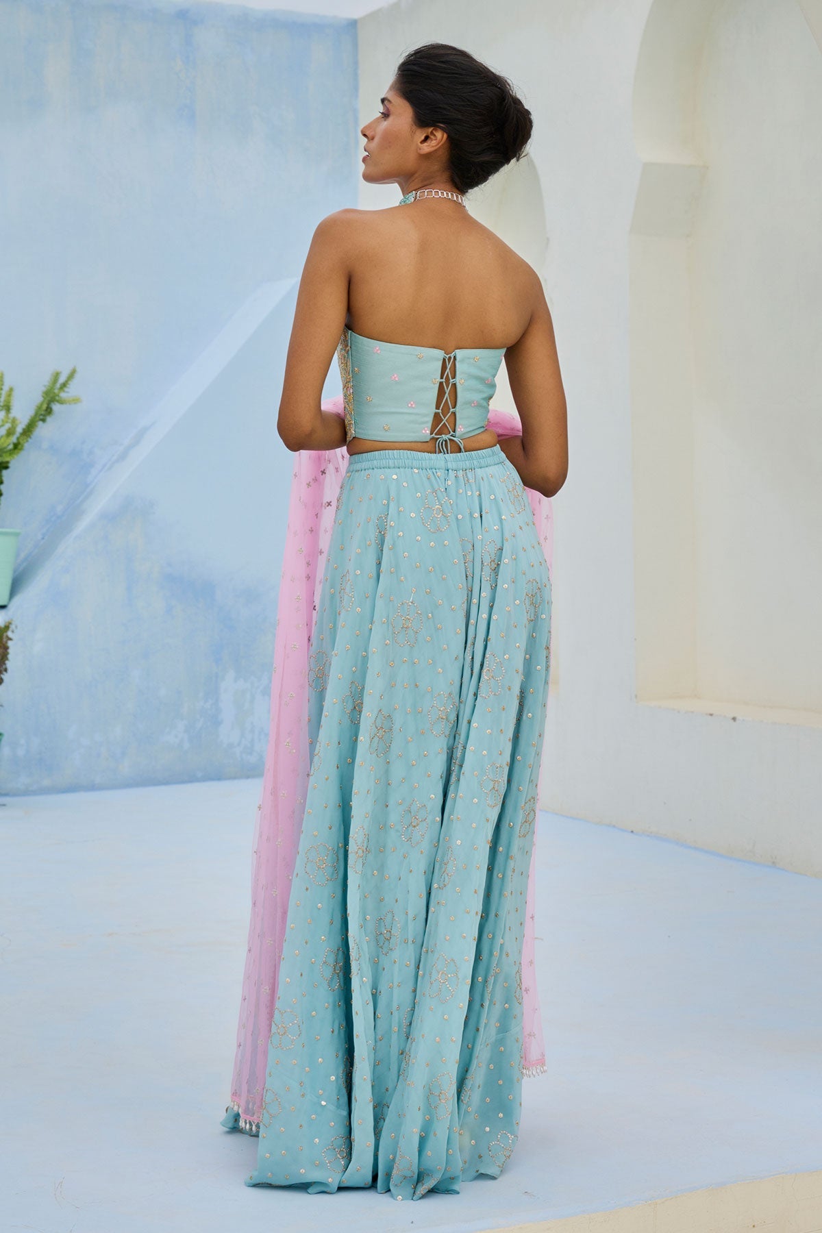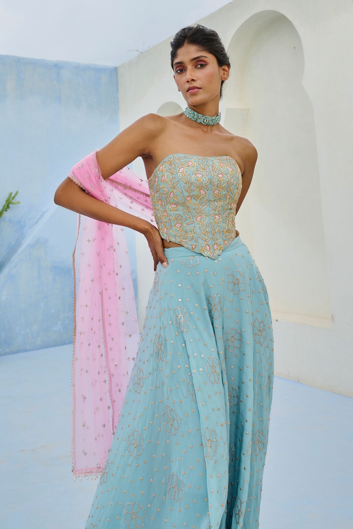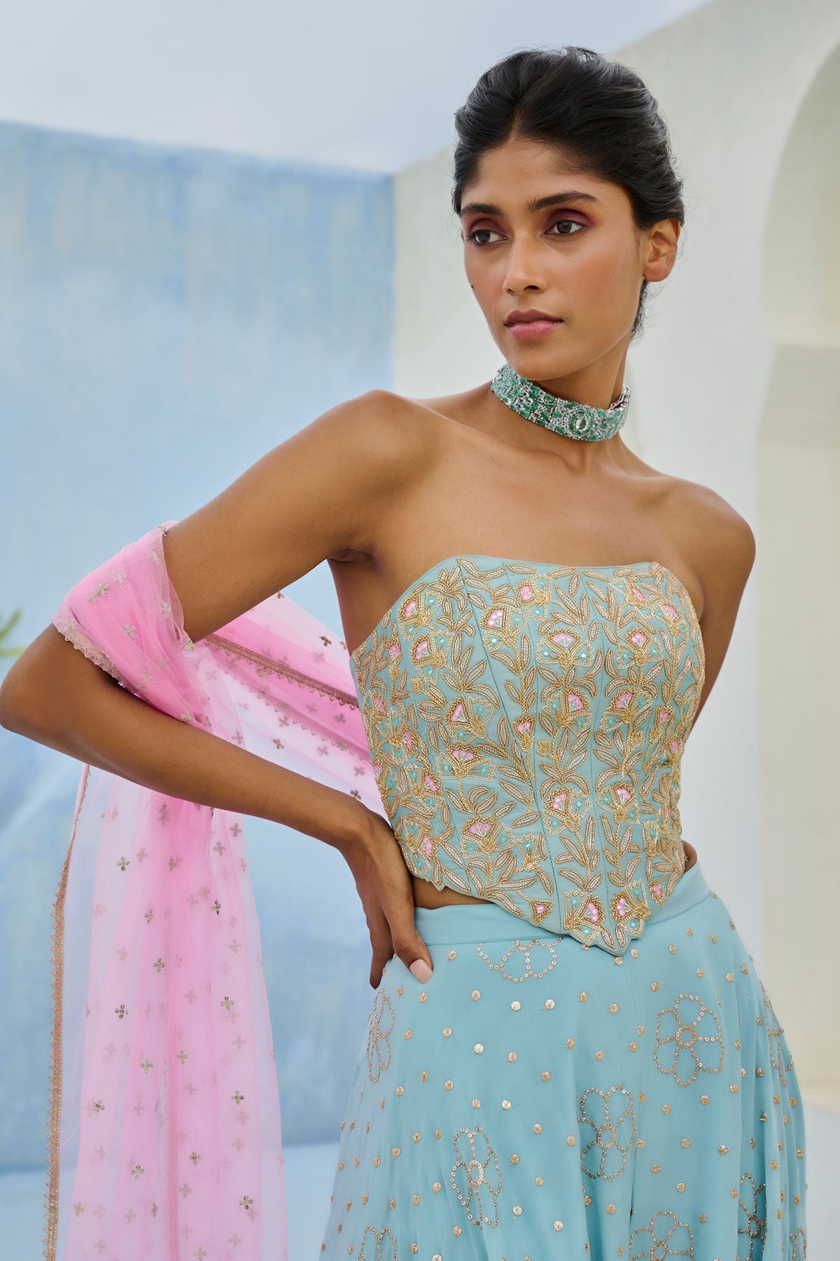 Crepe sequence embellished flared pant paired with floral glassbeads embroidered corset top and contrast pink tulle dupatta.