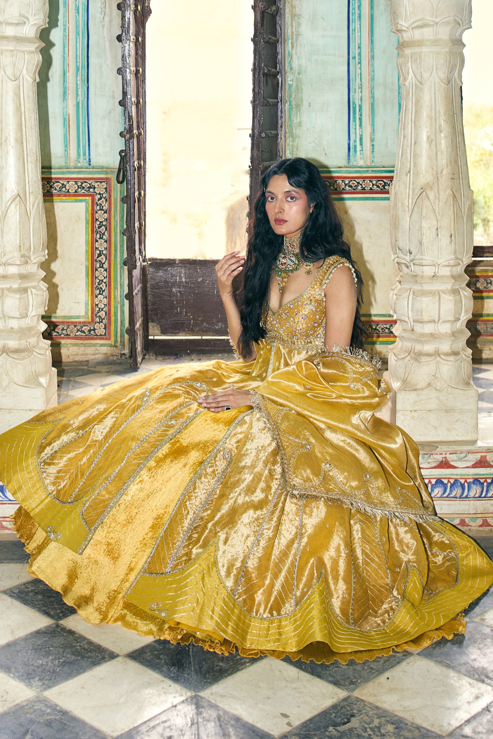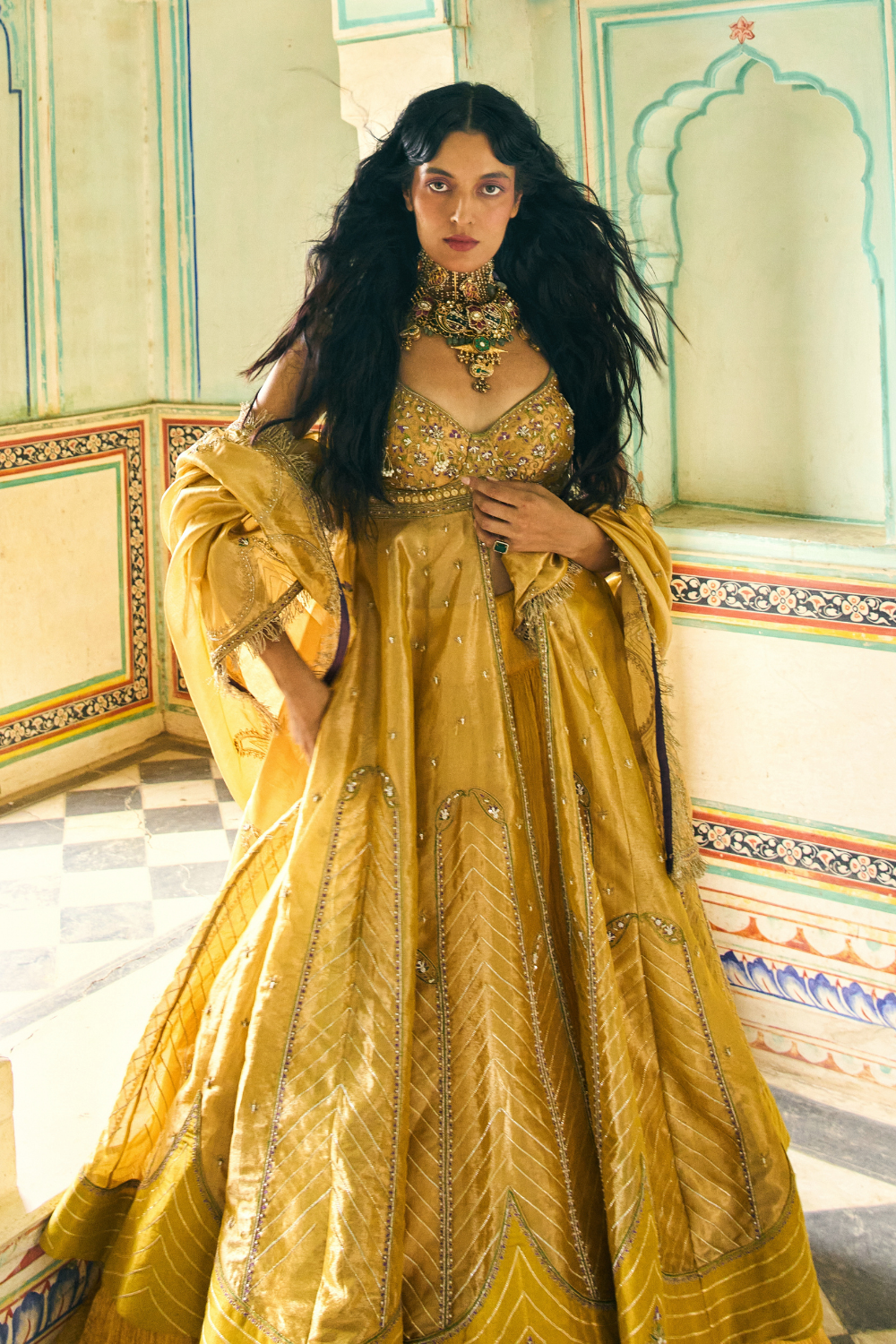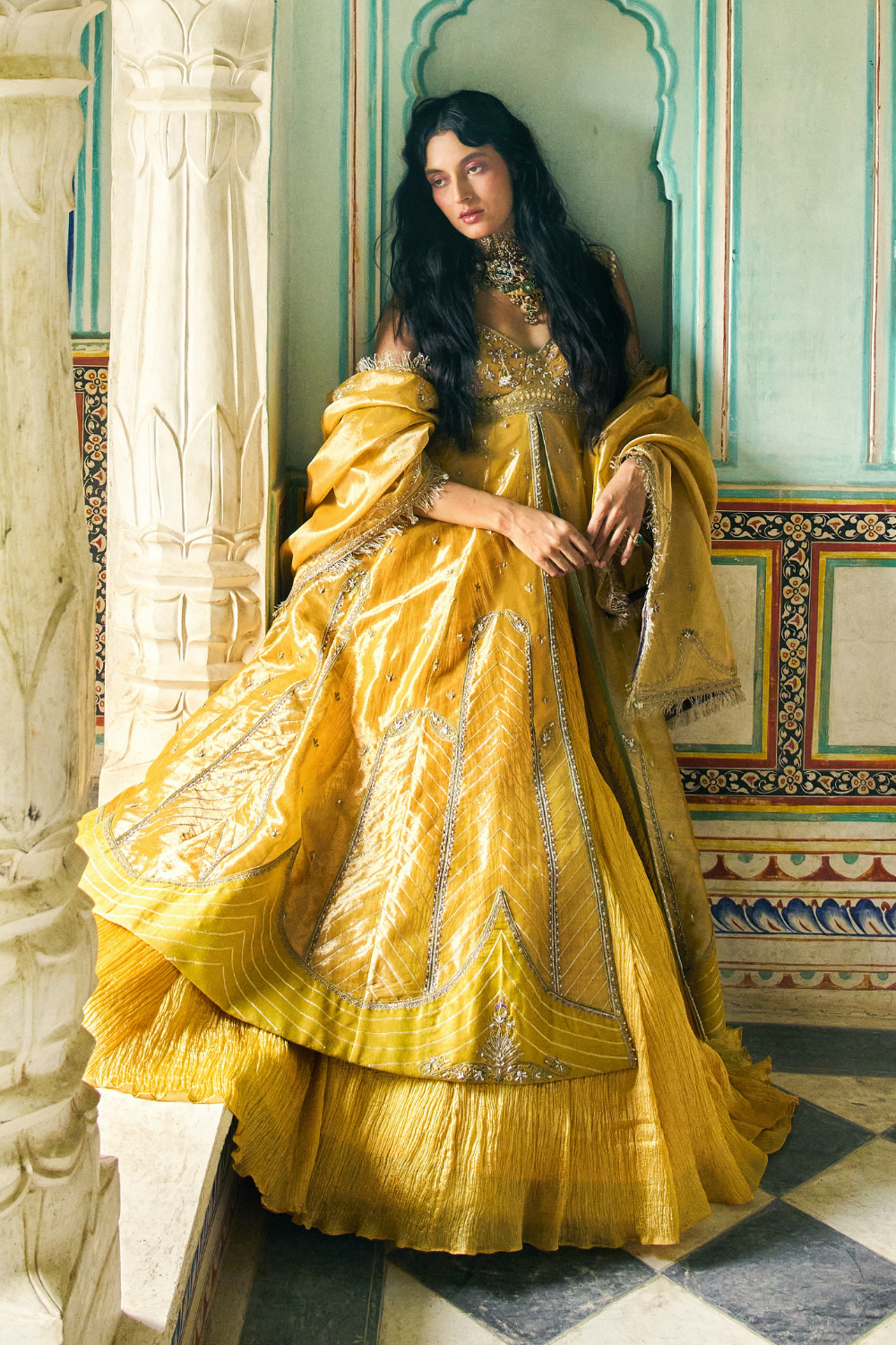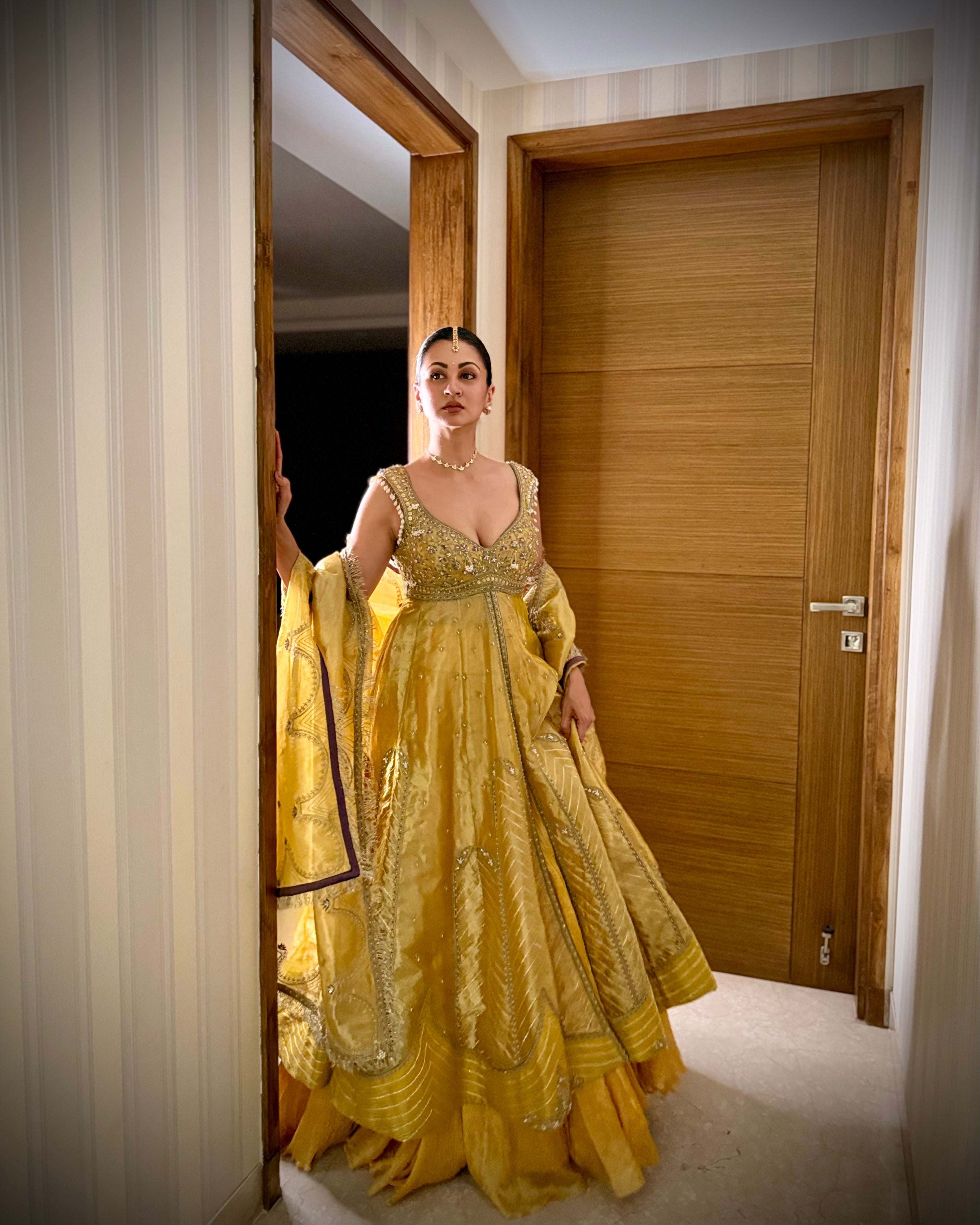 Sukhneet Wadhwa in our Mustard yellow zari tissue jacket with crushed skirt set