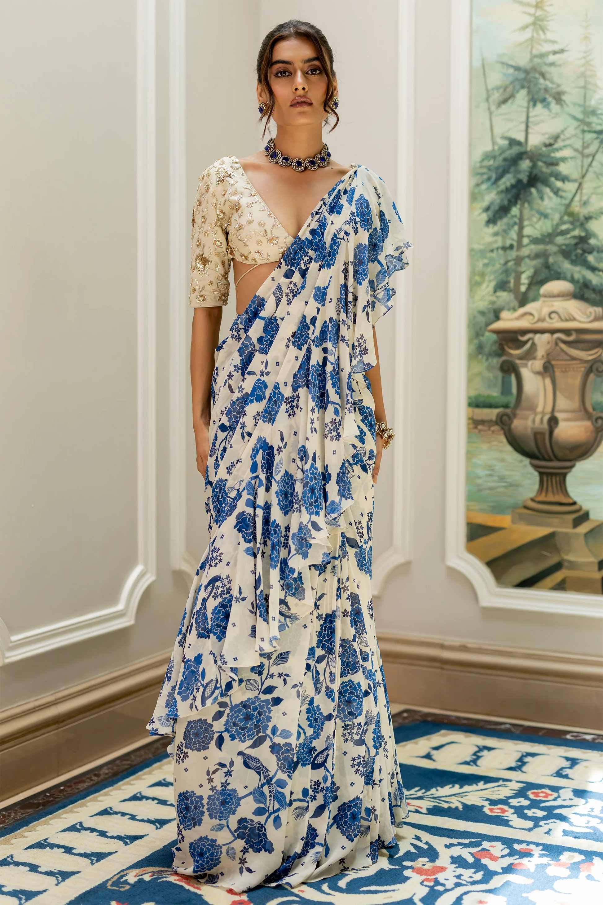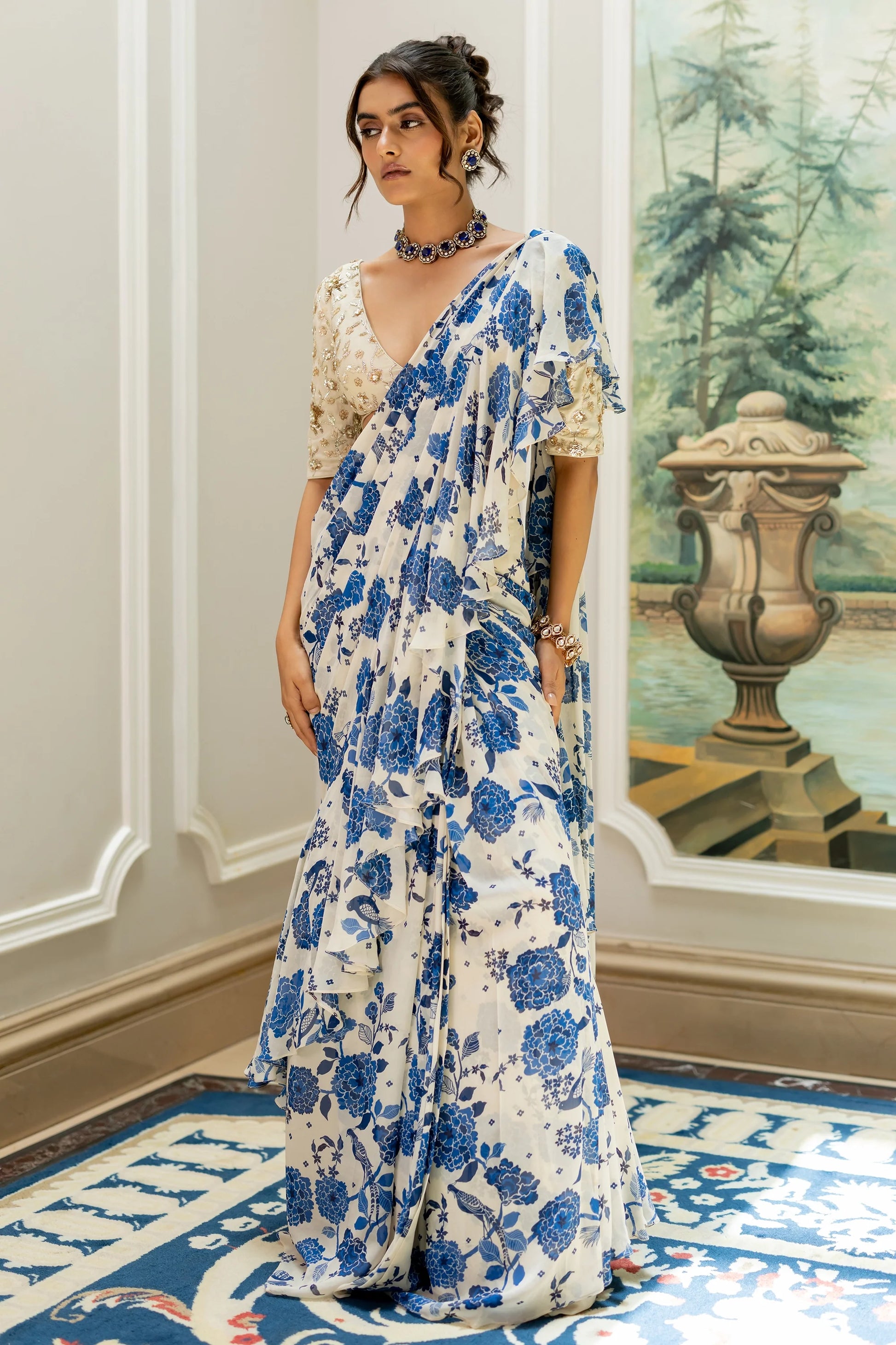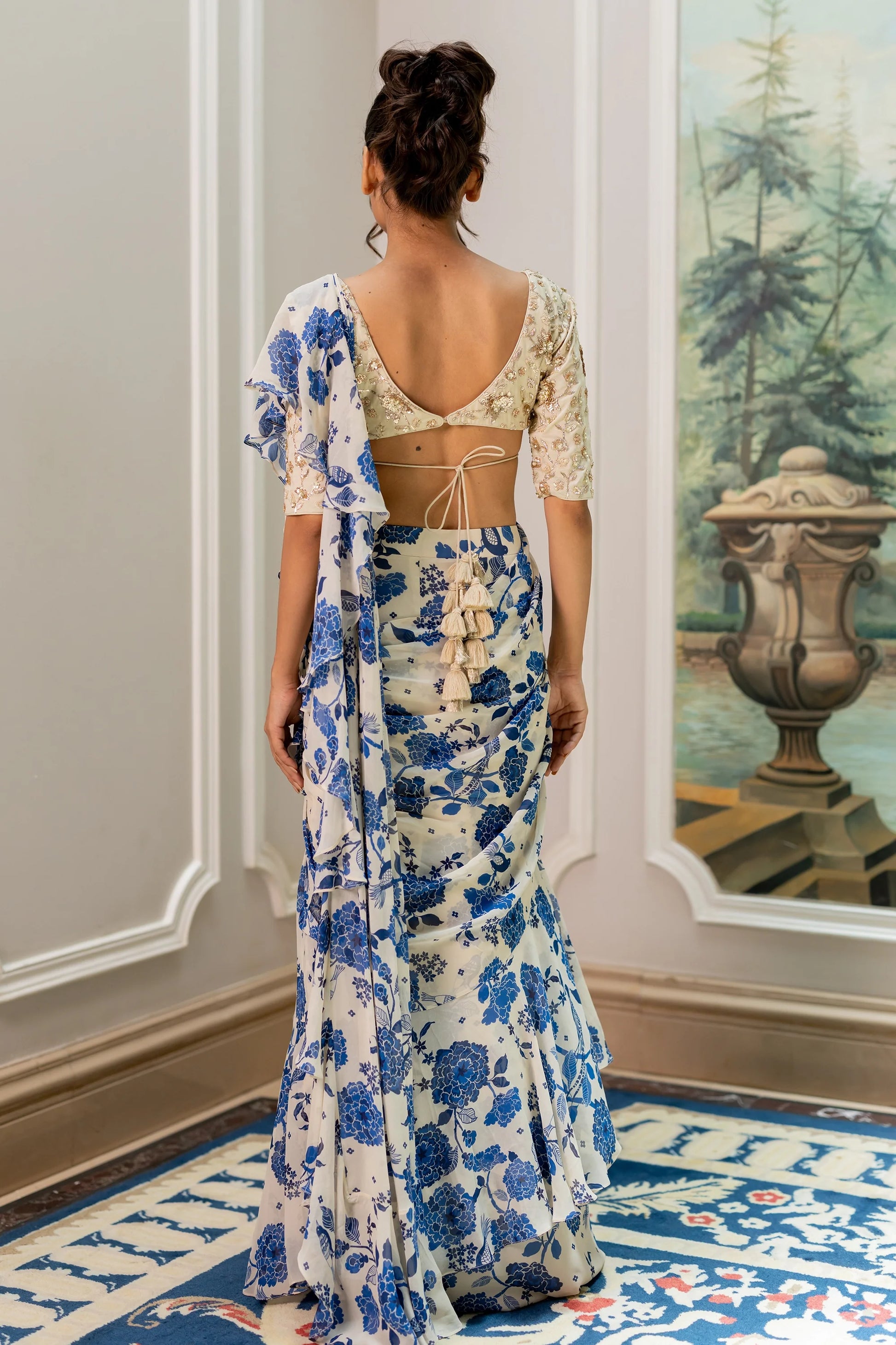 A graceful and beautiful pre-draped saree set, crafted from our signature blue and white floral printed georgette fabric, featuring layered ruffles in the saree that add extra charm to the drape. It is paired with a fully hand-embroidered blouse with elbow length sleeves and tassel detailed drawstrings at the back, making it versatile enough to be styled with other separates.