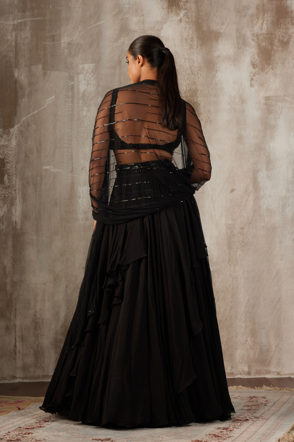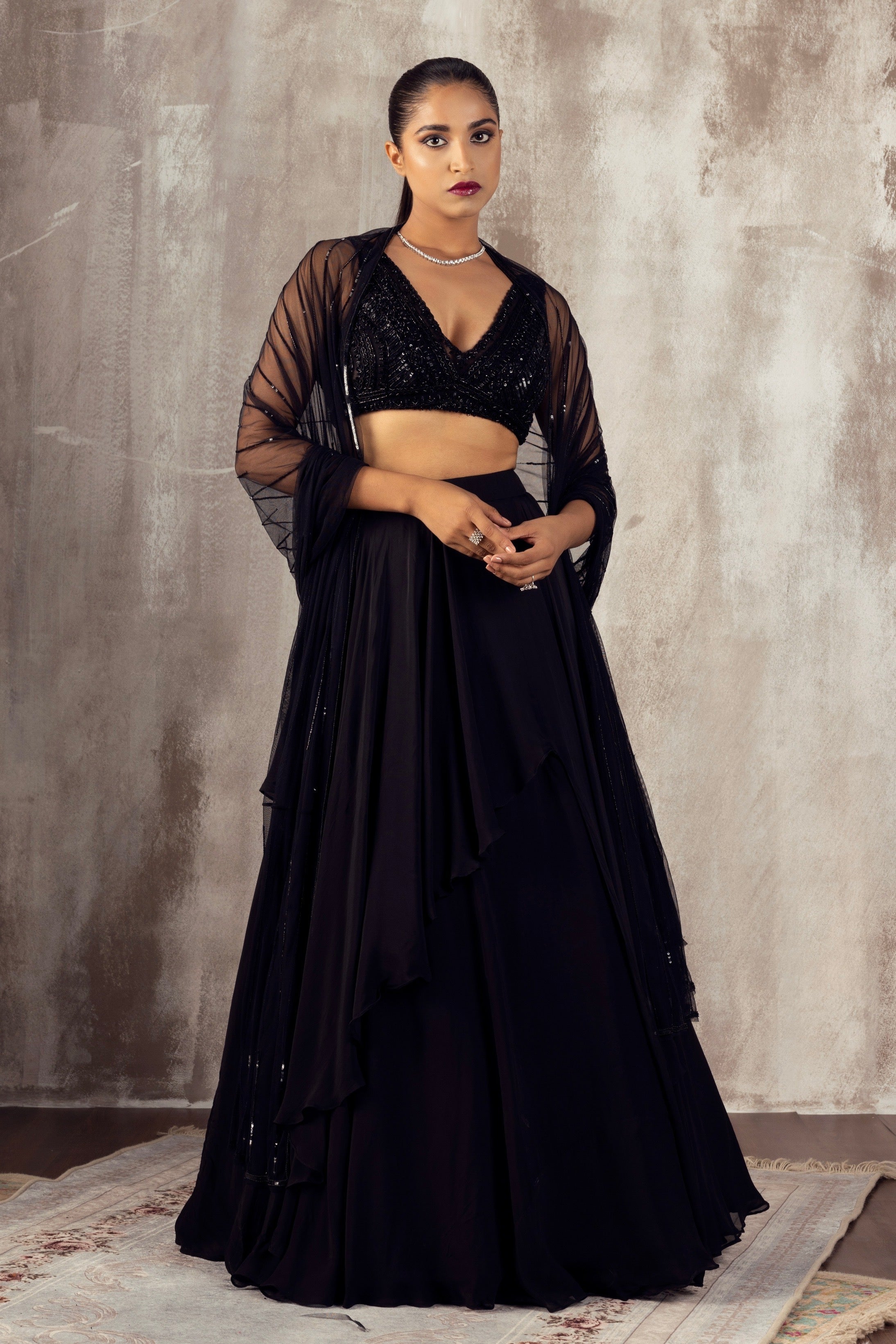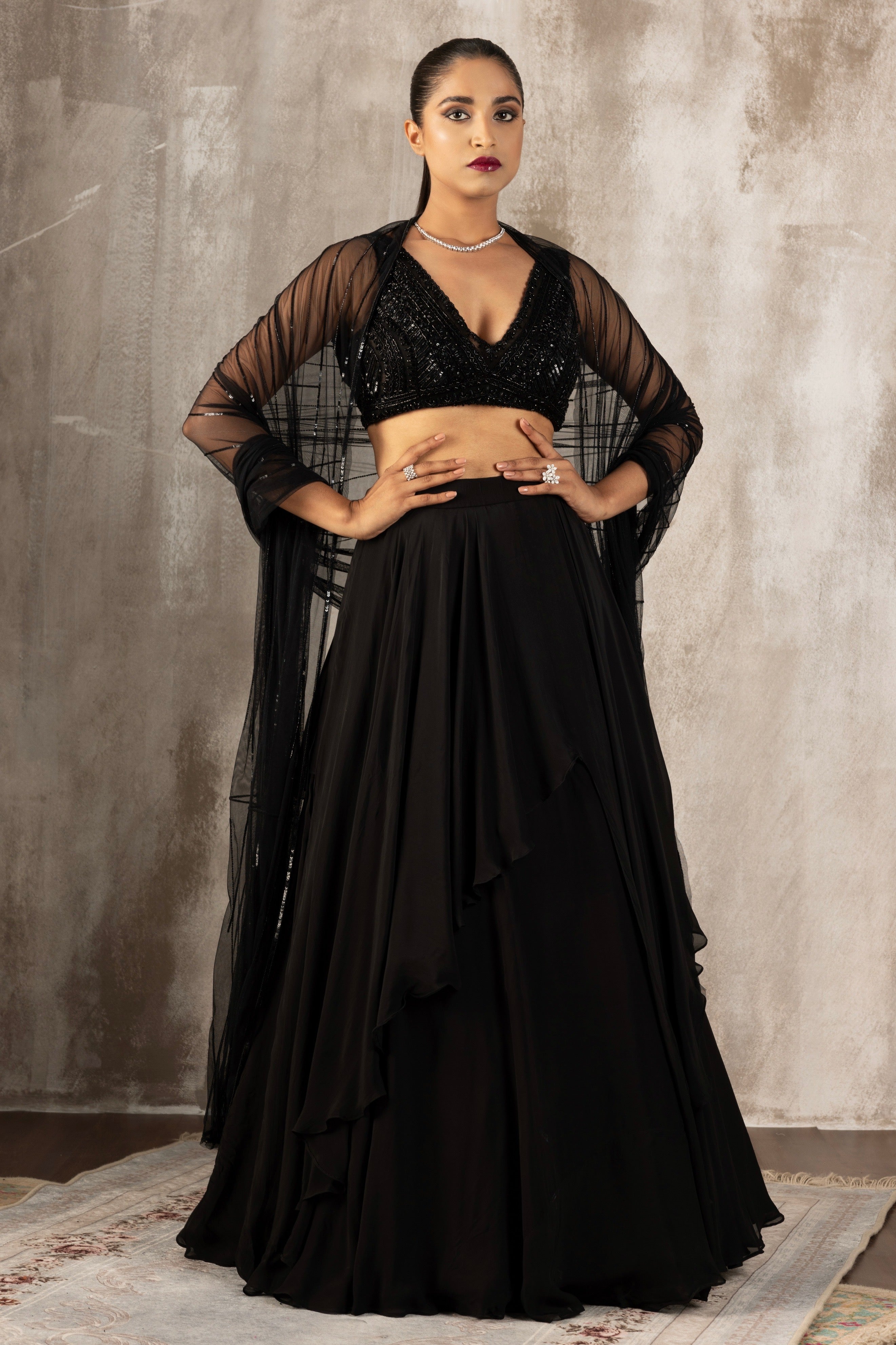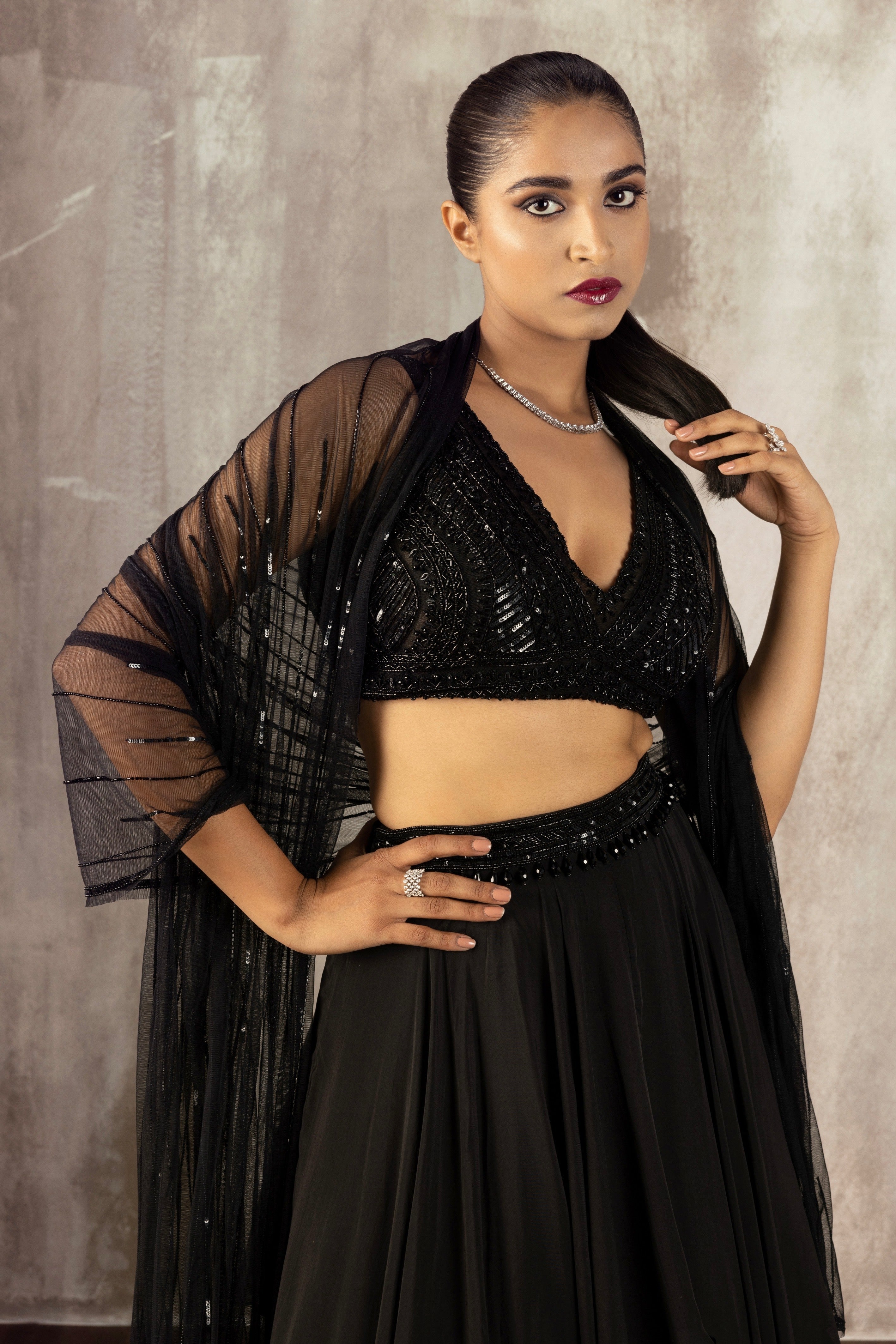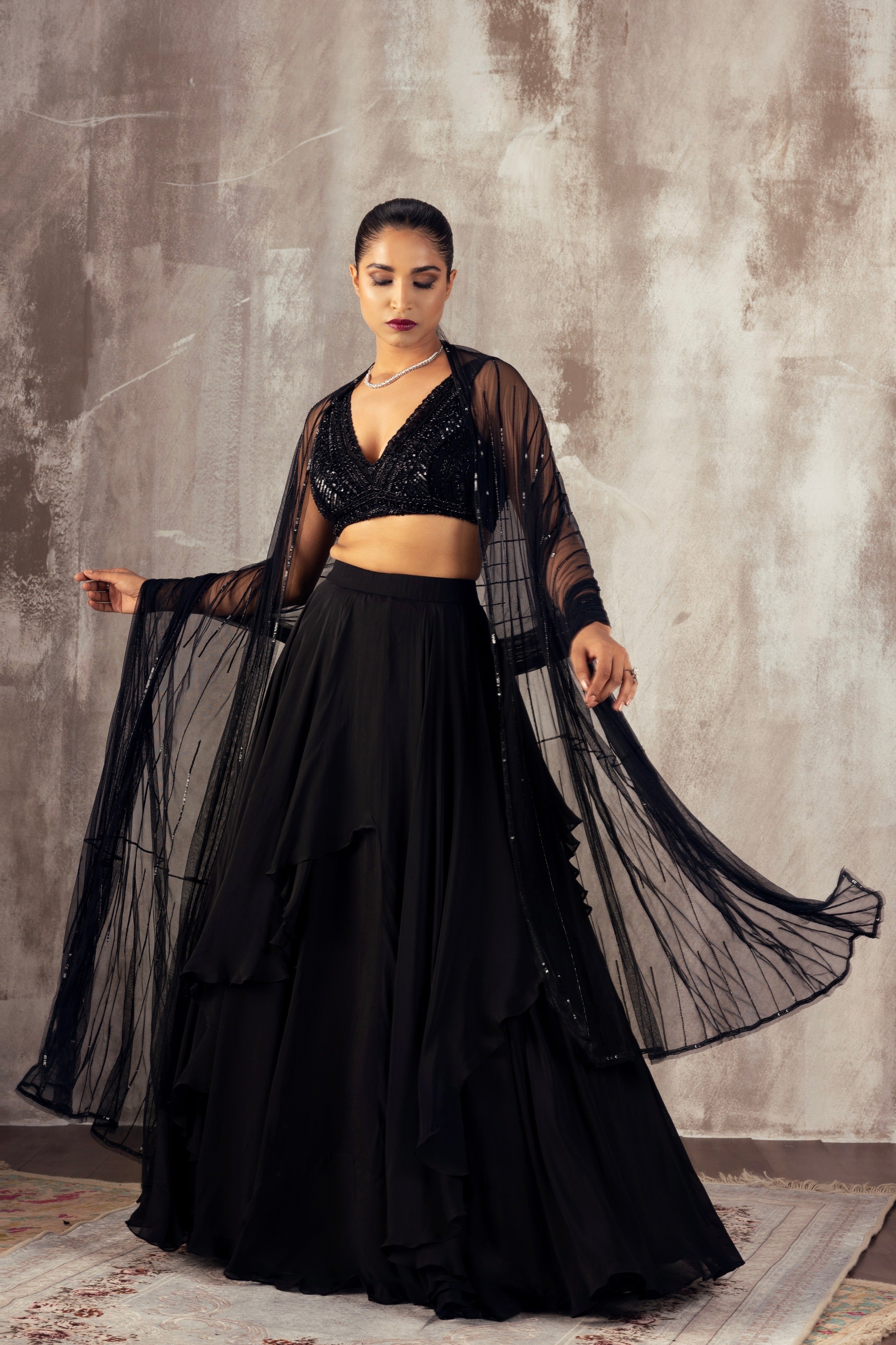Featuring a black contemprory layered lehenga set paired with a hand embroidered sequined blouse and cape