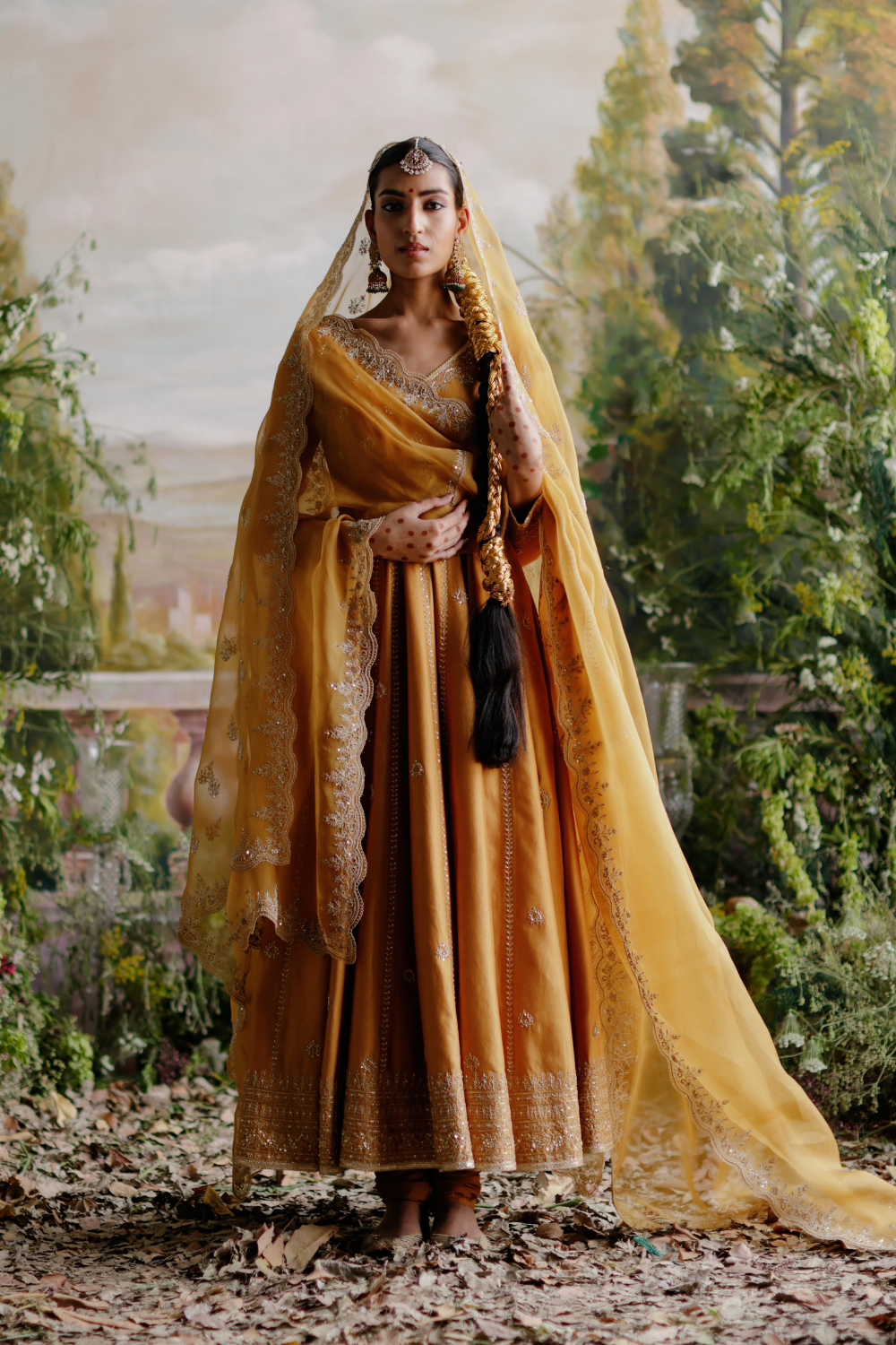 Featuring a Tuscany mustard Chanderi anarkali set paired with an organza base dupatta with antique gold dori and aari embroidery.