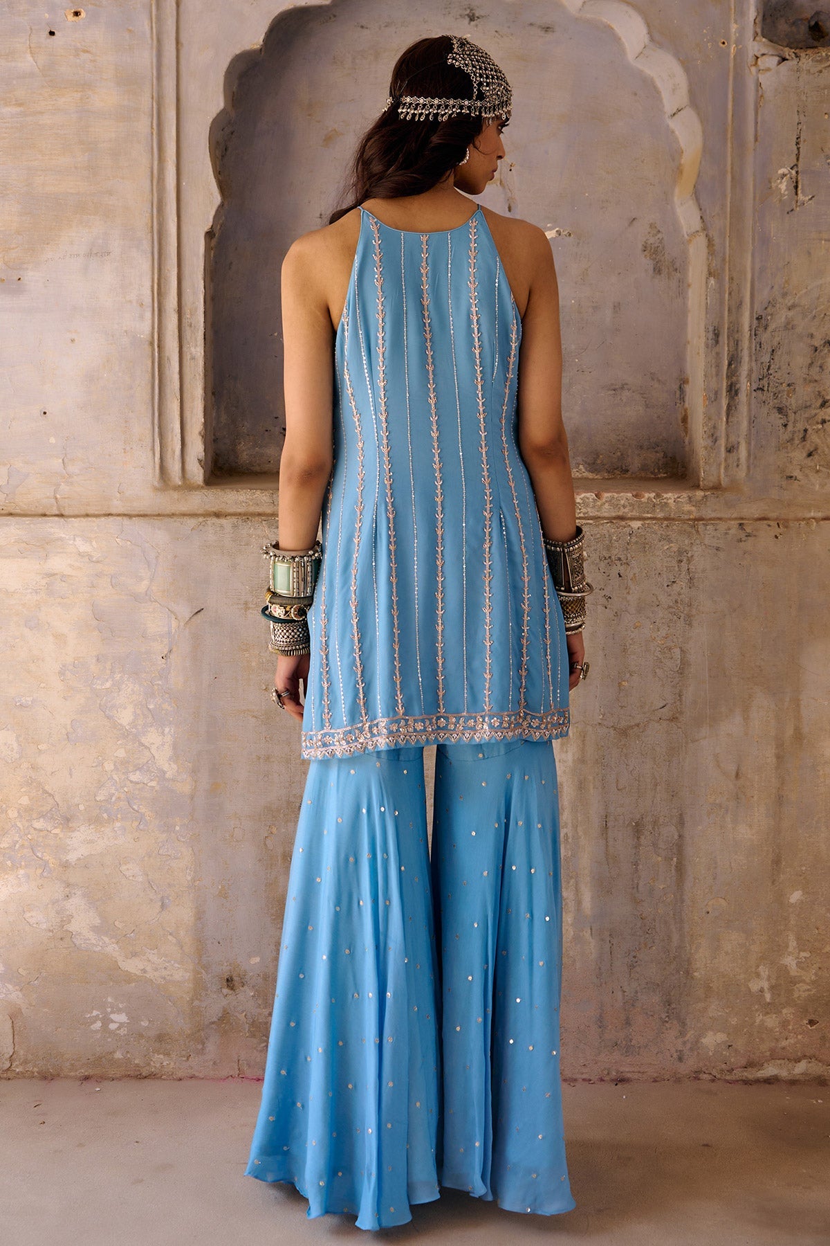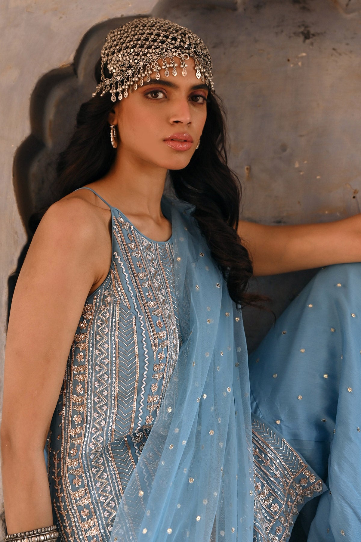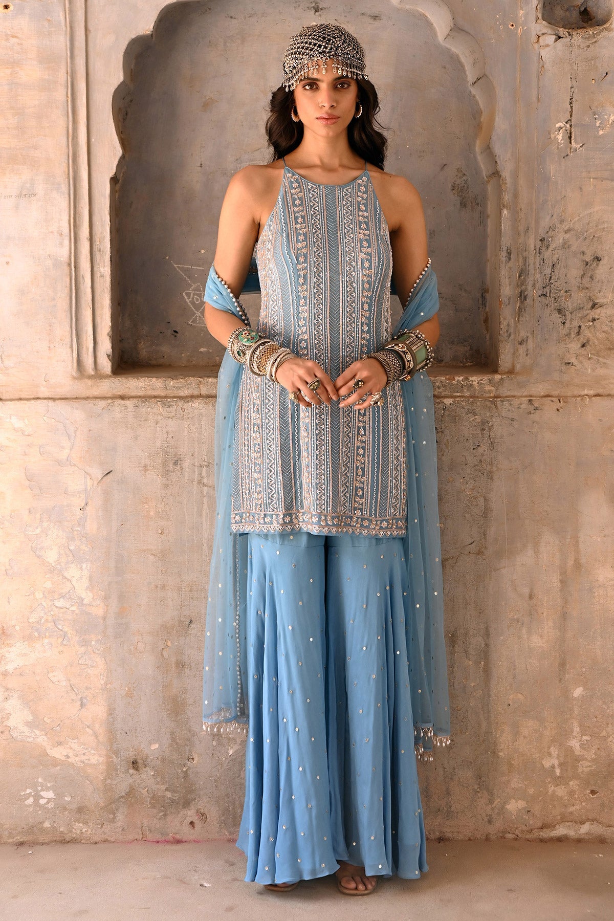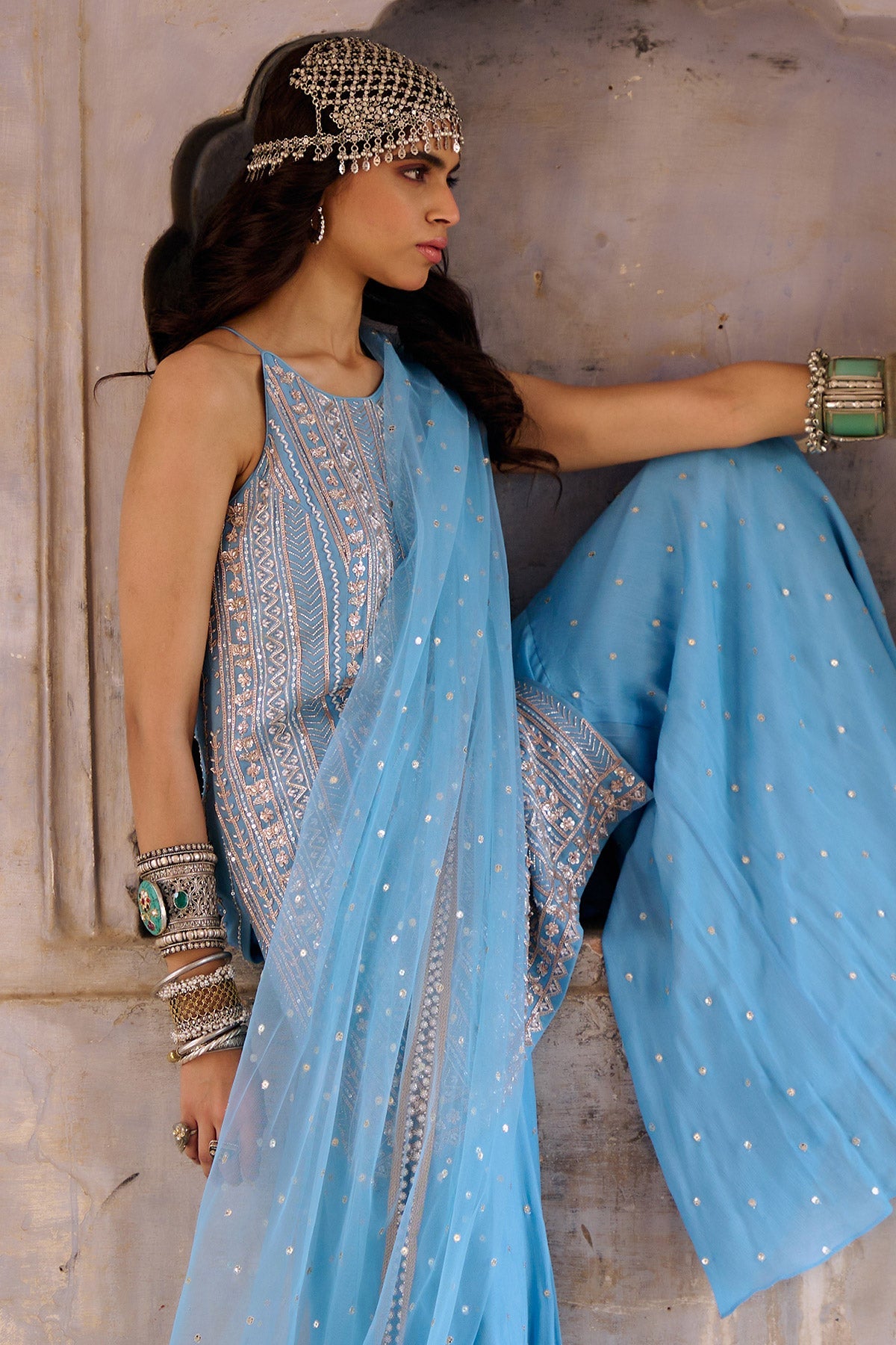 Crepe kurta with glassbeads, zardozi, pearls embroidery, and georgette flared pants along with a tulle dupatta.