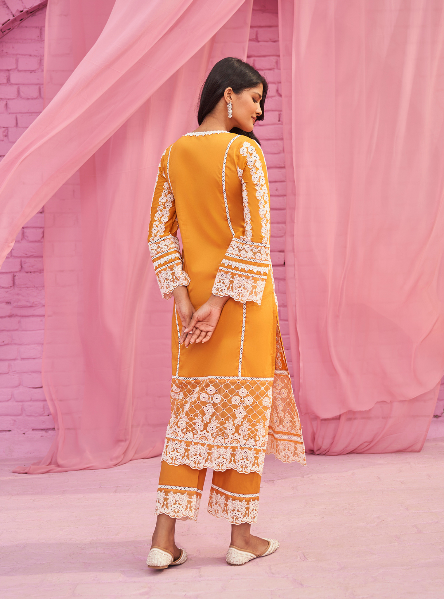Contact Us For CustomizationInfuse your wardrobe with the vibrant spirit of sunshine and elegance with this mesmerizing orange kurta set. The kurta, adorned with delicate white floral embroidery, creates a stunning contrast against the rich orange base, exuding an aura of freshness and vitality. The intricate white lace detailing along the neckline, sleeves, and hemline adds a touch of sophistication and refinement. The matching straight trousers, featuring coordinated lace trims at the cuffs, ensure a cohesive and polished look.