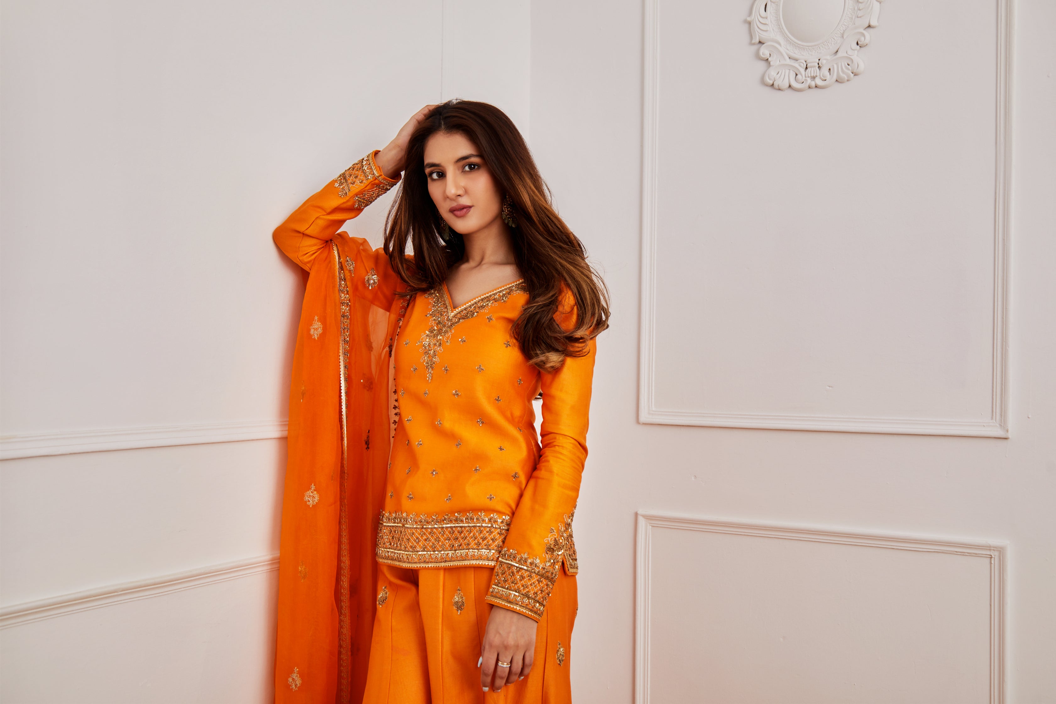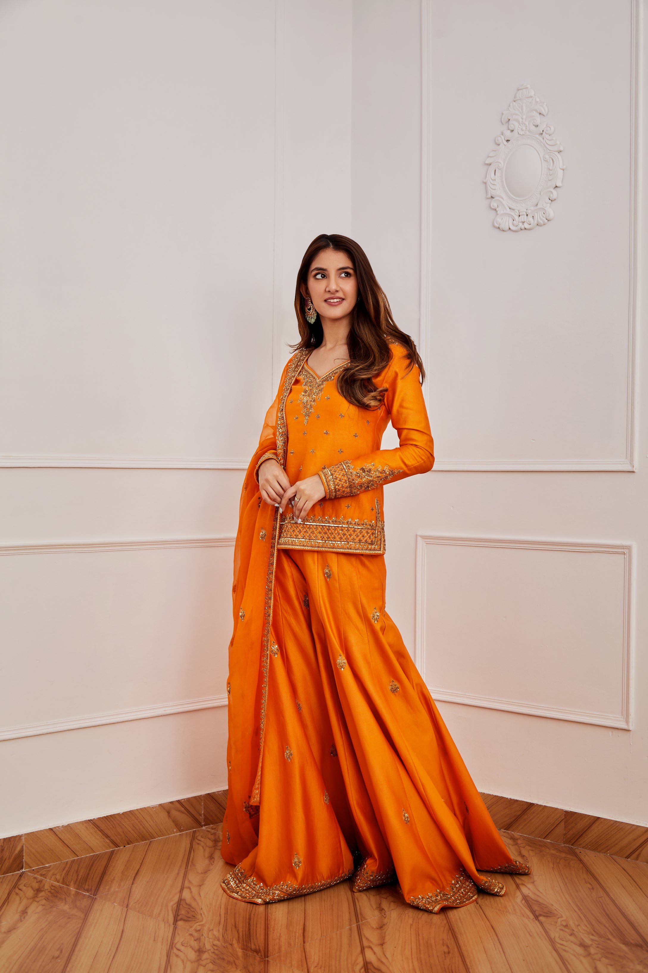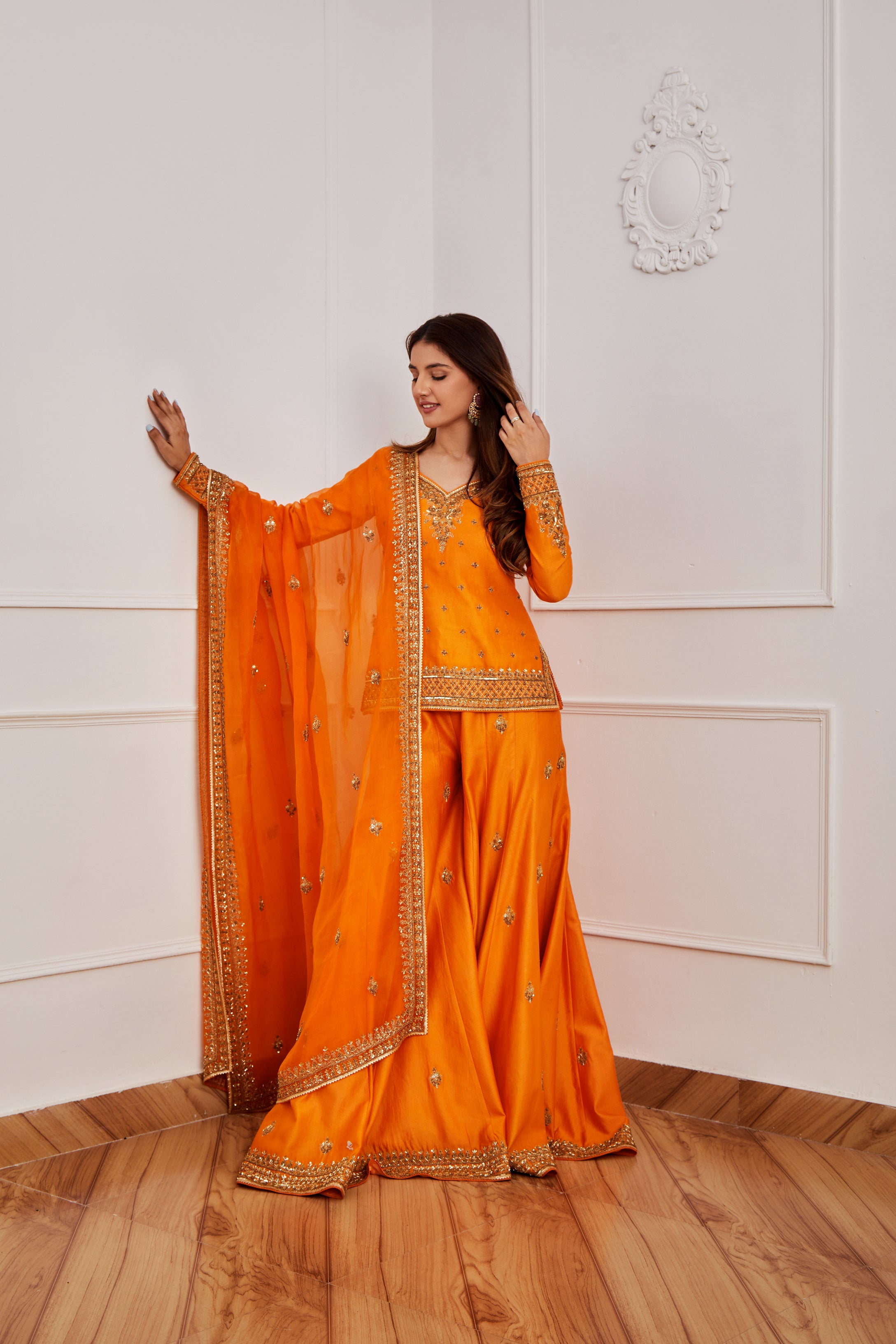 Featuring an orange chanderi kurta sharara set paired with an organza base dupatta with antic gold dori and aari embroidery on it.