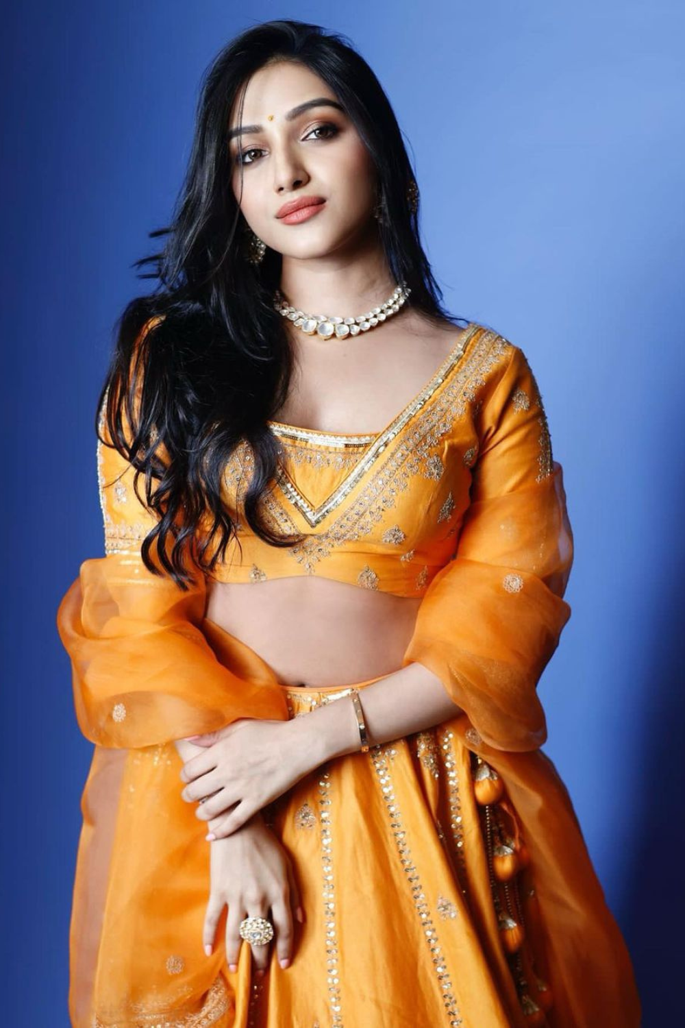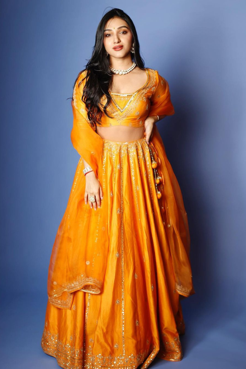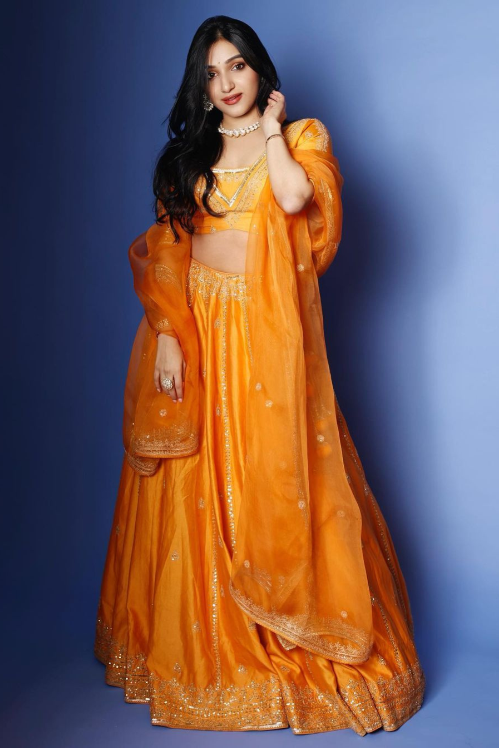 Featuring an orange Chanderi lehenga set paired with an organza base dupatta with light gold dori and aari embroidery