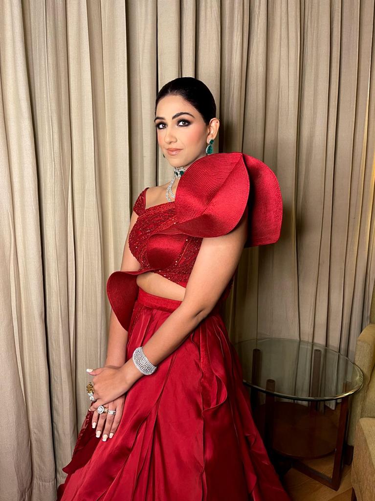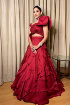 Red leaf peplum one shoulder top with placement embroidery comes with an organza ruffle skirt showing the golden tints of transparency and an attached dupatta.