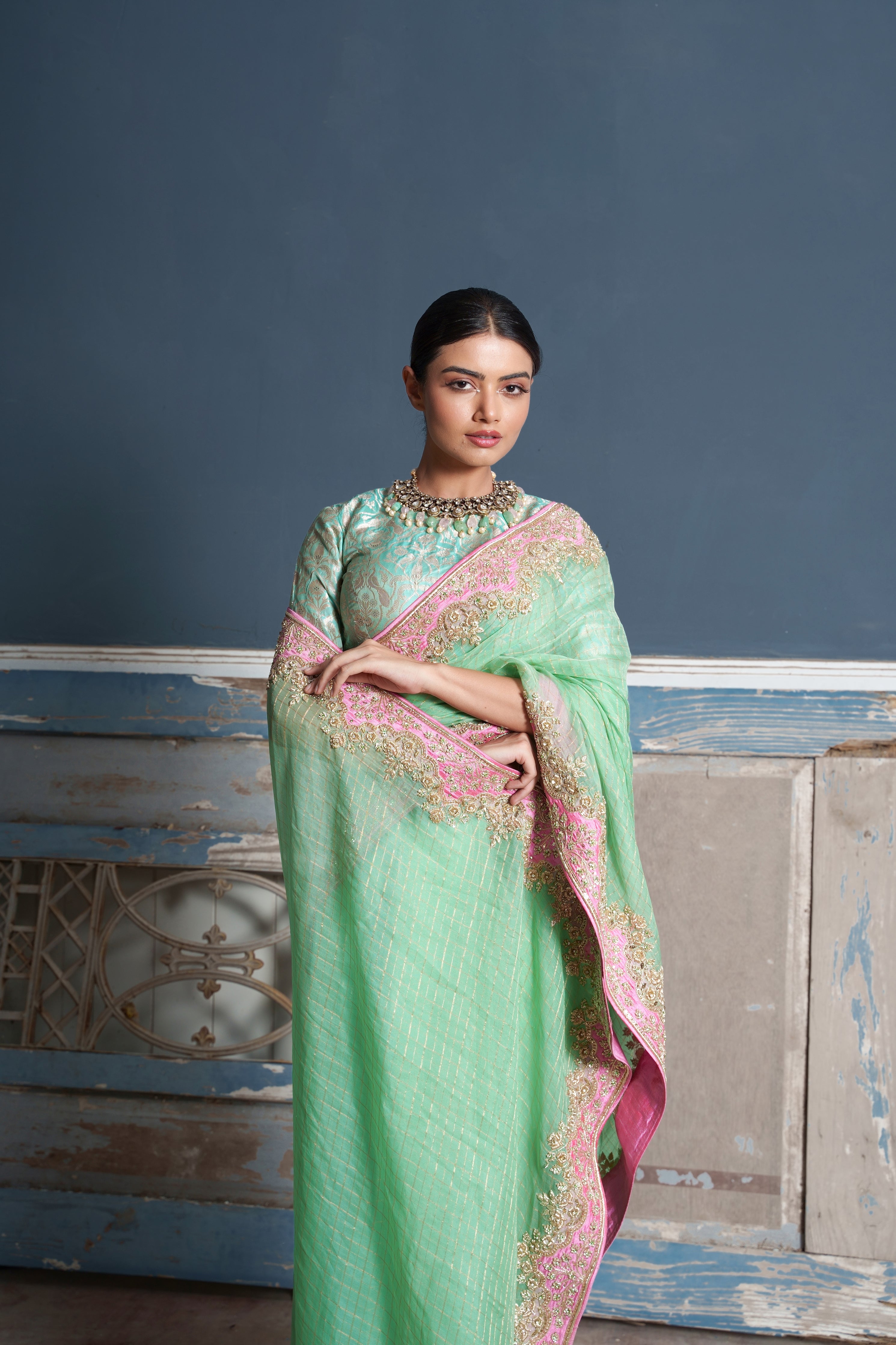 Tara -Jade Green Raw Silk Embroidered Saree with Banaras Blouse