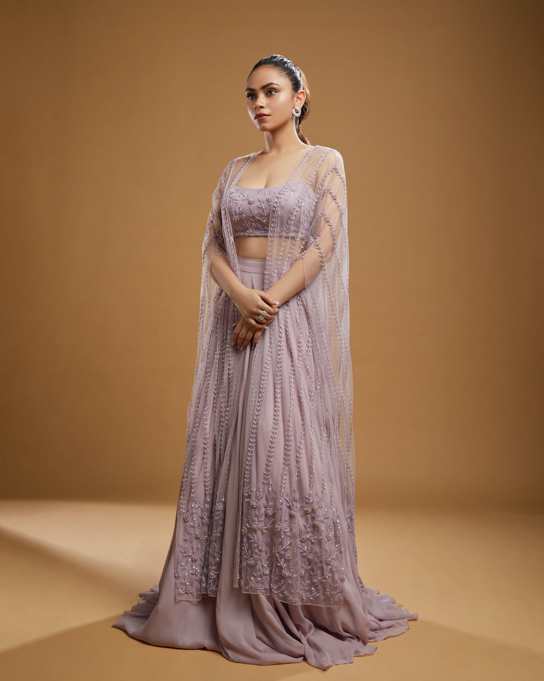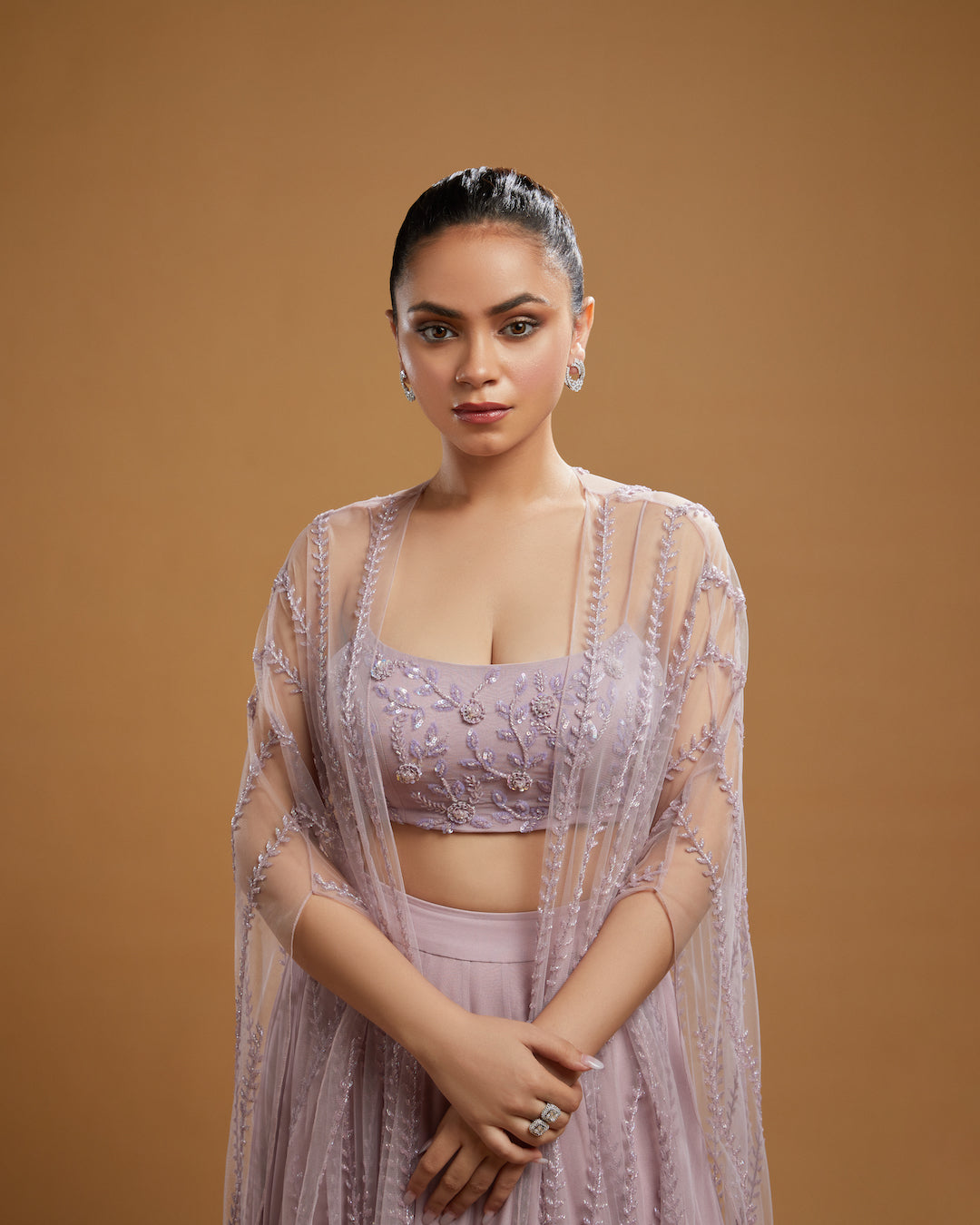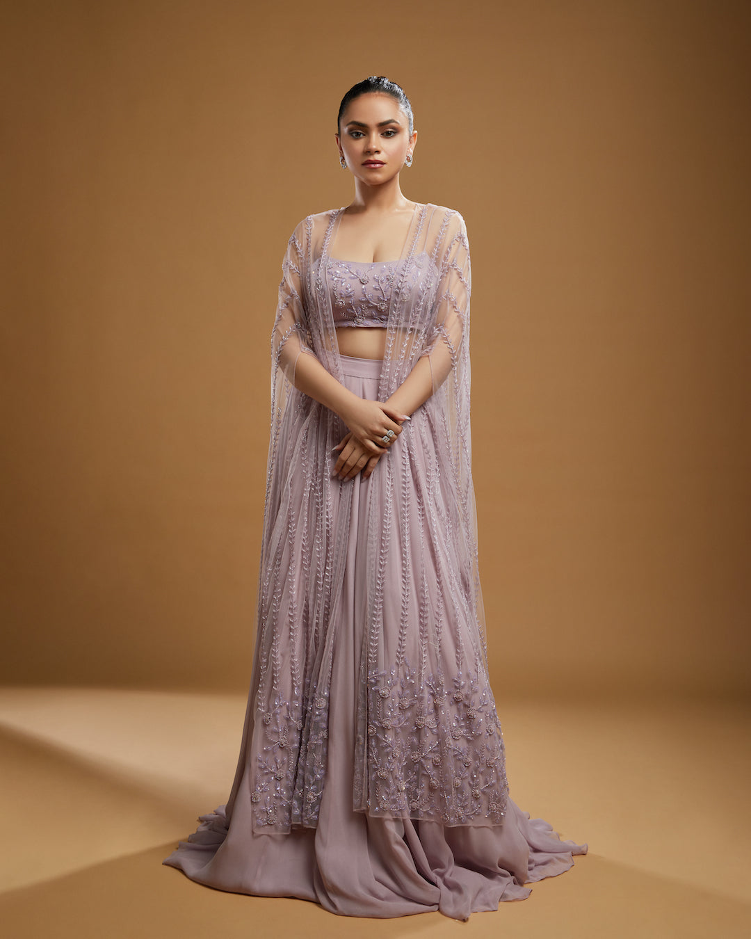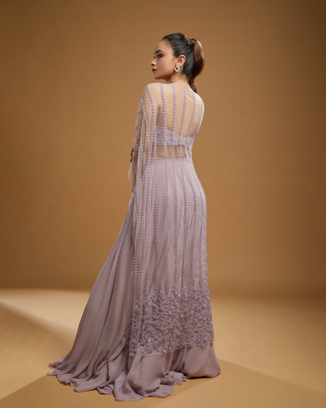 Tasmin is our lavender cape - jacket lehenga set embellished with floral & line work with glass beads & sequins on the cape - jacket & blouse over a net & georgette base. Paired with a fluid georgette skirt.