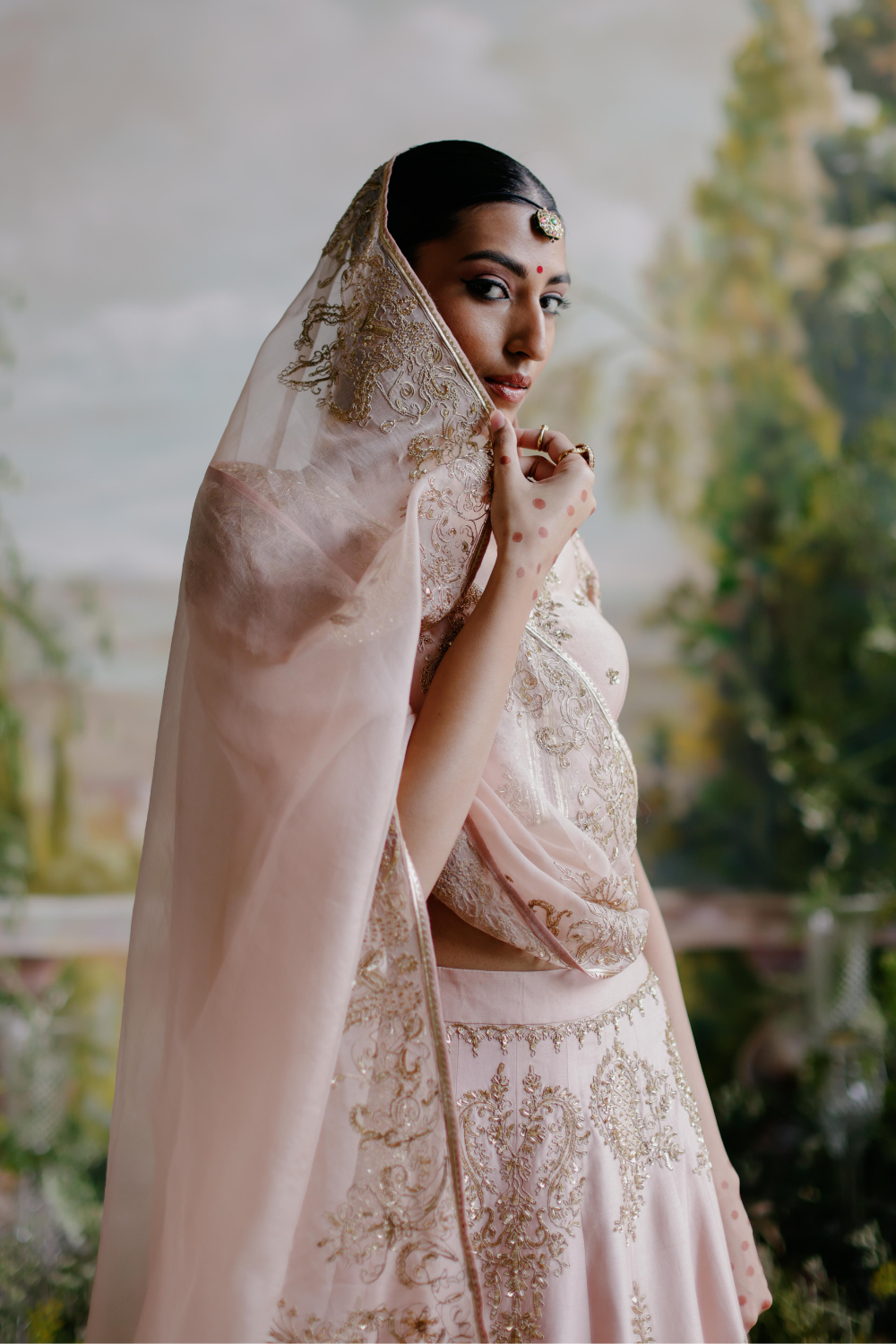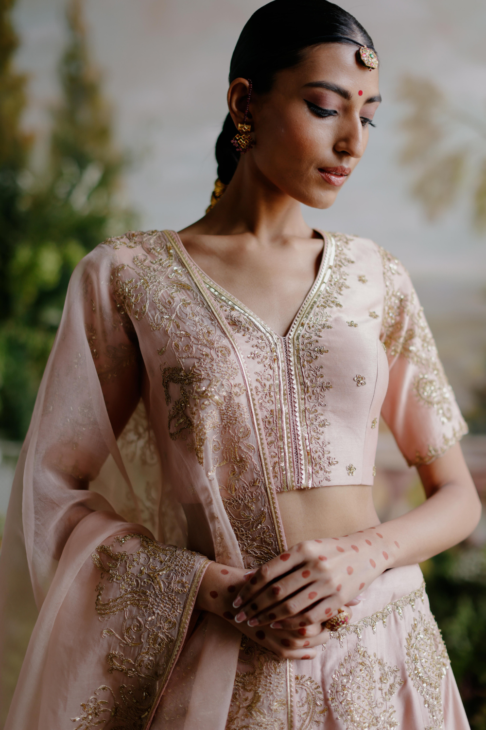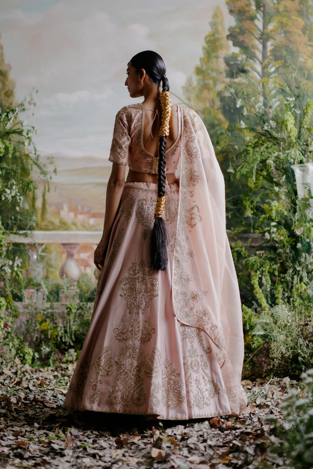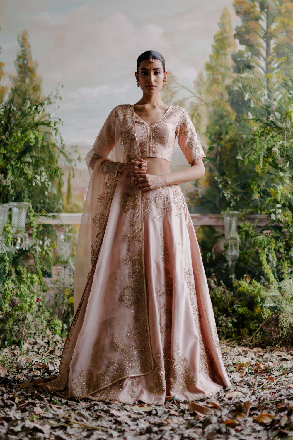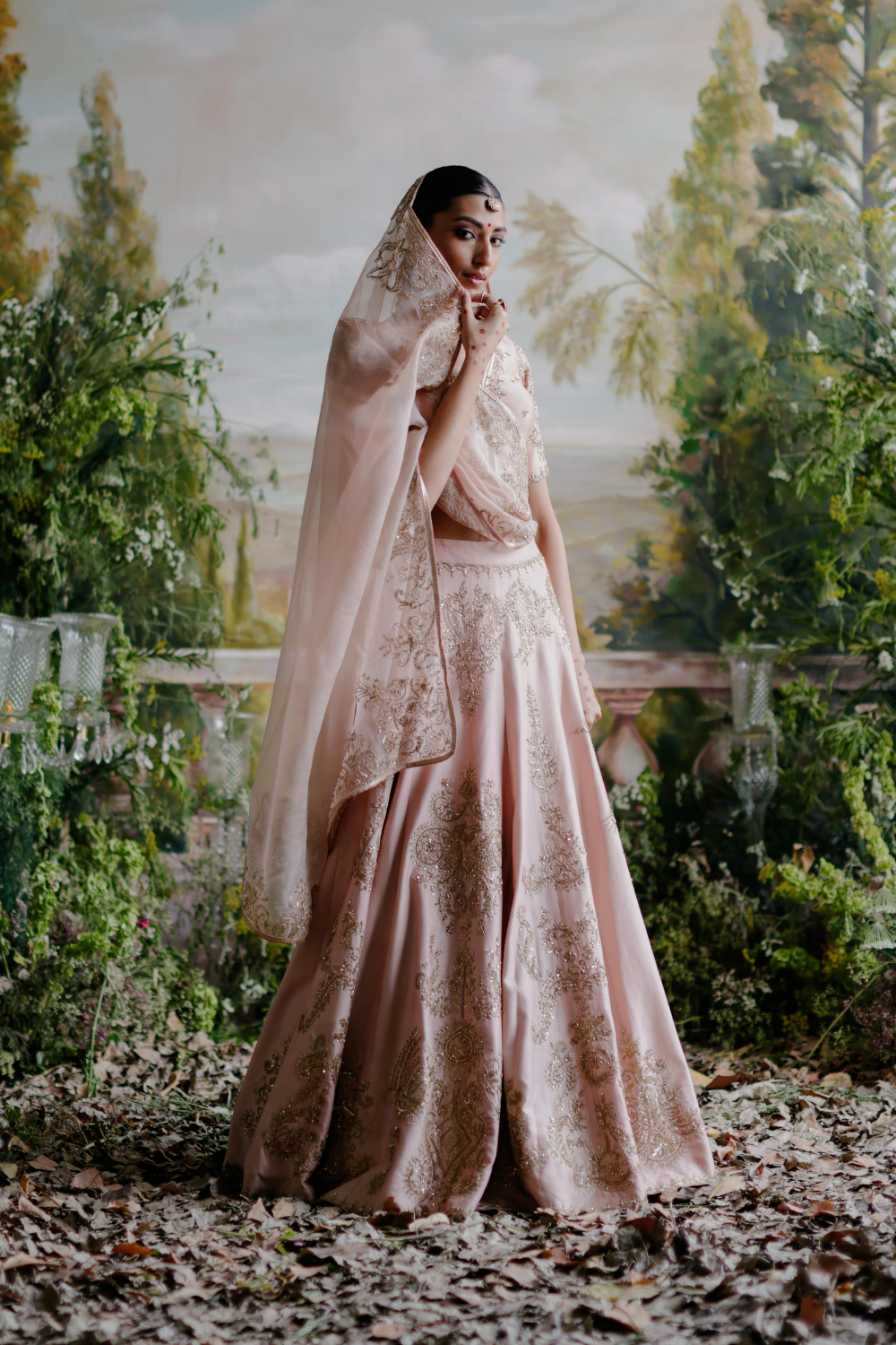 Featuring a blush pink chanderi lehenga set paired with an organza base dupatta with antique gold dori and aari embroidery.