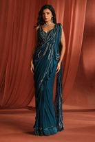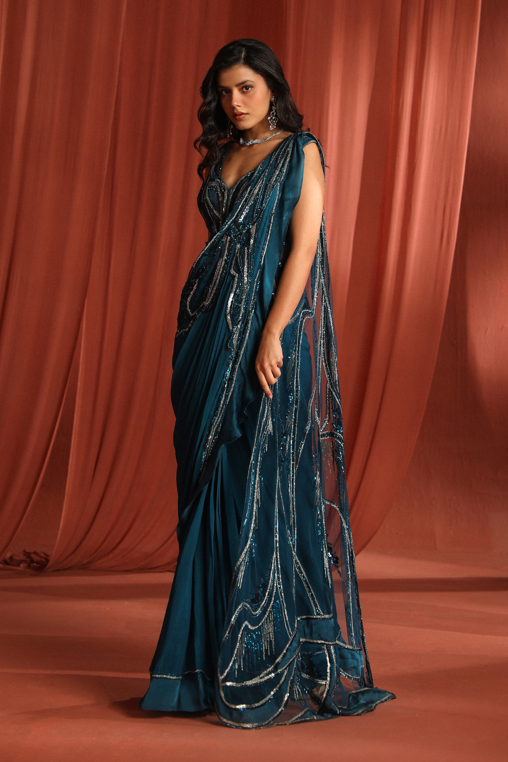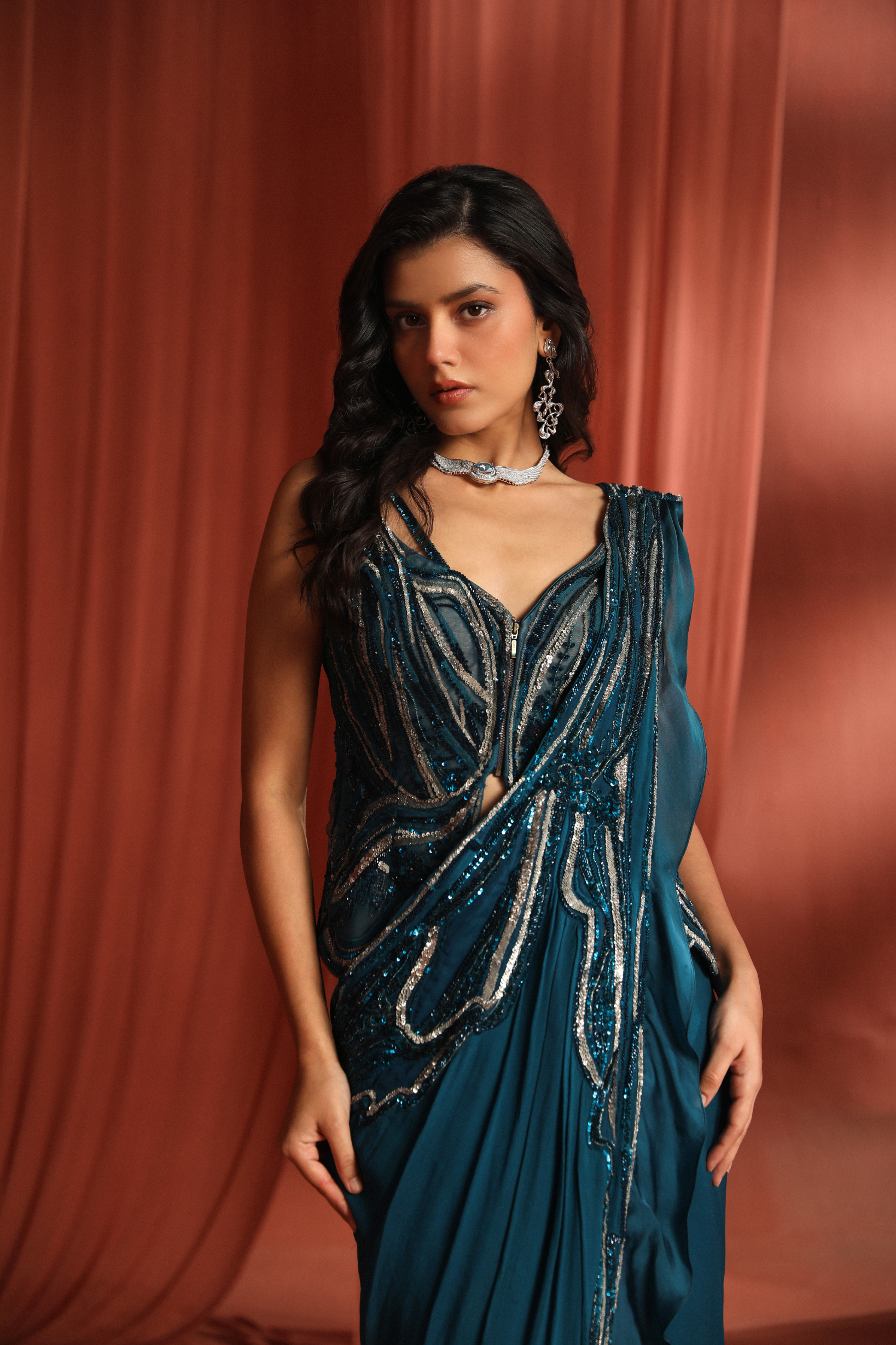 This teal saree features a striking play of lines with fabric bindings and delicate floral motifs, creating a refined, contemporary design. The palla continues the theme with a blend of lines and floral patterns, while the modern jacket-style blouse adds an elegant, fashion-forward touch. Perfect for those seeking a balance of tradition and trend, this ensemble exudes sophistication and grace.