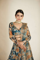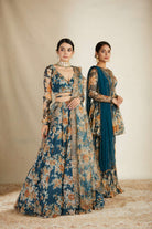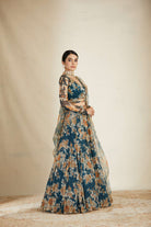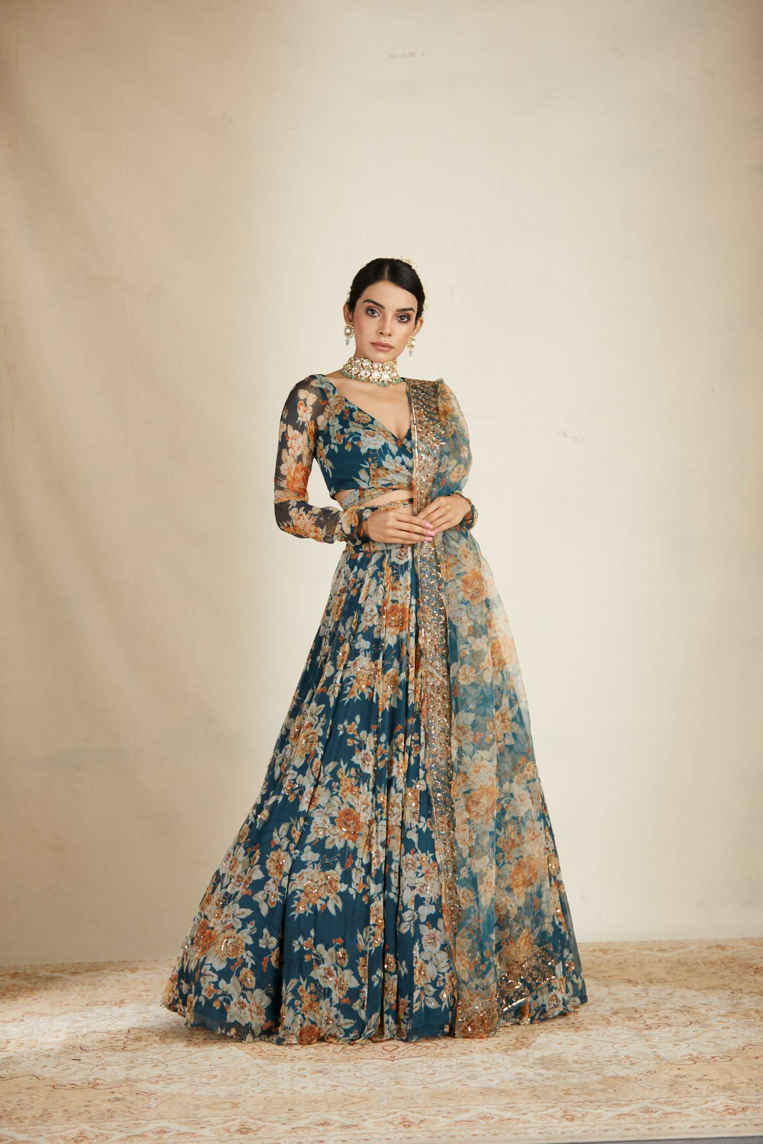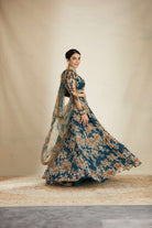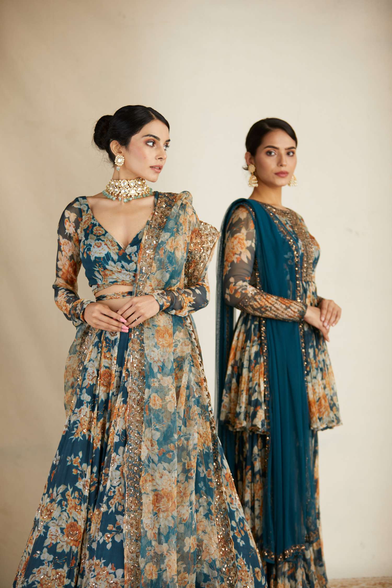Featuring a Teal Blue Floral Lehenga Set in Chiffon.