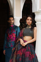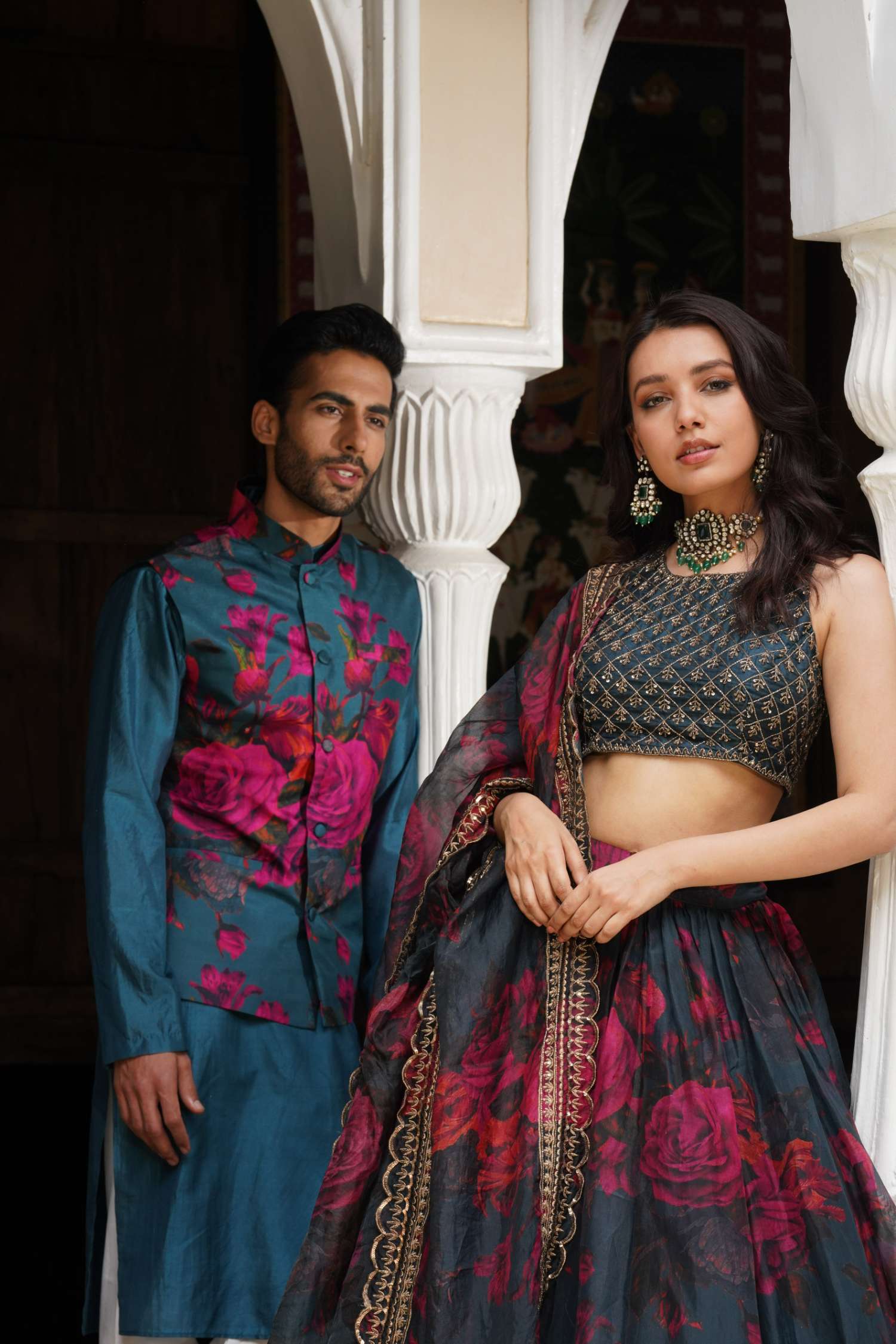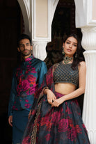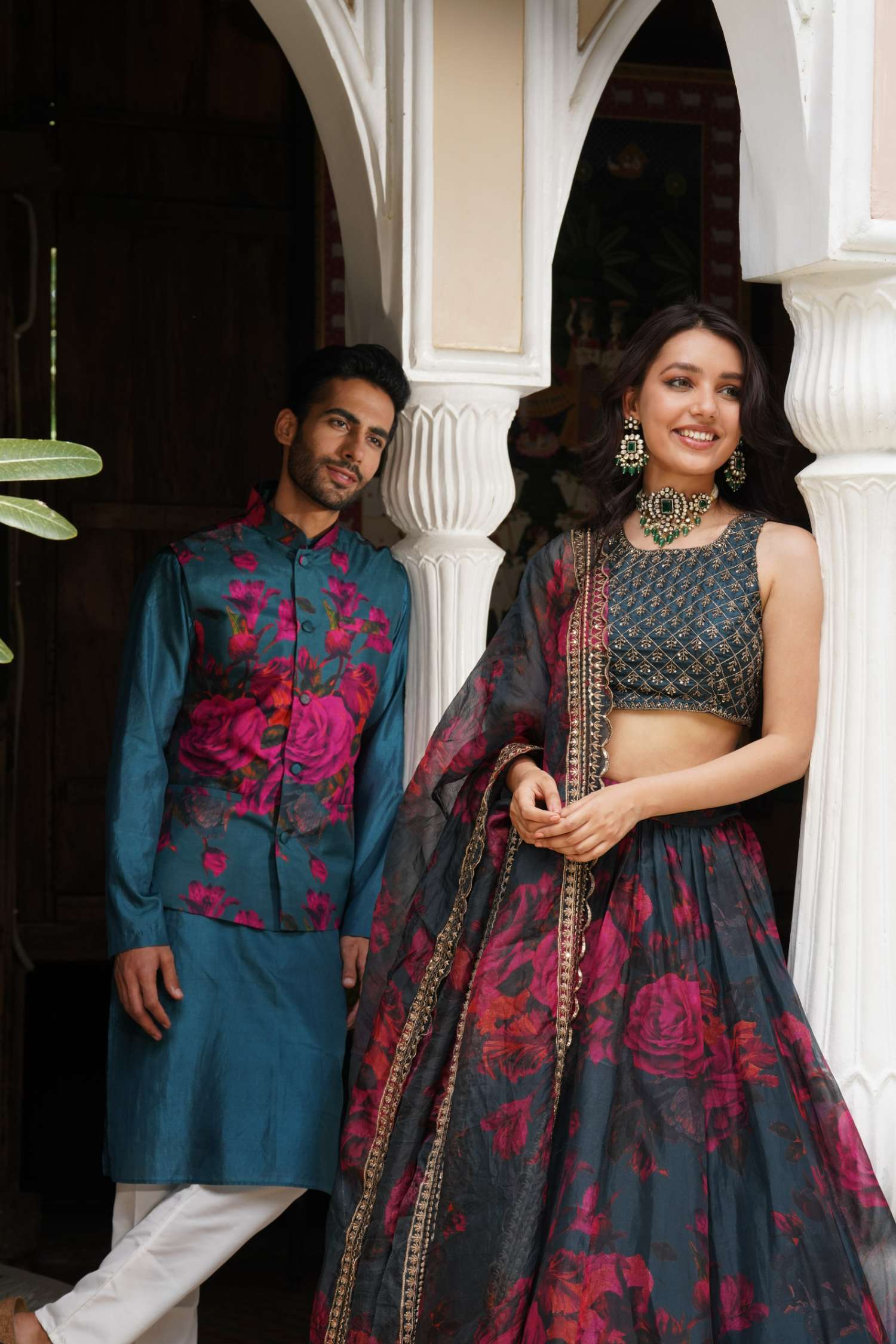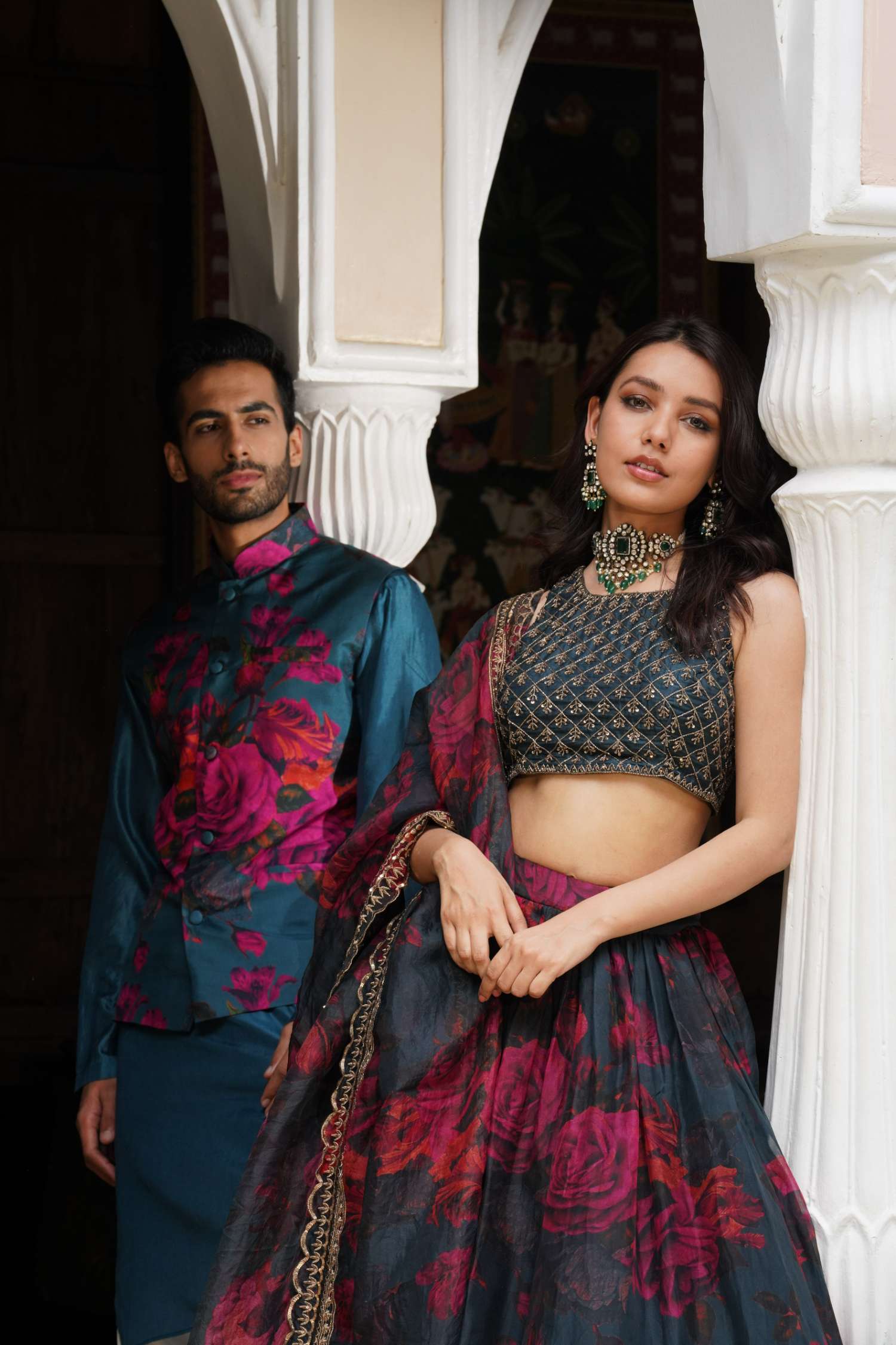 Featuring a Teal Blue Floral Lehenga Set in Organza.