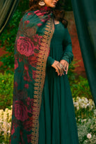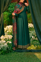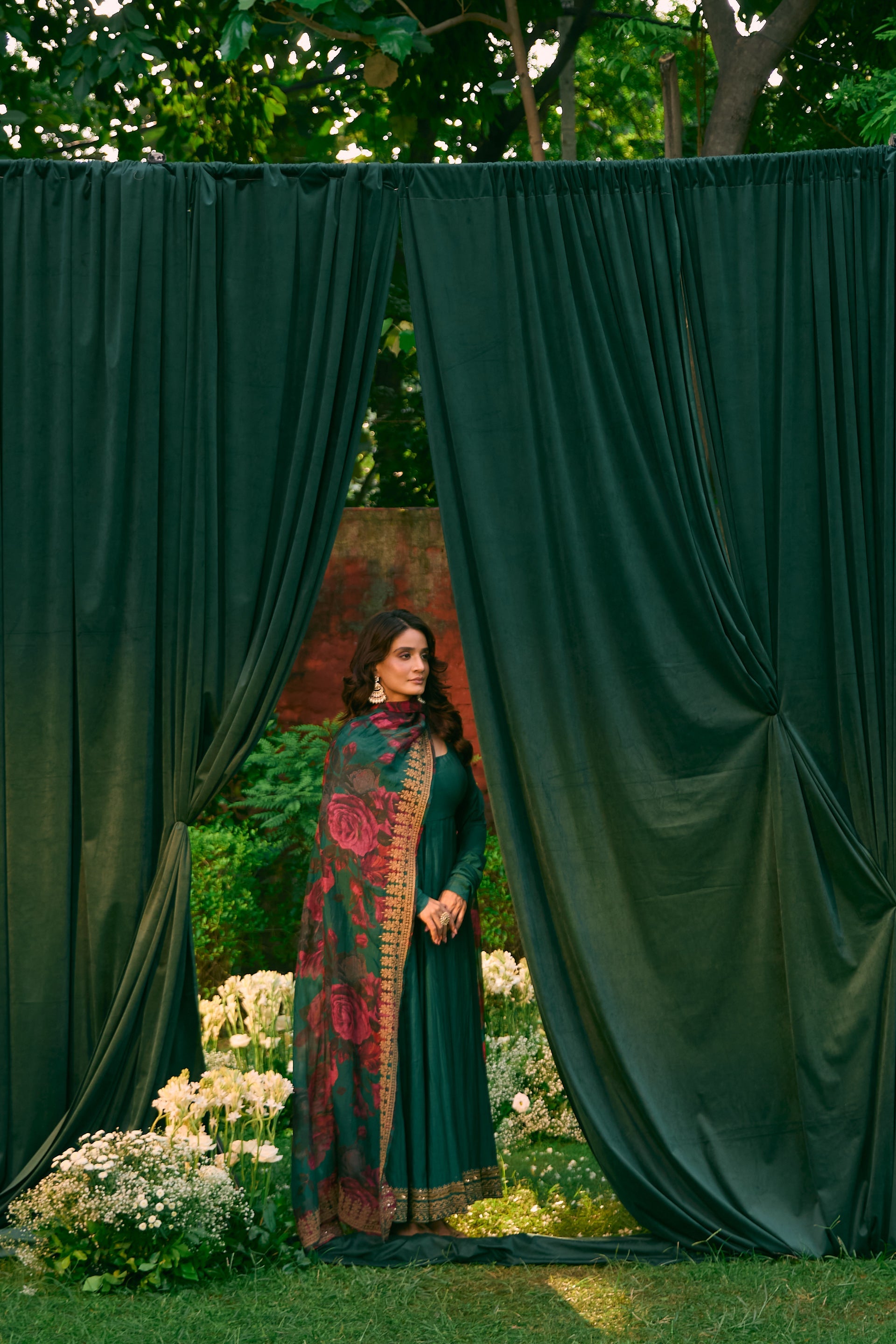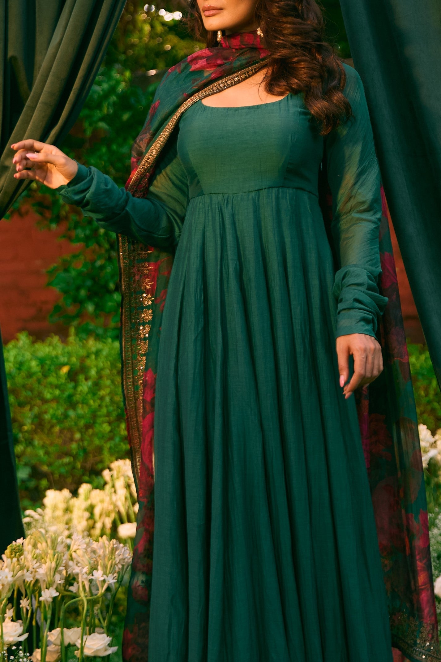 Featuring a Teal Green Anarkali with Floral Organza dupatta set in Chanderi Silk set.