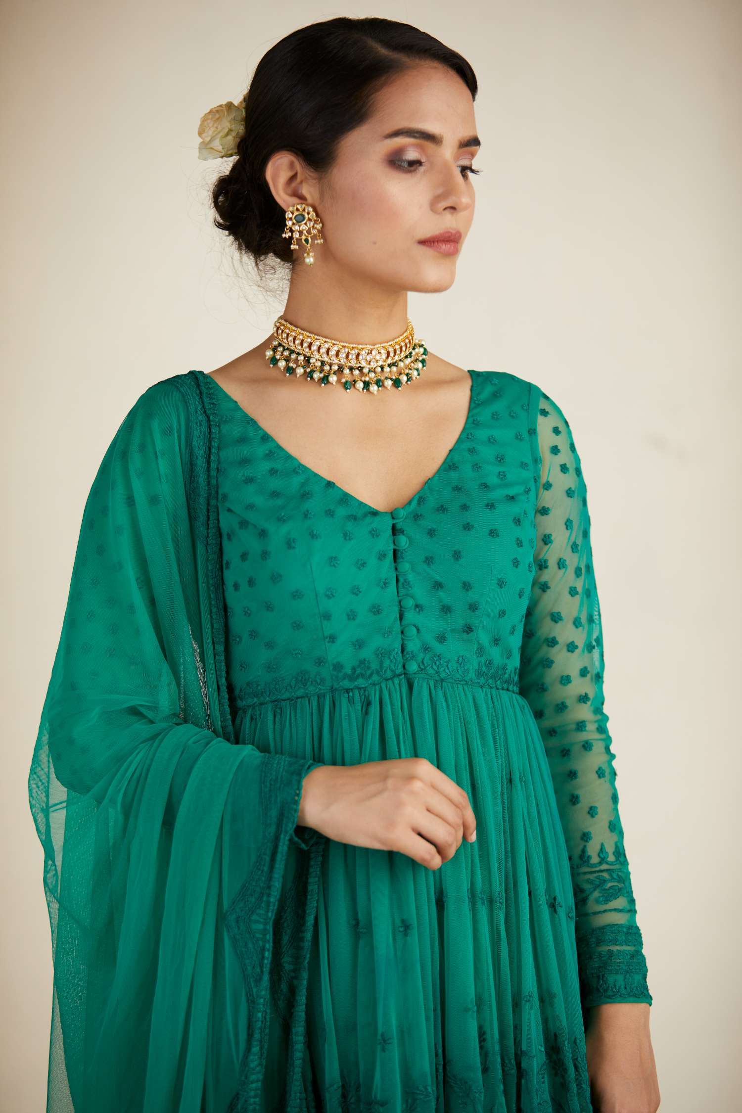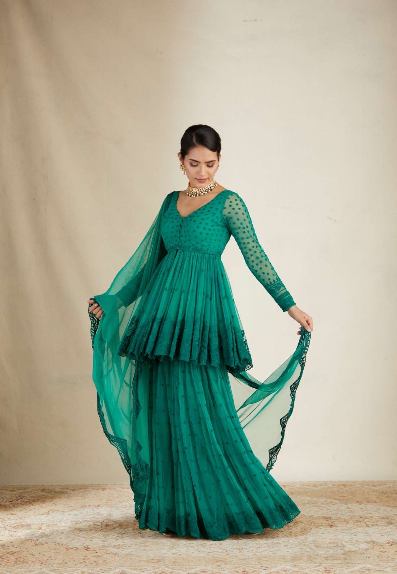 Featuring a Teal Green Peplum Thread work Sharara Set in Net.