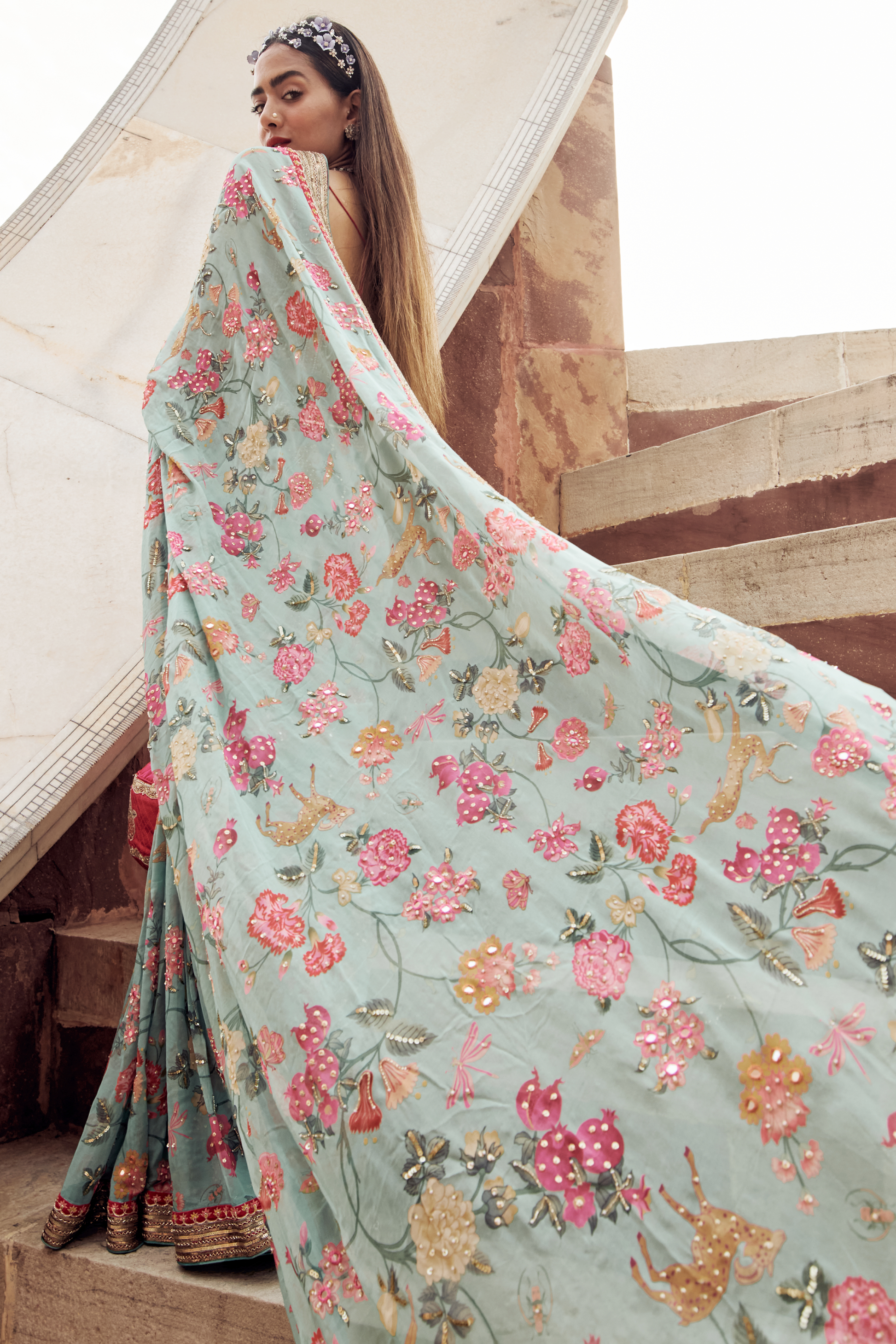 The Indie Electric looks stunning in jungle print hand–highlighted saree in light blue with a heavy embroidered border paired with a hand–embroidered blouse embellished with sequins, moti, cutdana, resham and dabka work.