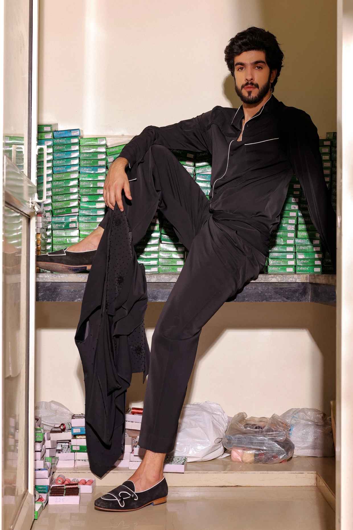 Presenting a classic black ensemble featuring a tailored shirt trousers with an attached cummerbund and a shacket with an elegant drape element bringing a touch of drama and fluidity