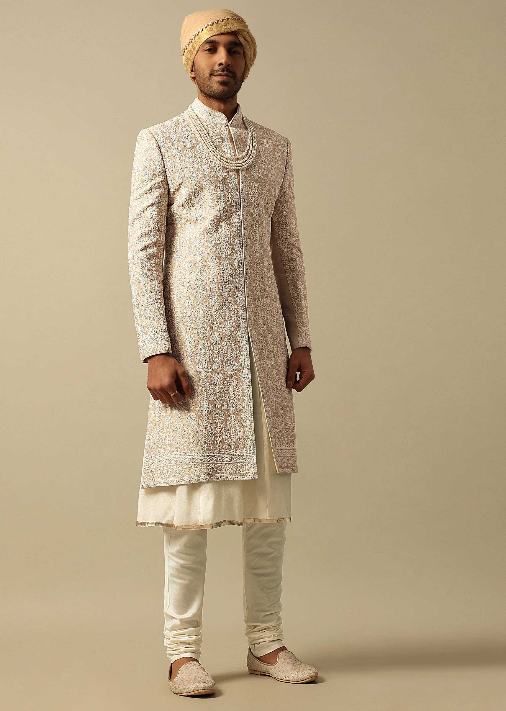 - Step into your wedding day with grace in our Beige Banarasi Silk Sherwani.