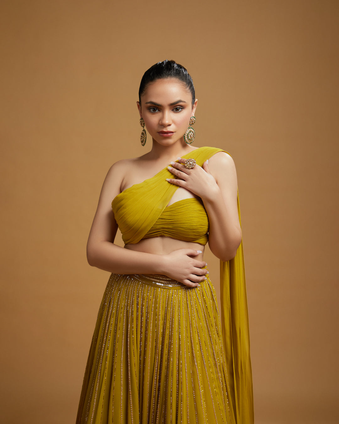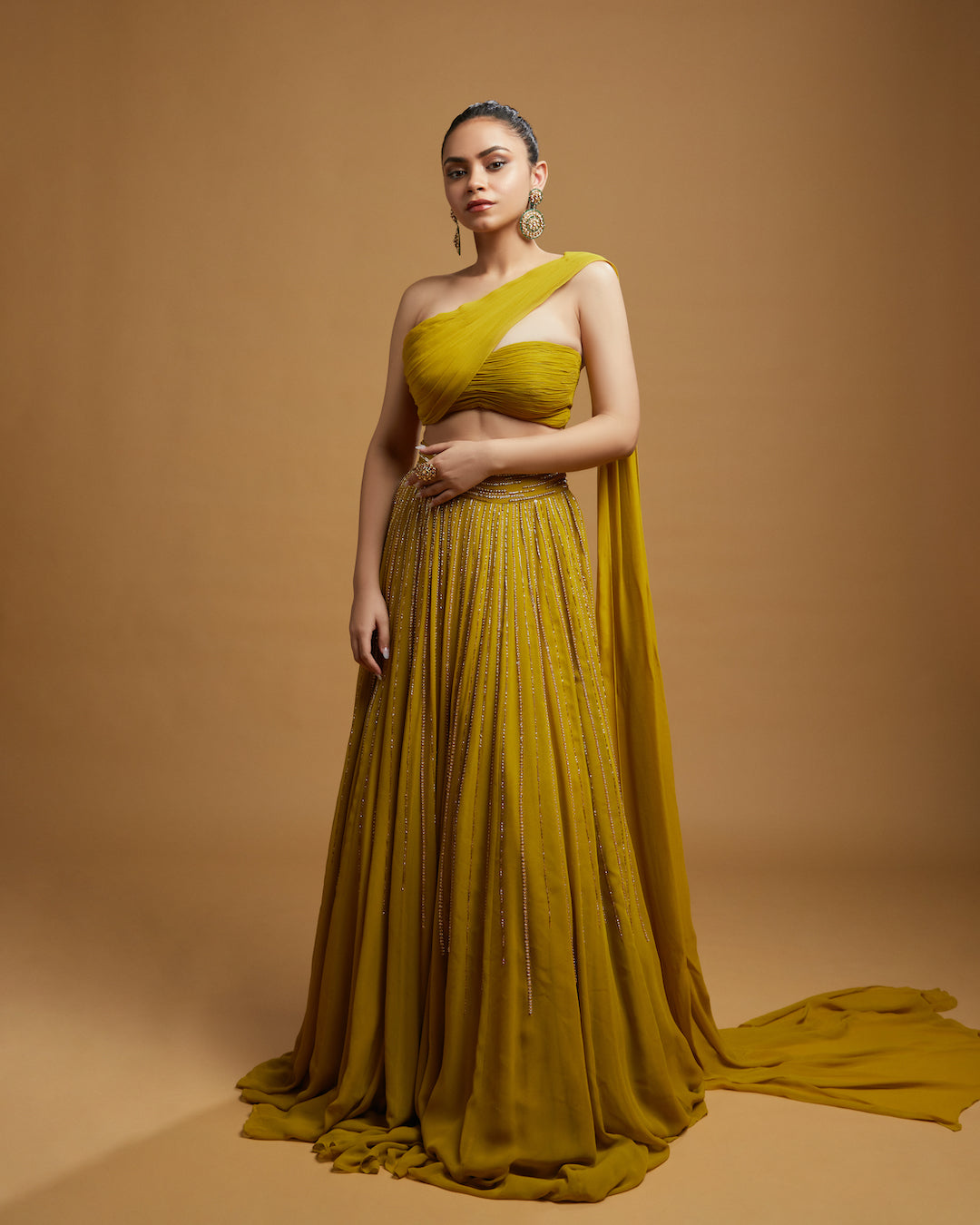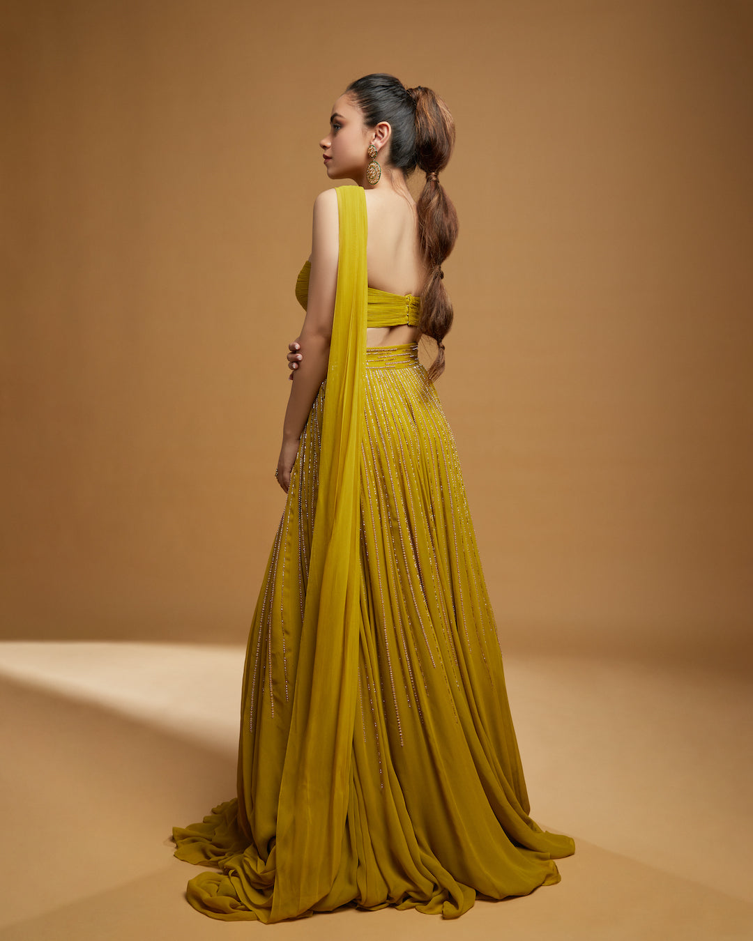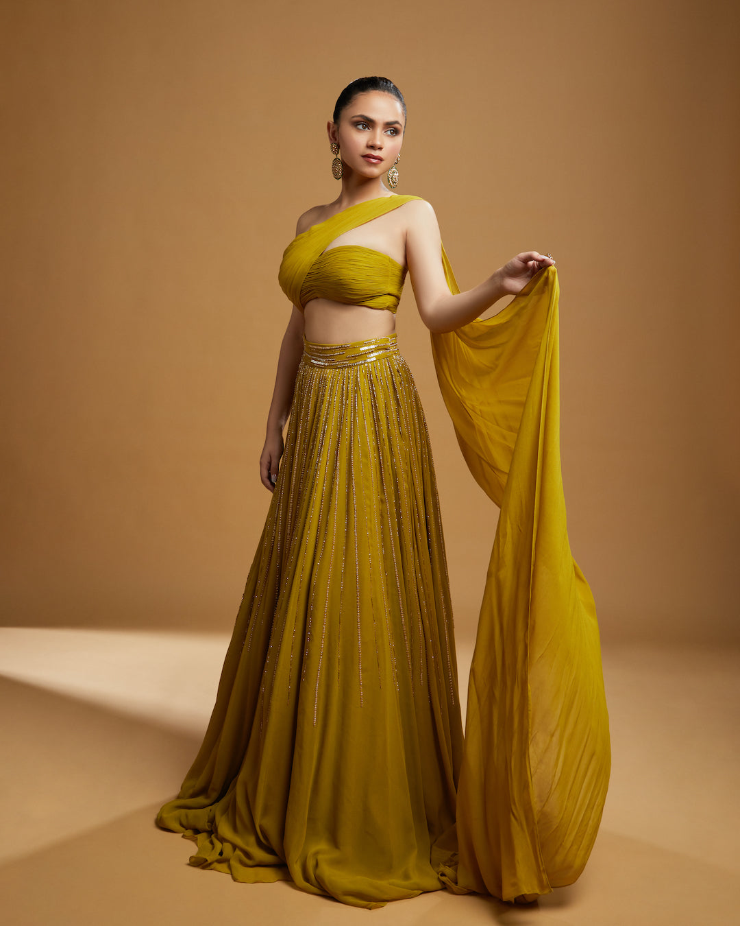 Tish is our Cress green lehenga set with a georgette ruched tube blouse attached with a long drape & a skirt embellished with line work done with champagne sequins and glass beads.