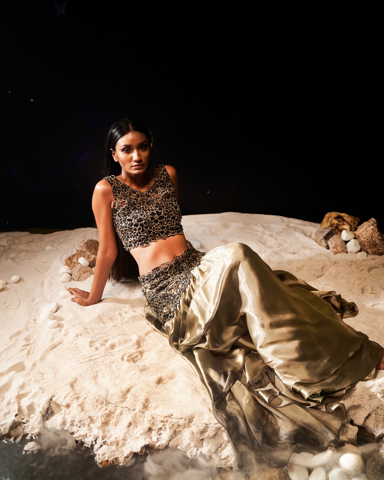 Traksh/Noor-Nakshatra Dusty Brown Mettalic Organza High Low Crop Top and Skirt Set