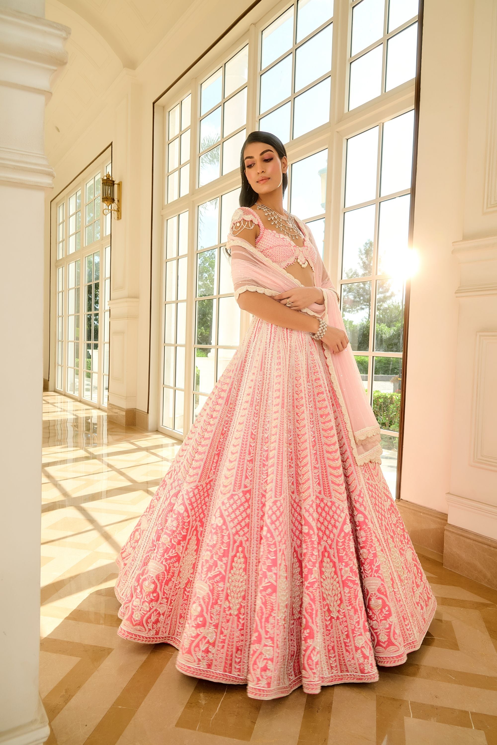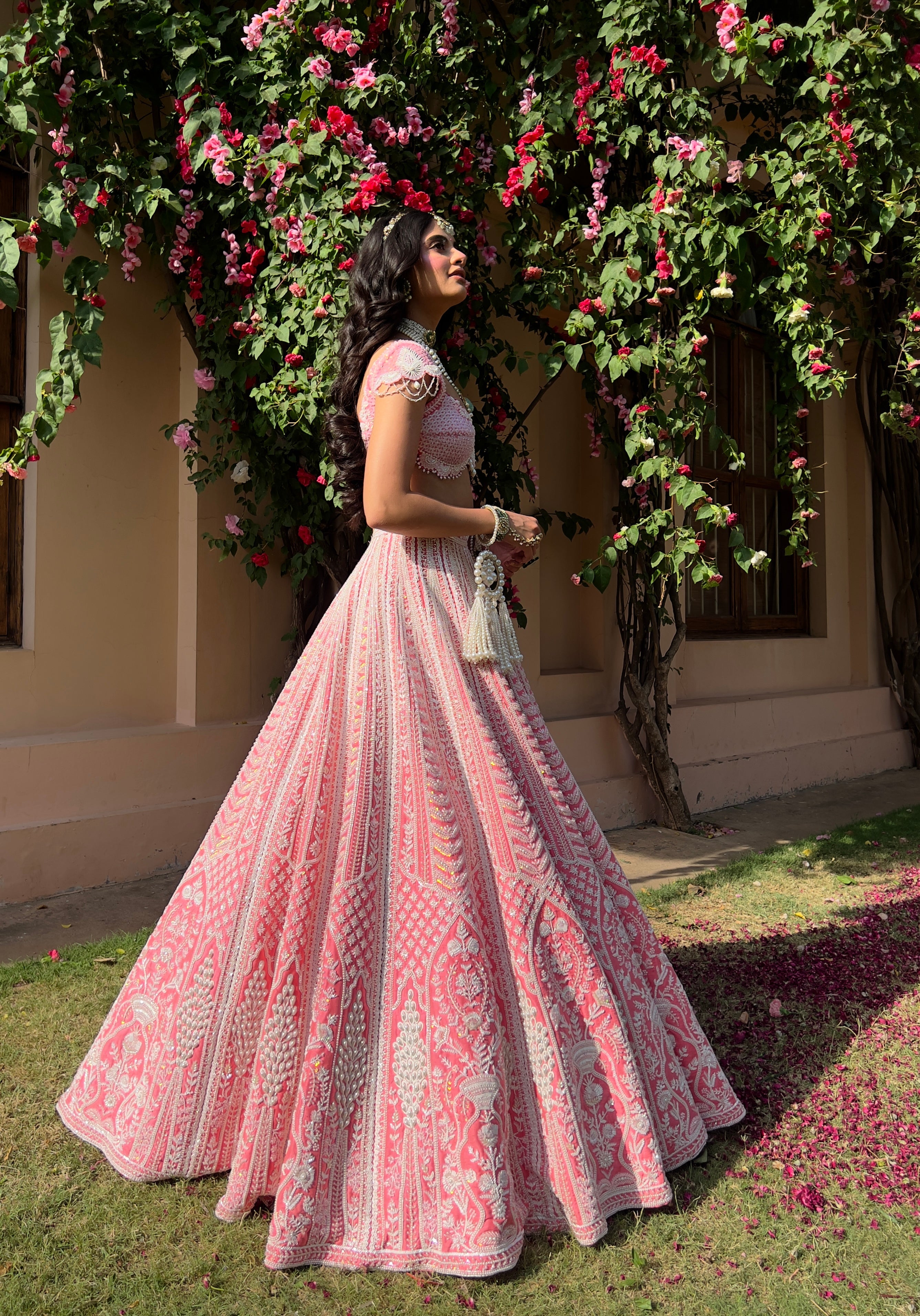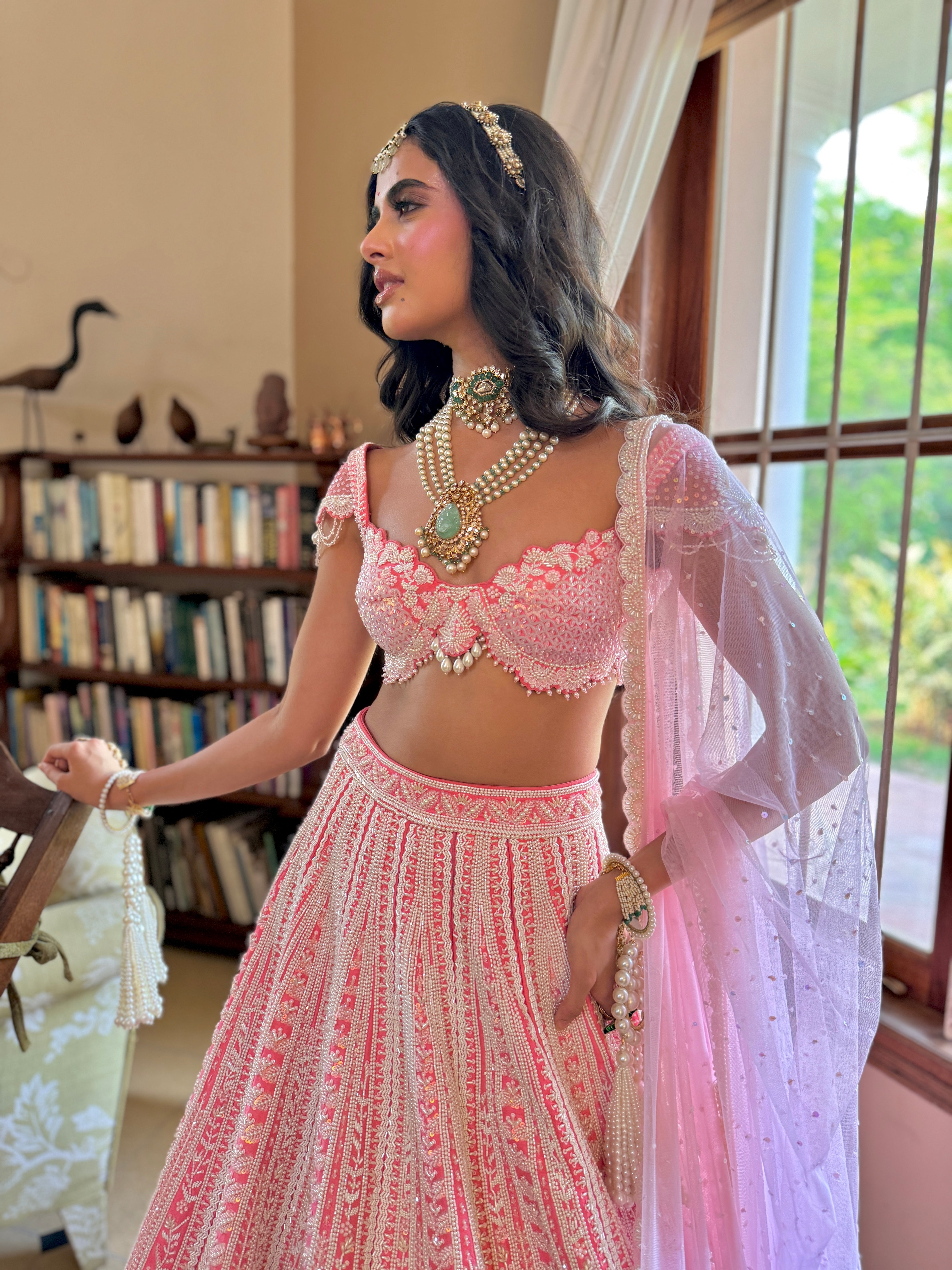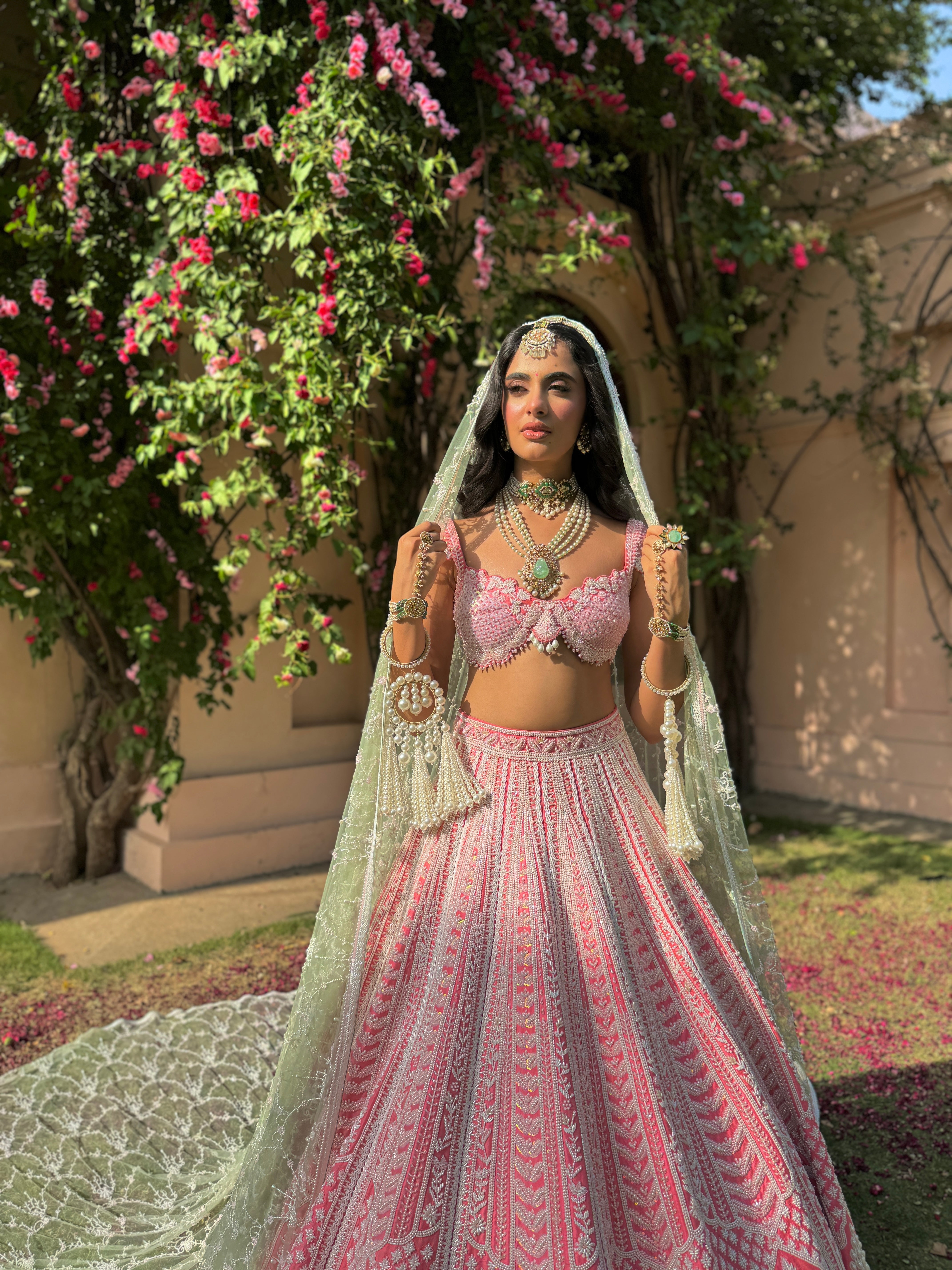 The Tulika Lehenga showcases a graceful tapered silhouette, adorned with exquisite traditional embroidery and floral motifs. Paired with a light pink holographic sequin blouse and elegant tasseled cap sleeves, this lehenga exudes a perfect blend of tradition and modern charm, making it a standout choice for special occasions.
