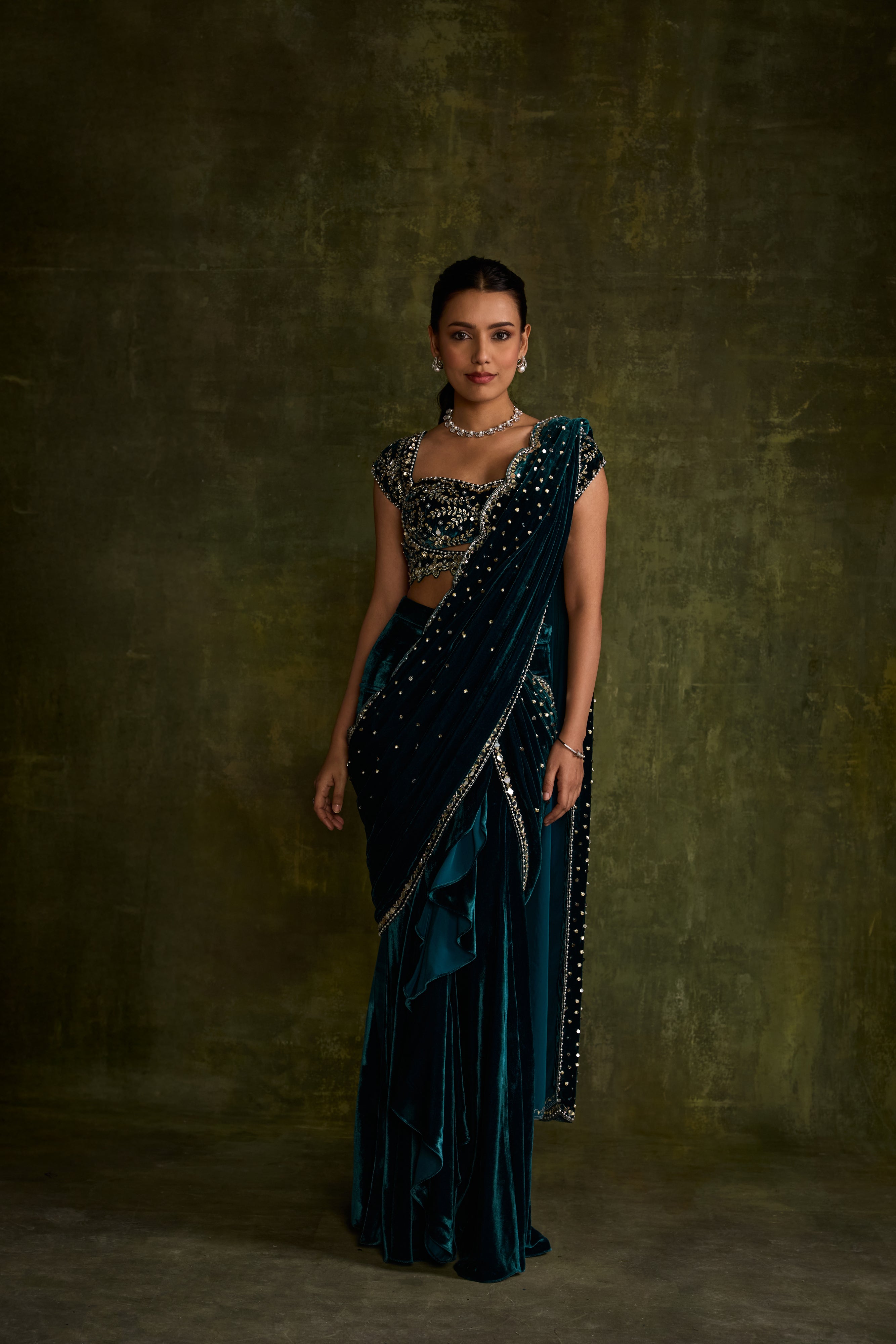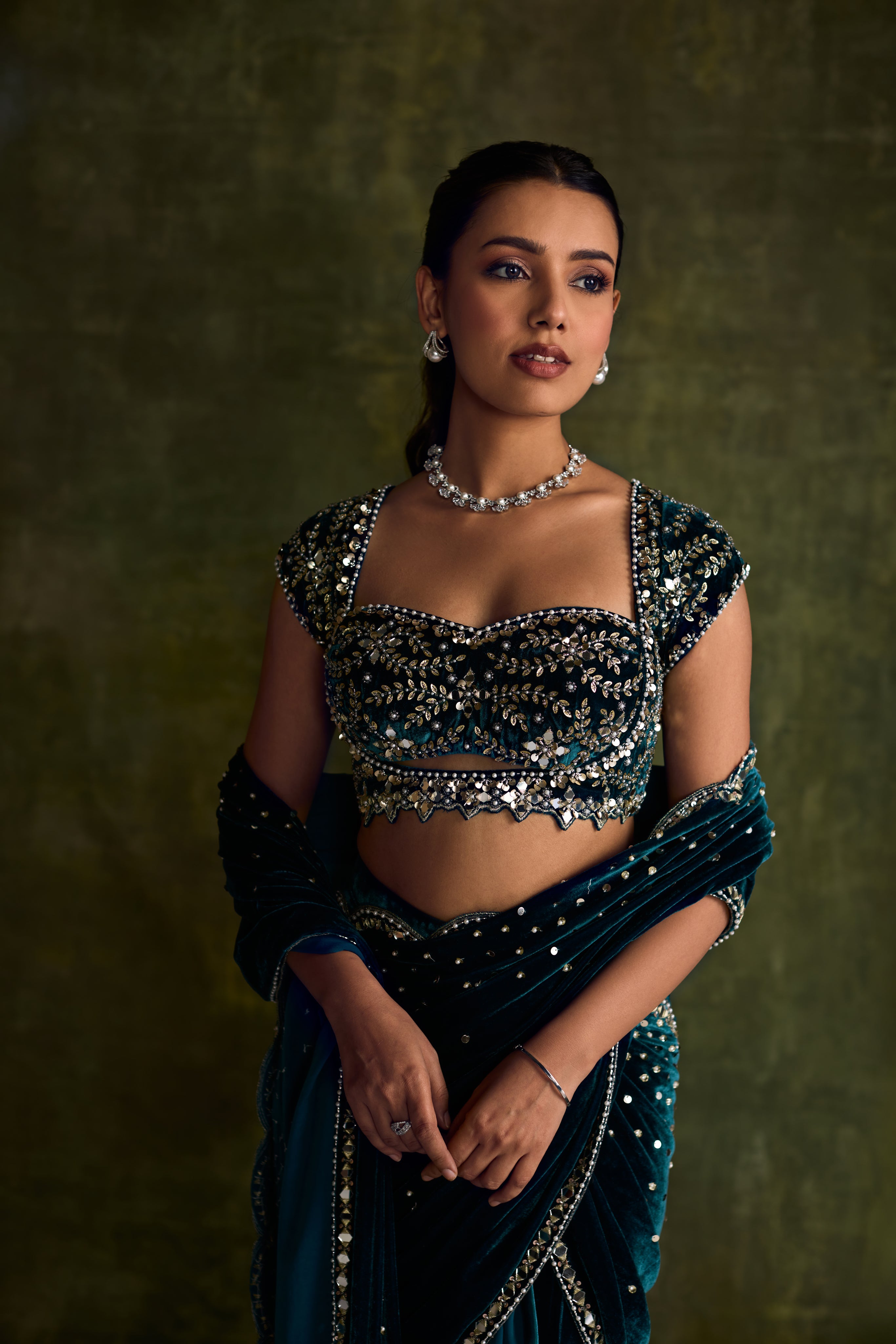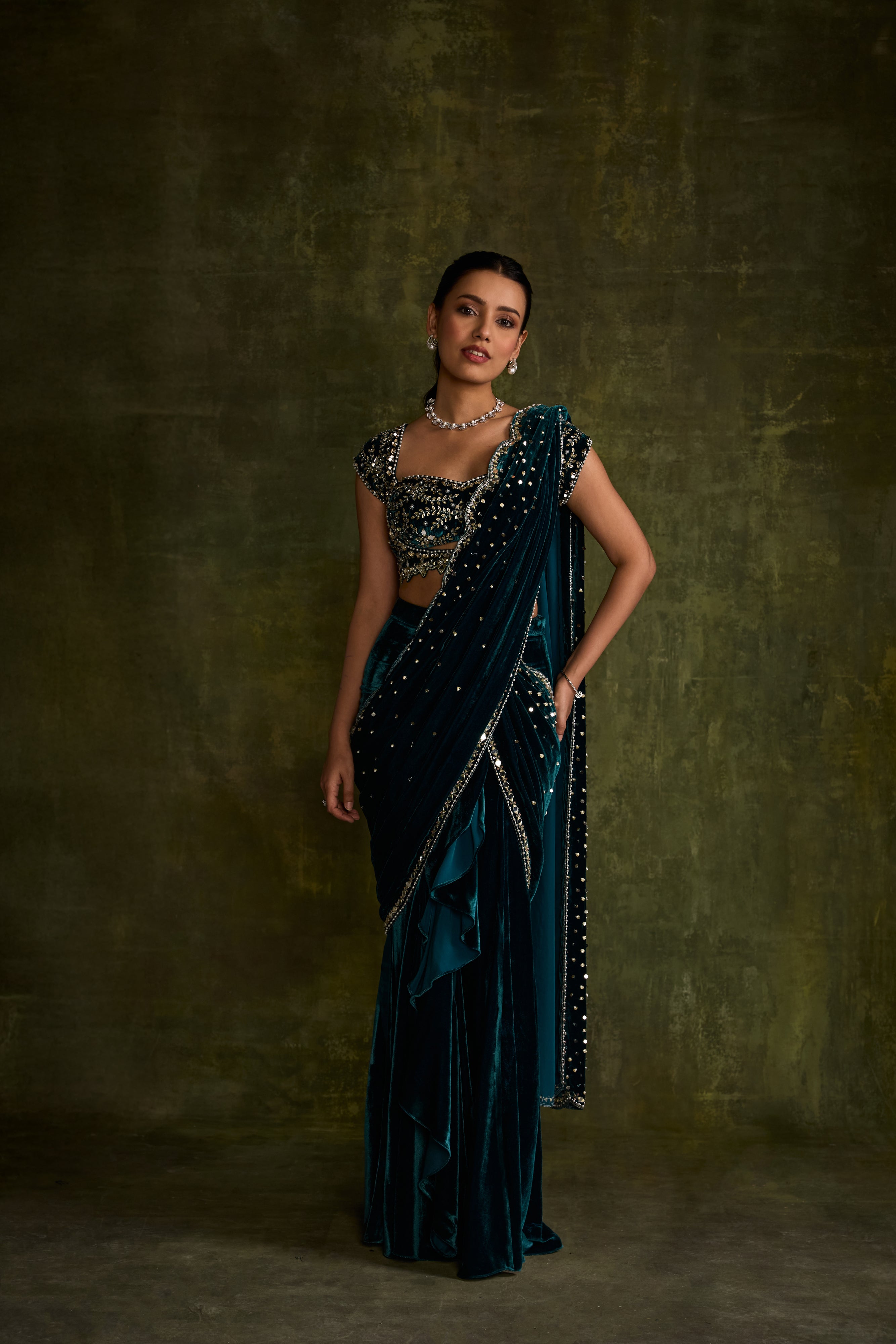 Turquoise Teal silk velvet pre-draped hand embroidered saree with scallop mirror borders at the palla. The blouse is our bestselling cut-out detail blouse.