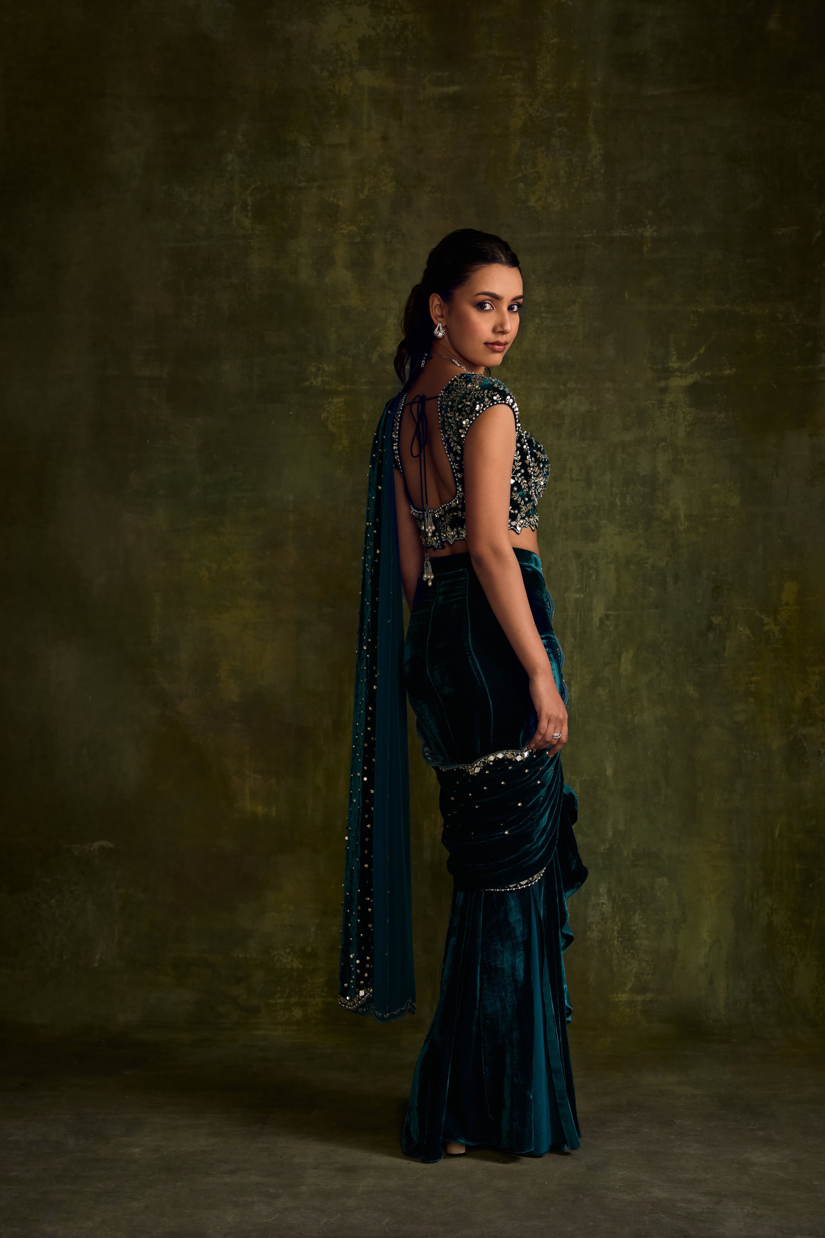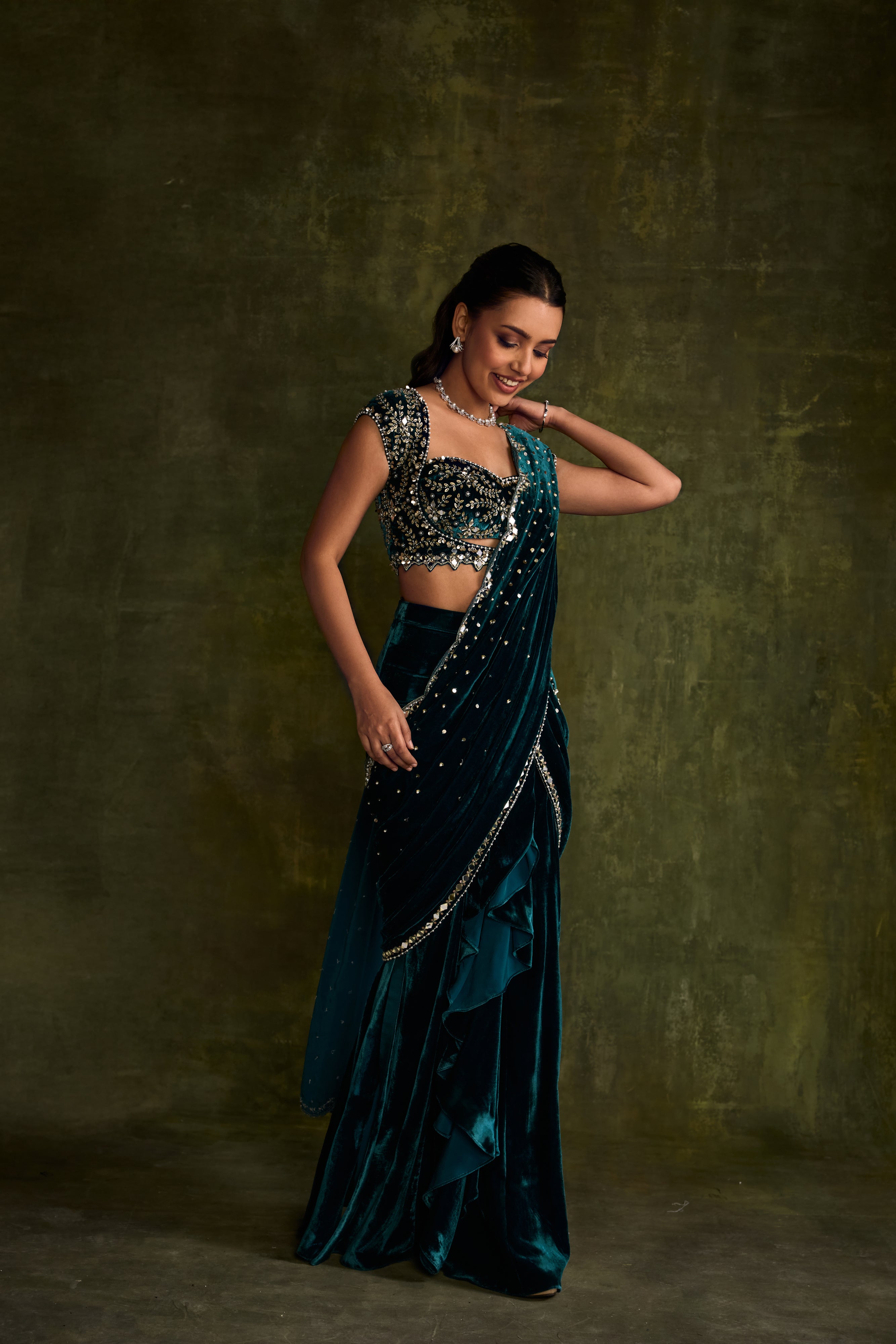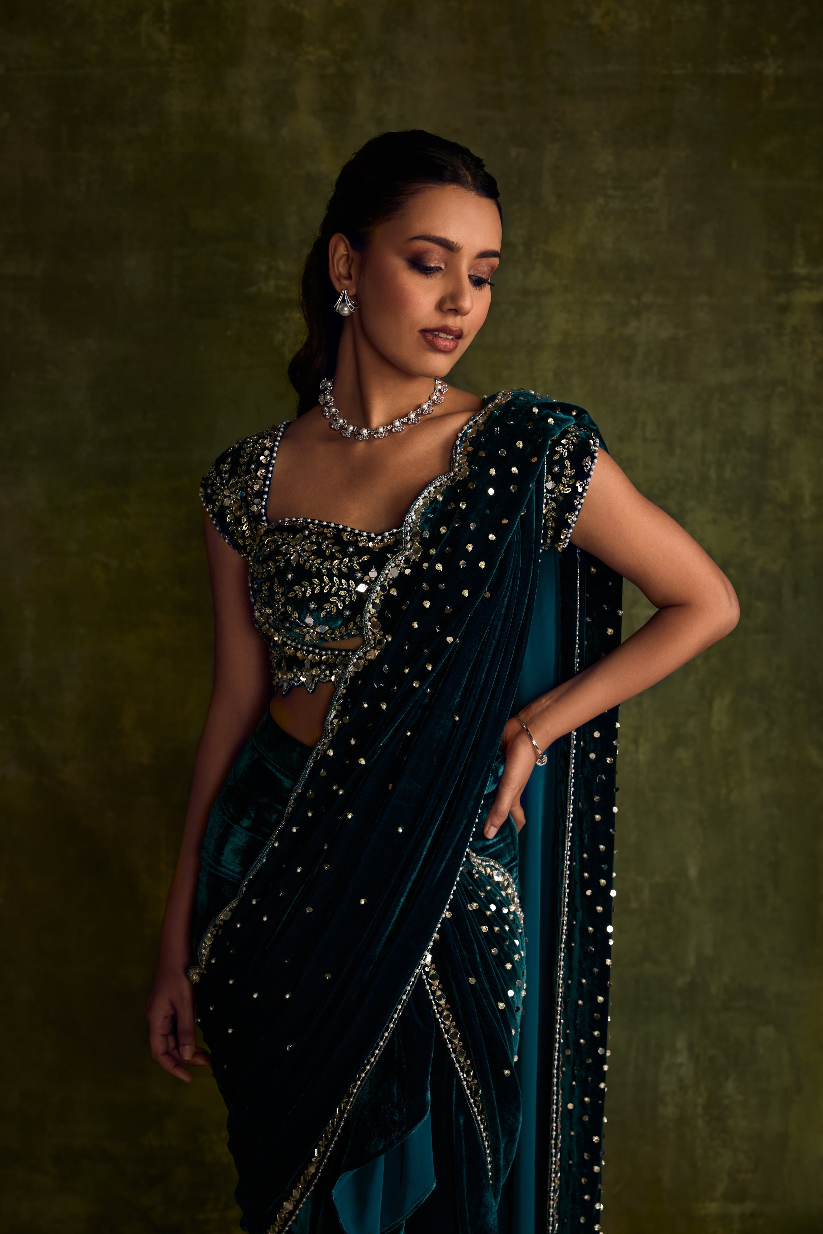 Turquoise Teal silk velvet pre-draped hand embroidered saree with scallop mirror borders at the palla. The blouse is our bestselling cut-out detail blouse.