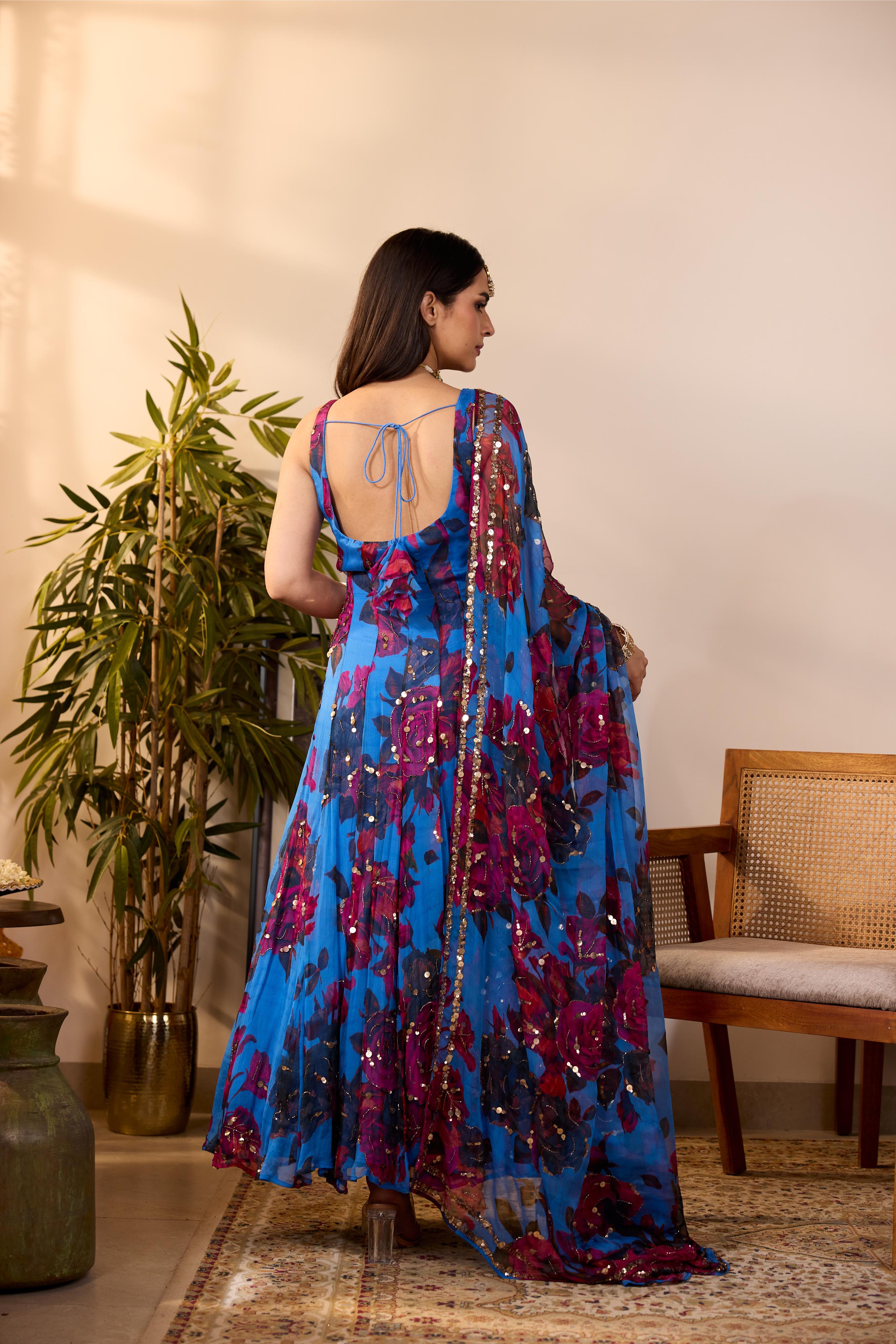 Featuring a Turquise Floral A-Line Anarkali in Chiffon.