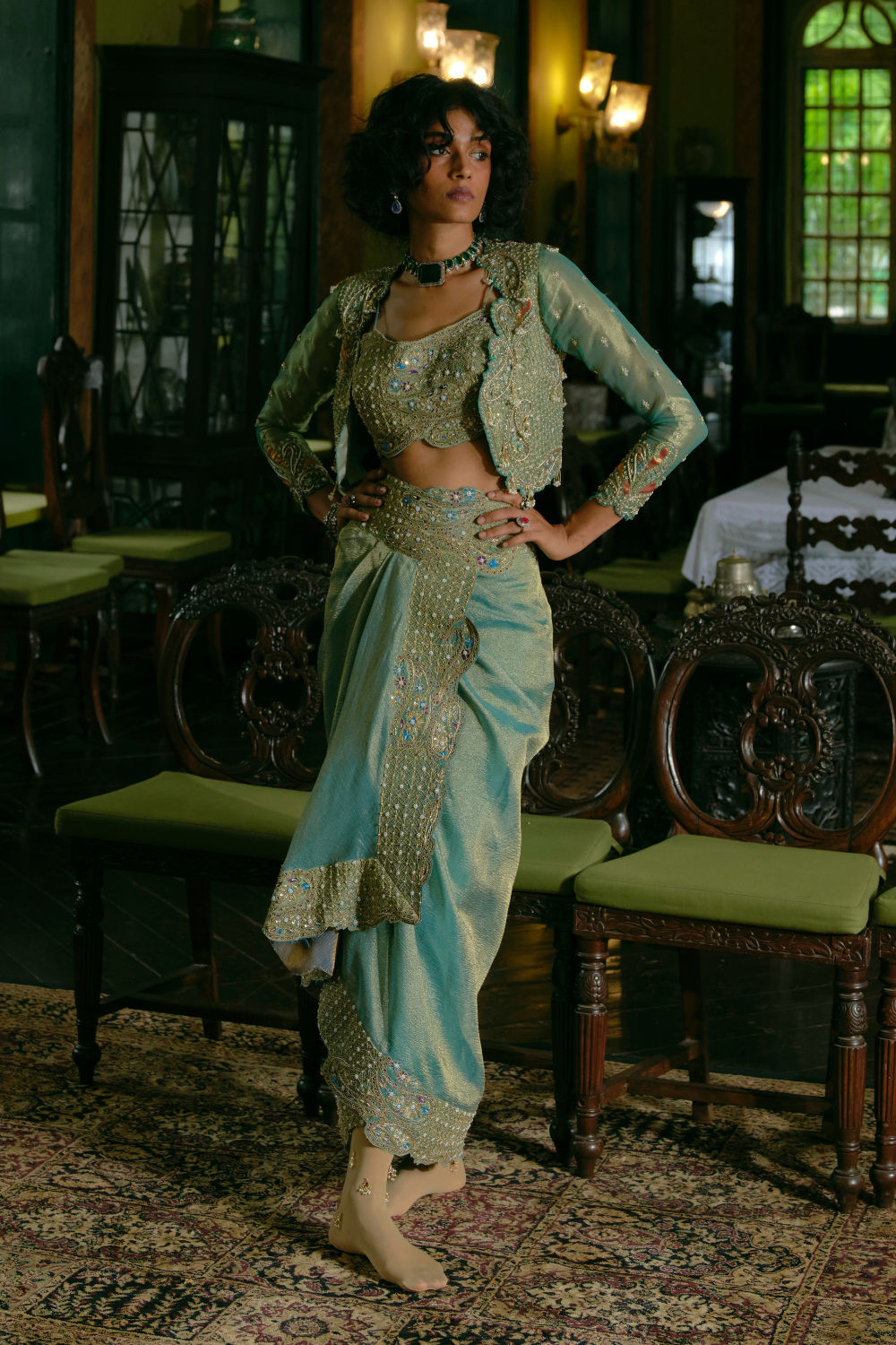 This signature draped skirt set in turquoise silk zari crushed tissue and Jacquard Banarasi features exquisite paisley embroidery and intricate embellishments. It includes an embroidered blouse and a cropped turquoise tissue jacket adorned with paisley embroidery and pearl details.
