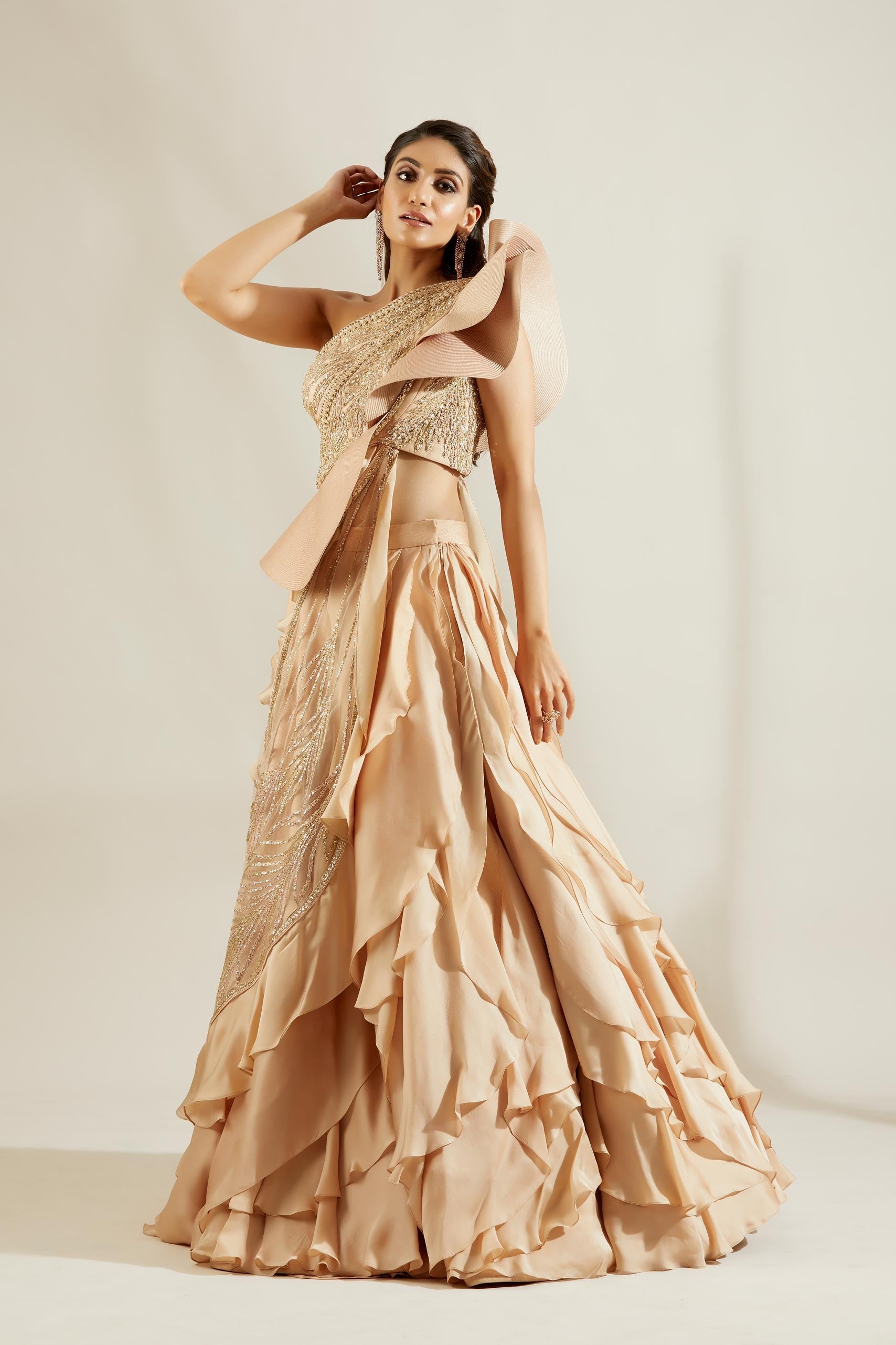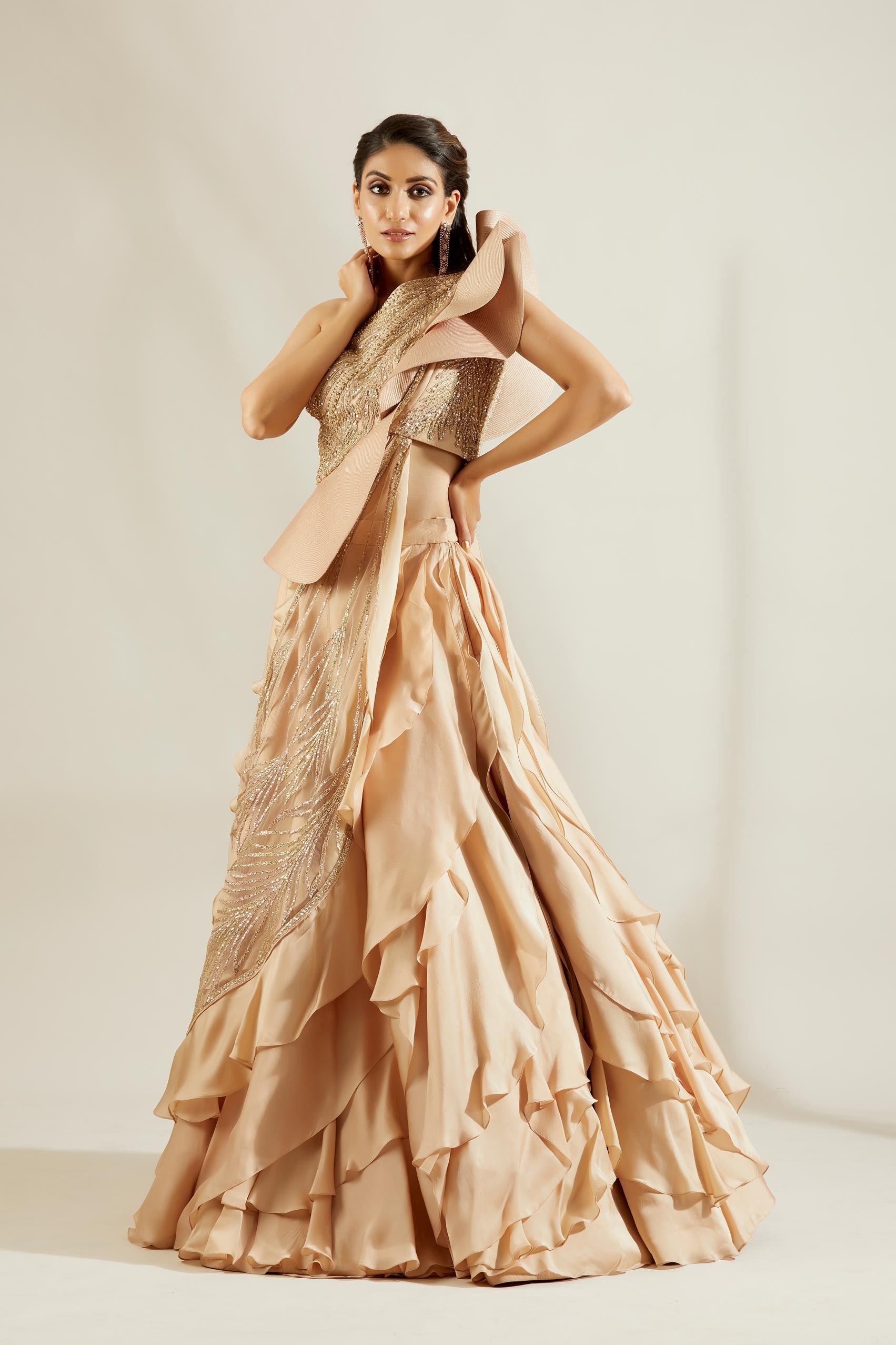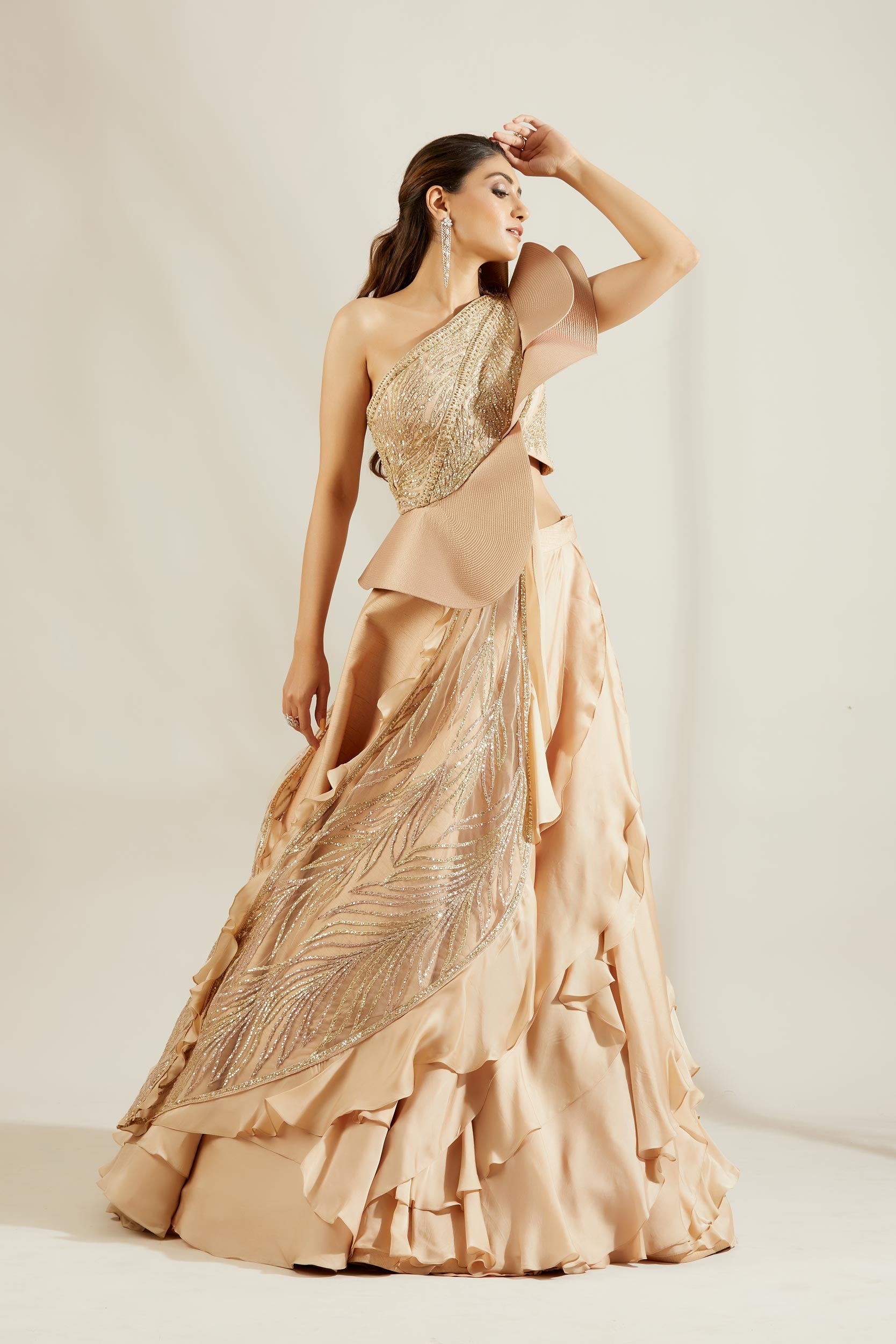 Golden leaf peplum one shoulder top with placement embroidery comes with an organza ruffle skirt showing the golden tints of transparency and an attached dupatta