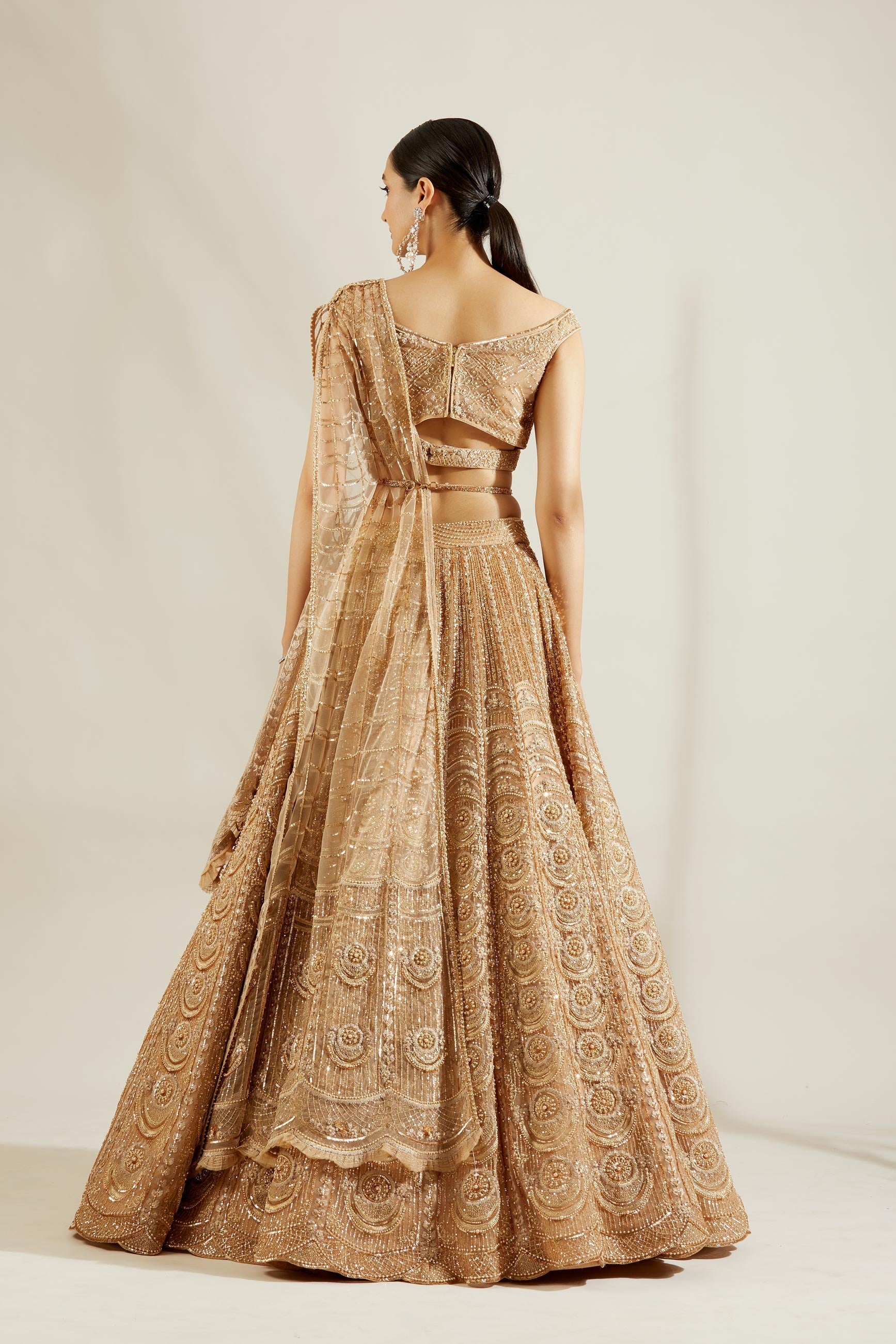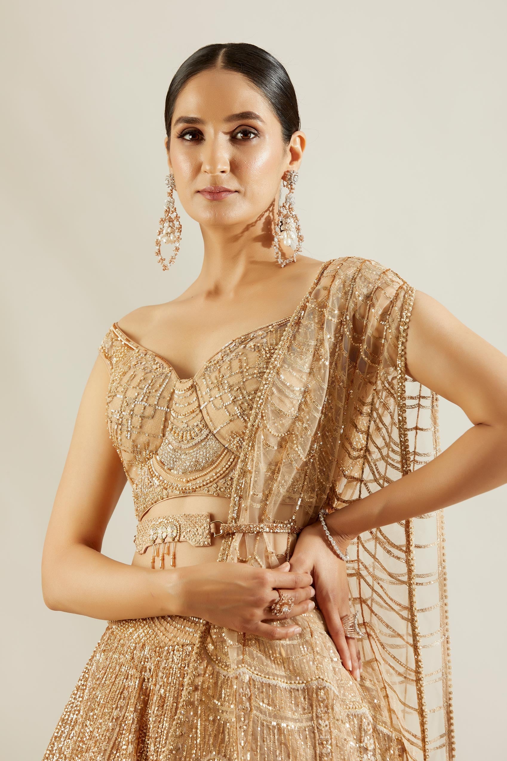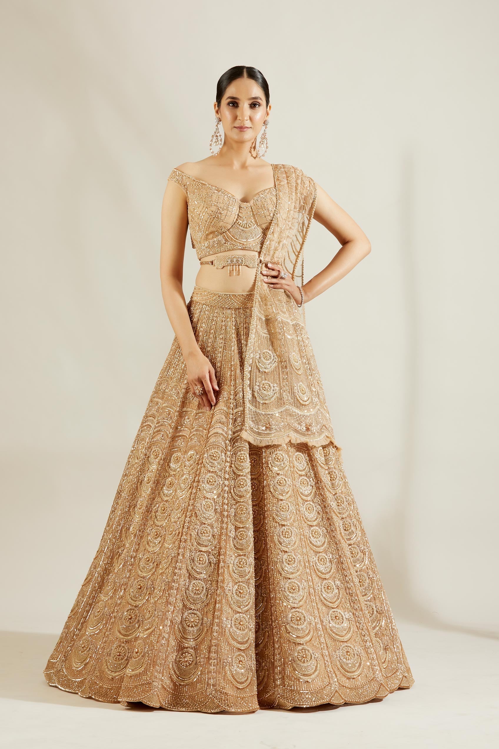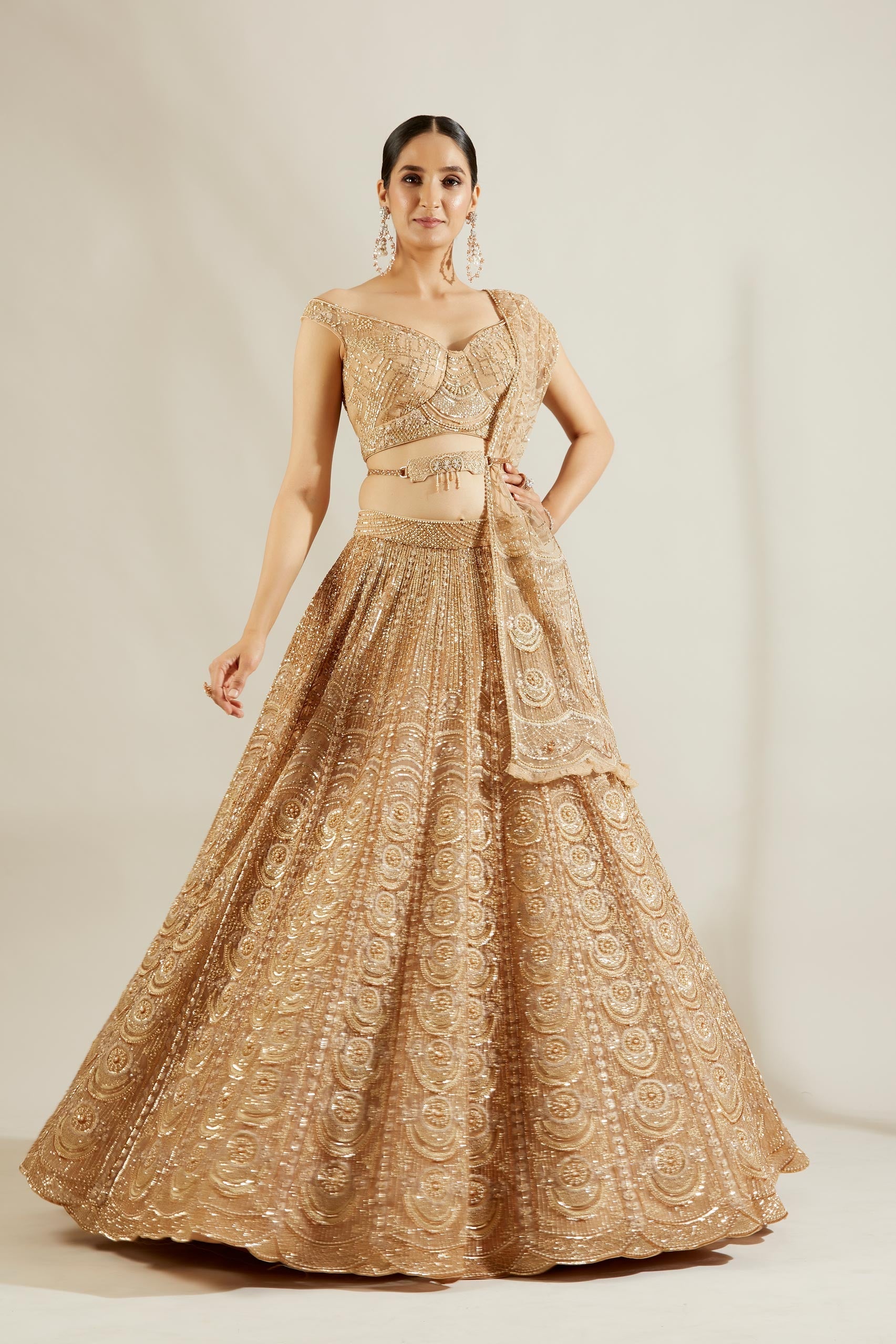 Golden dori mandala lehenga with pear embellishment all over paired with sensual neckline blouse and a dupatta