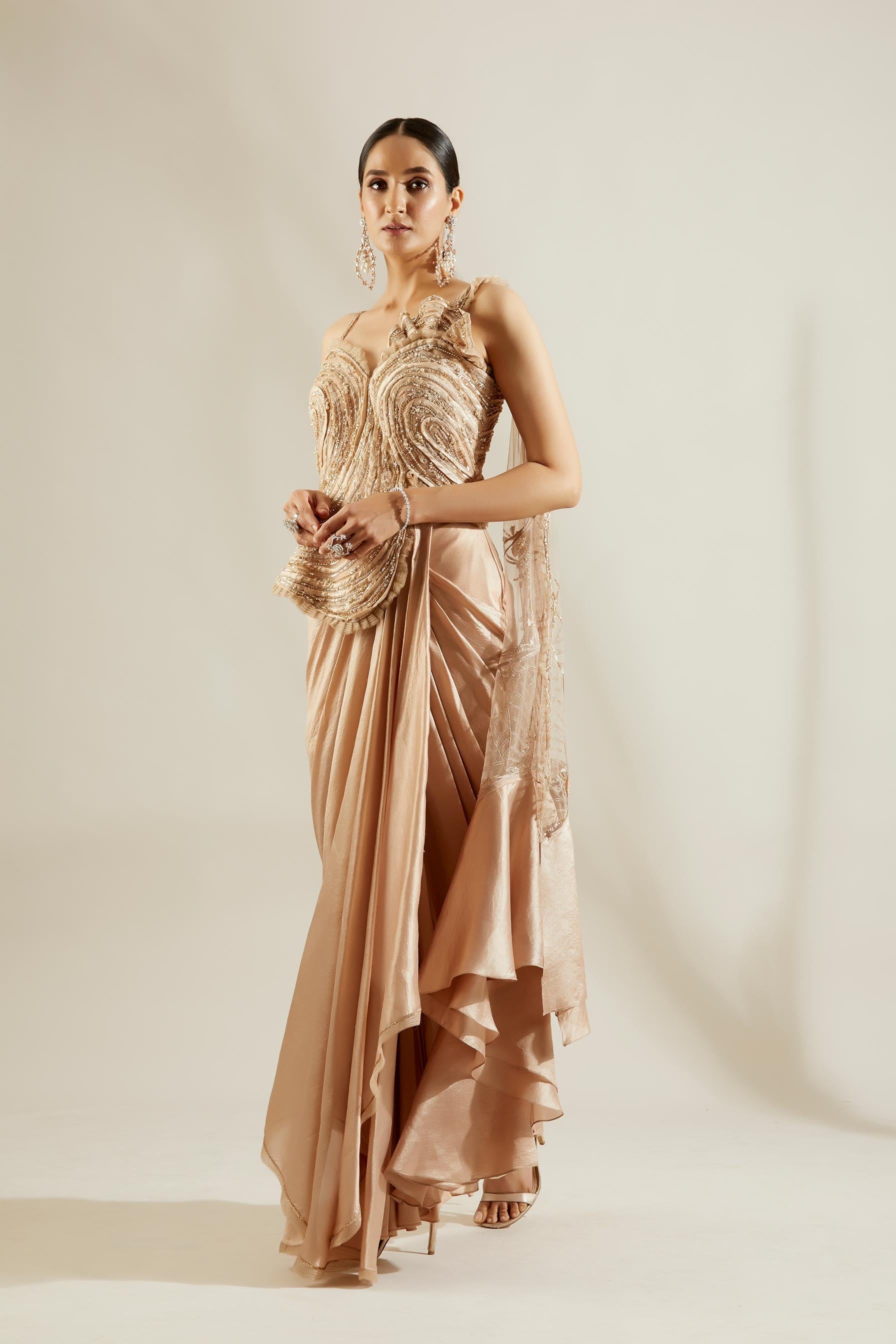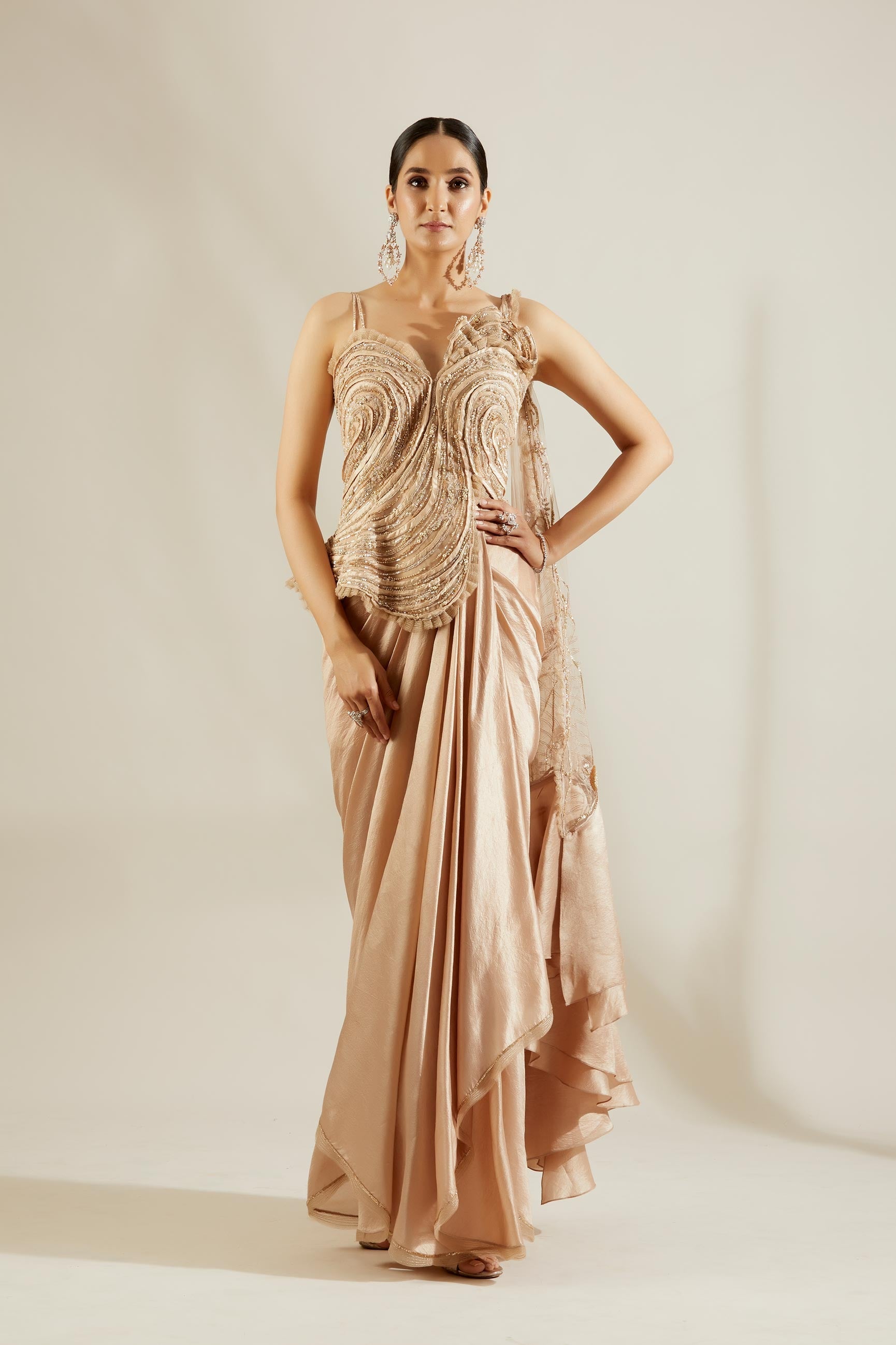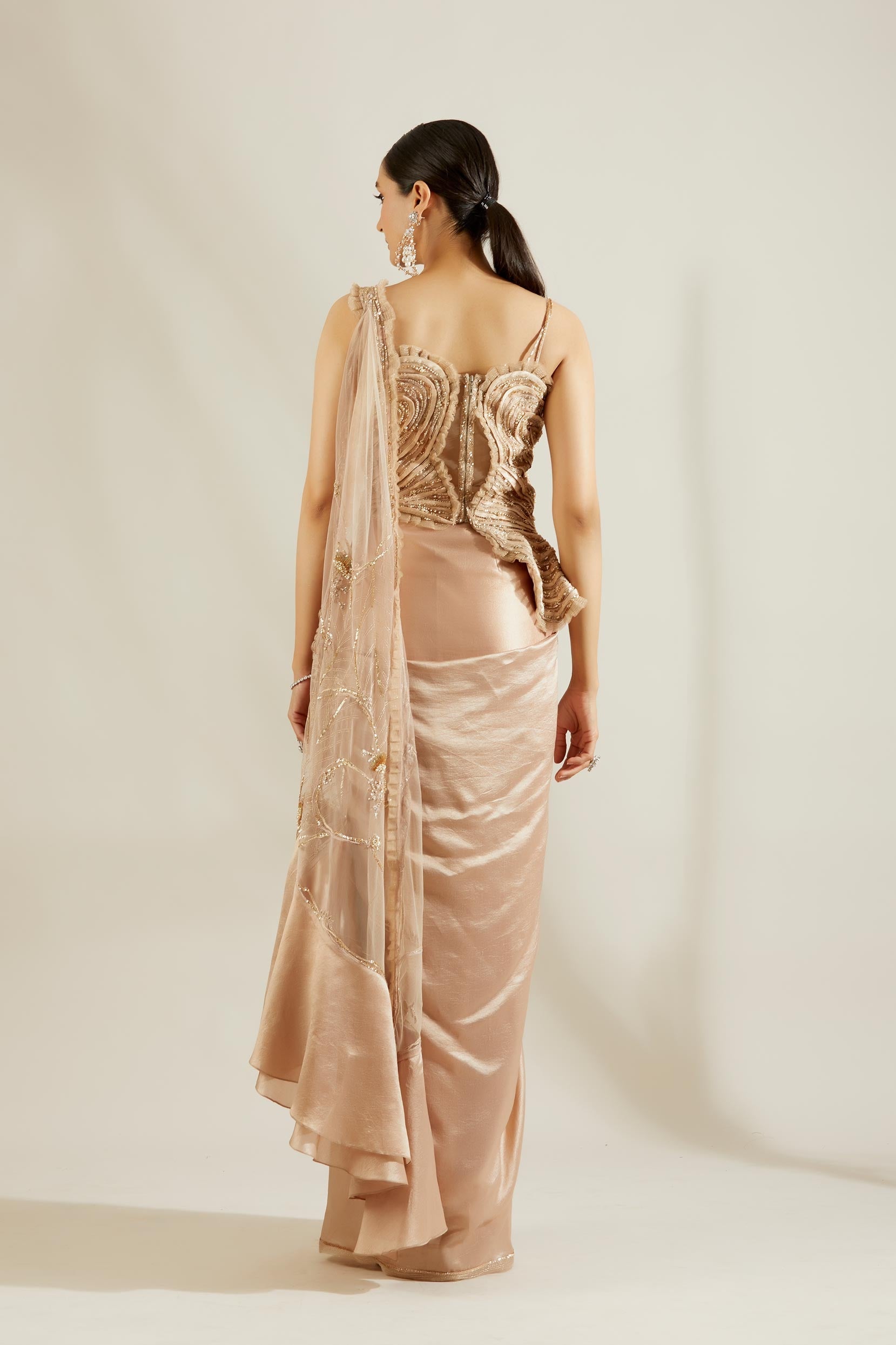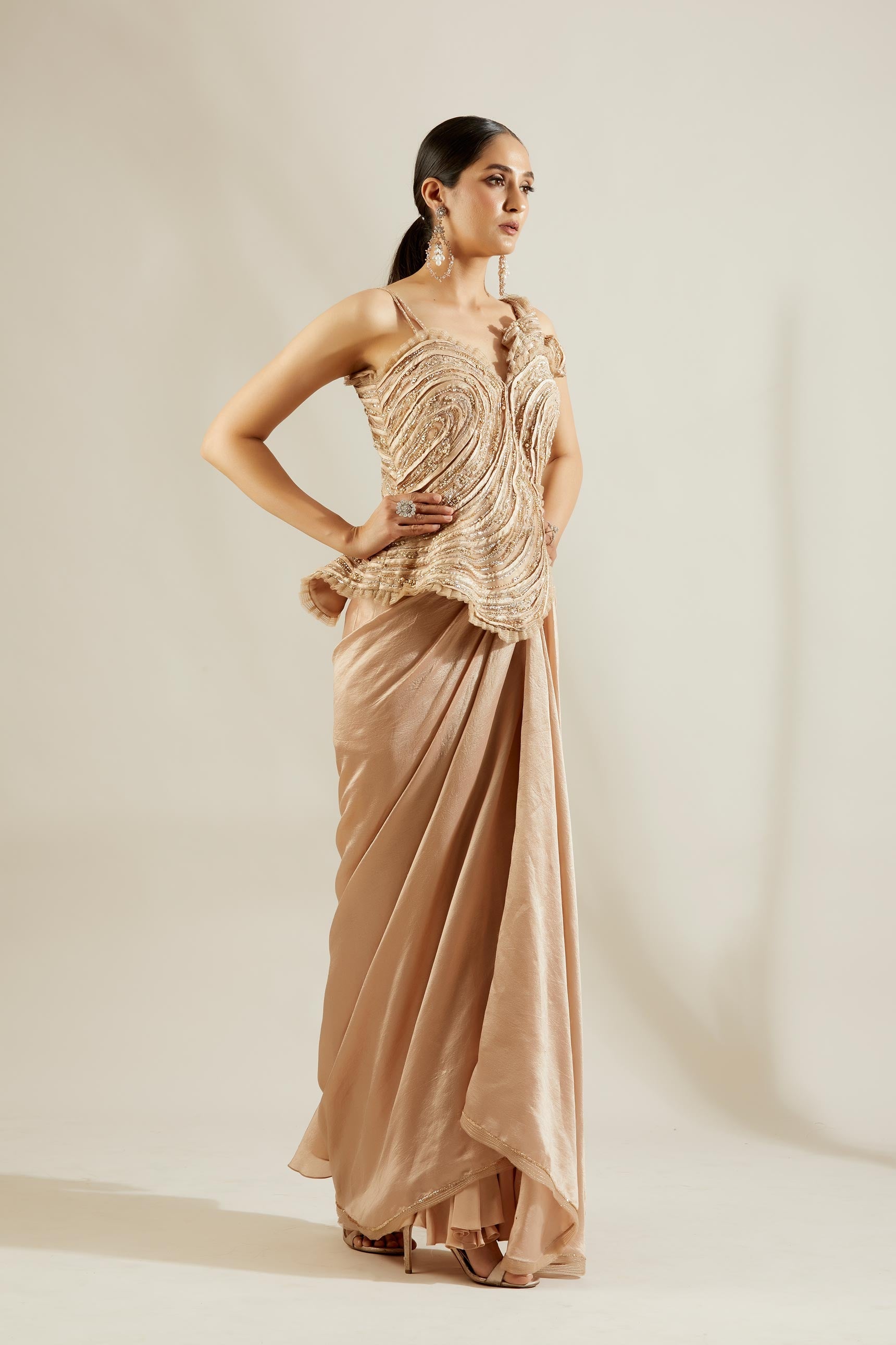 Golden peplum pre-stitched dhoti saree with brush stroke embellishment