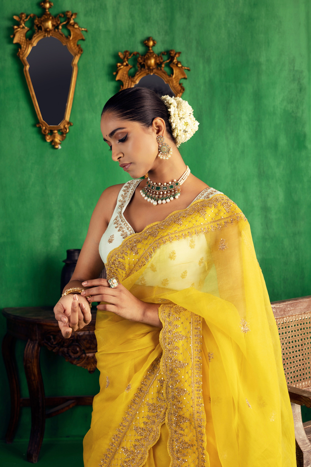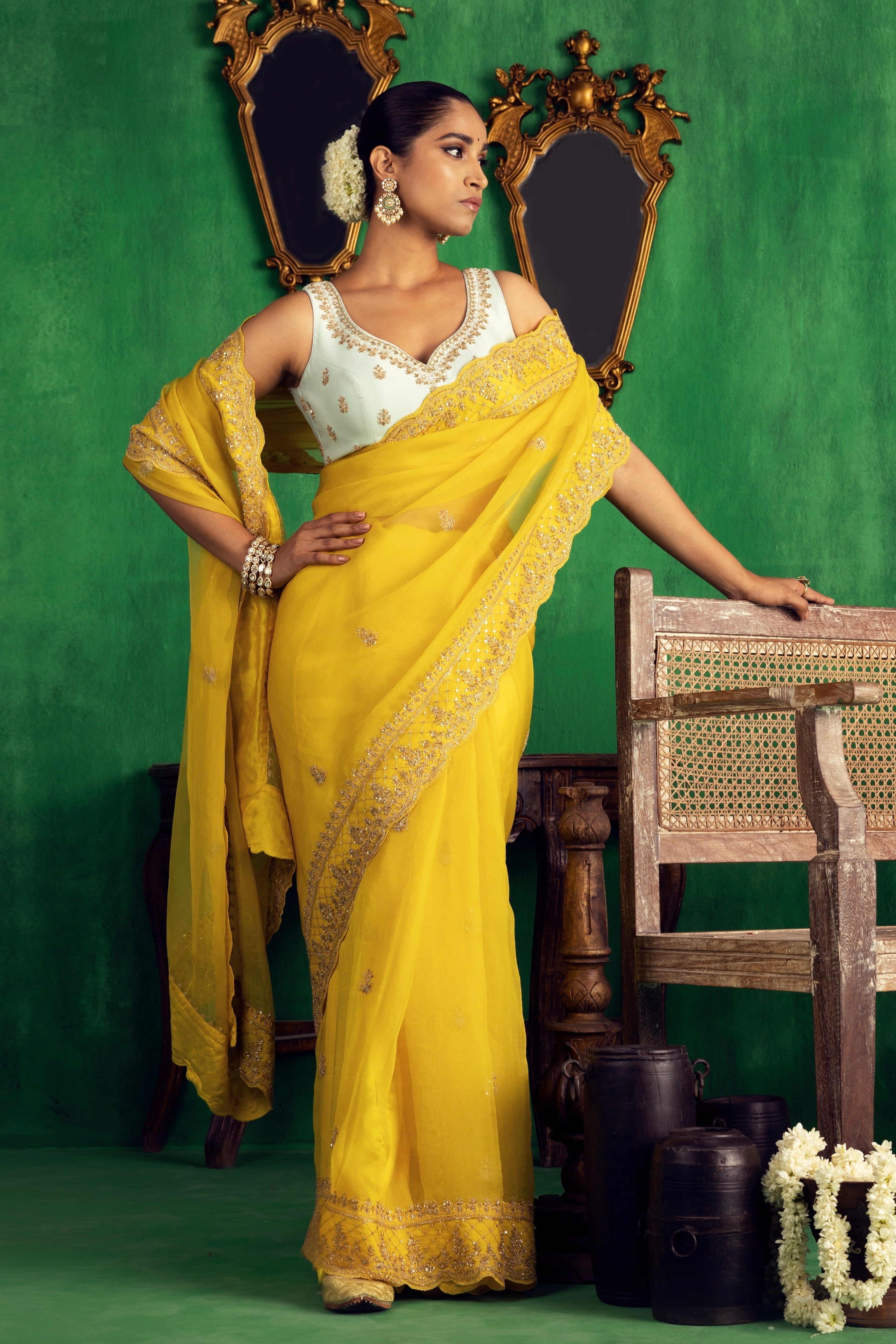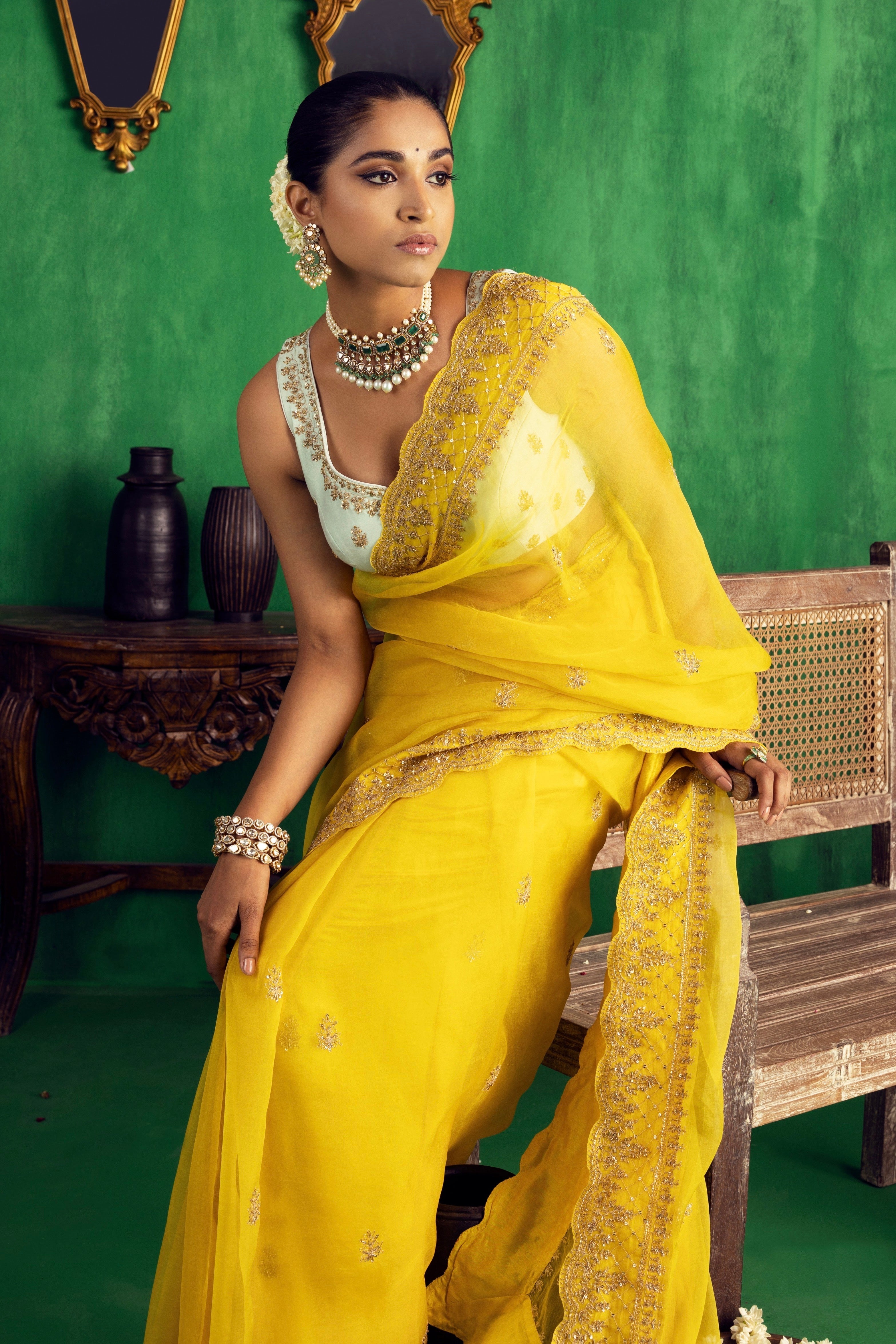 Featuring a yellow Organza saree paired with a Chanderi aqua-coloured blouse with gold dori and aari embroidery