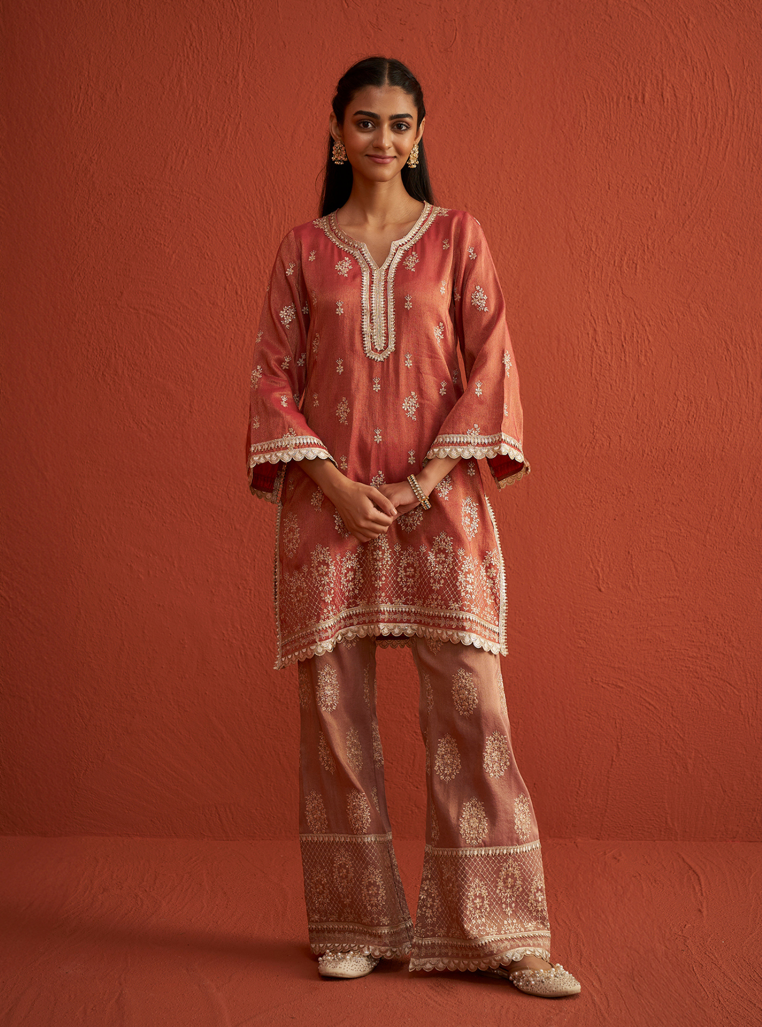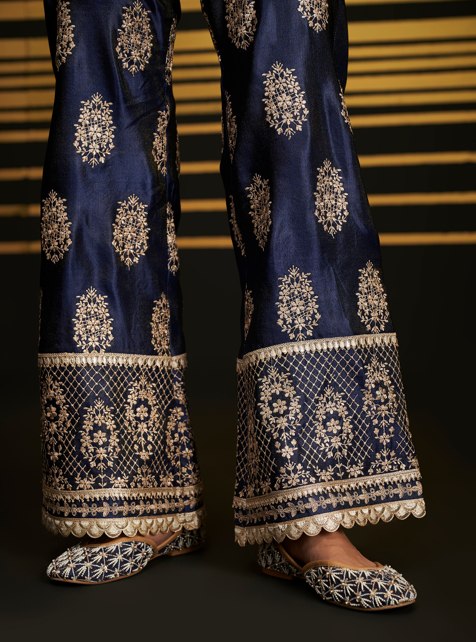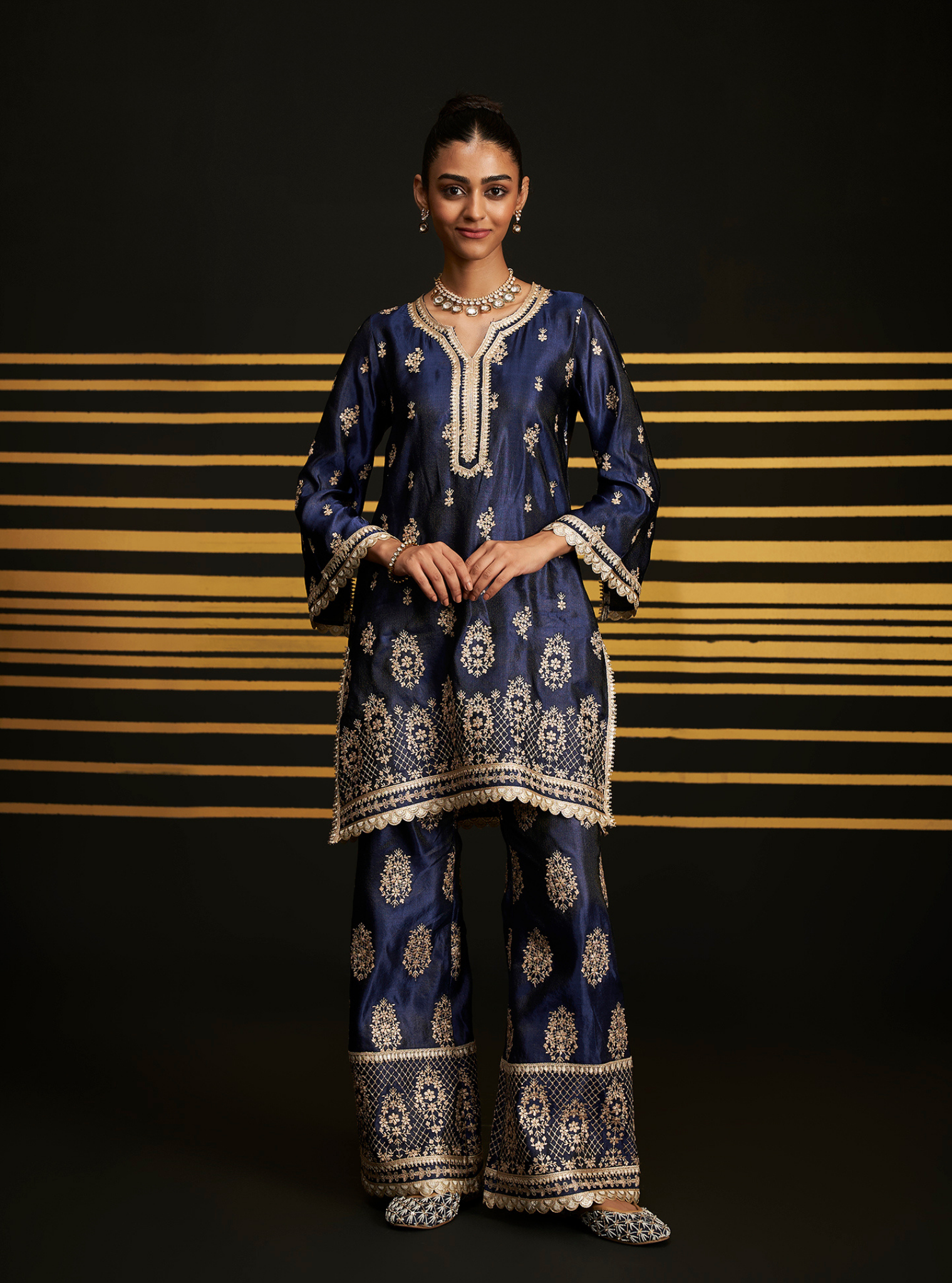 A stunning contemporary style for those who prefer a youthful flair to the traditional. Executed in a rich red/Navy color, the kurta is adorned with intricate embroidery all over, accentuated with gotta work at the neckline, sleeves, and hemline. It is paired with broad palazzo bottoms that feature the same embroidery and gotta detailing at the hem. The traditional embroidery motif imparts a regal touch to the ensemble. Pair it with the matching dupatta, finished with a broad gotta border.