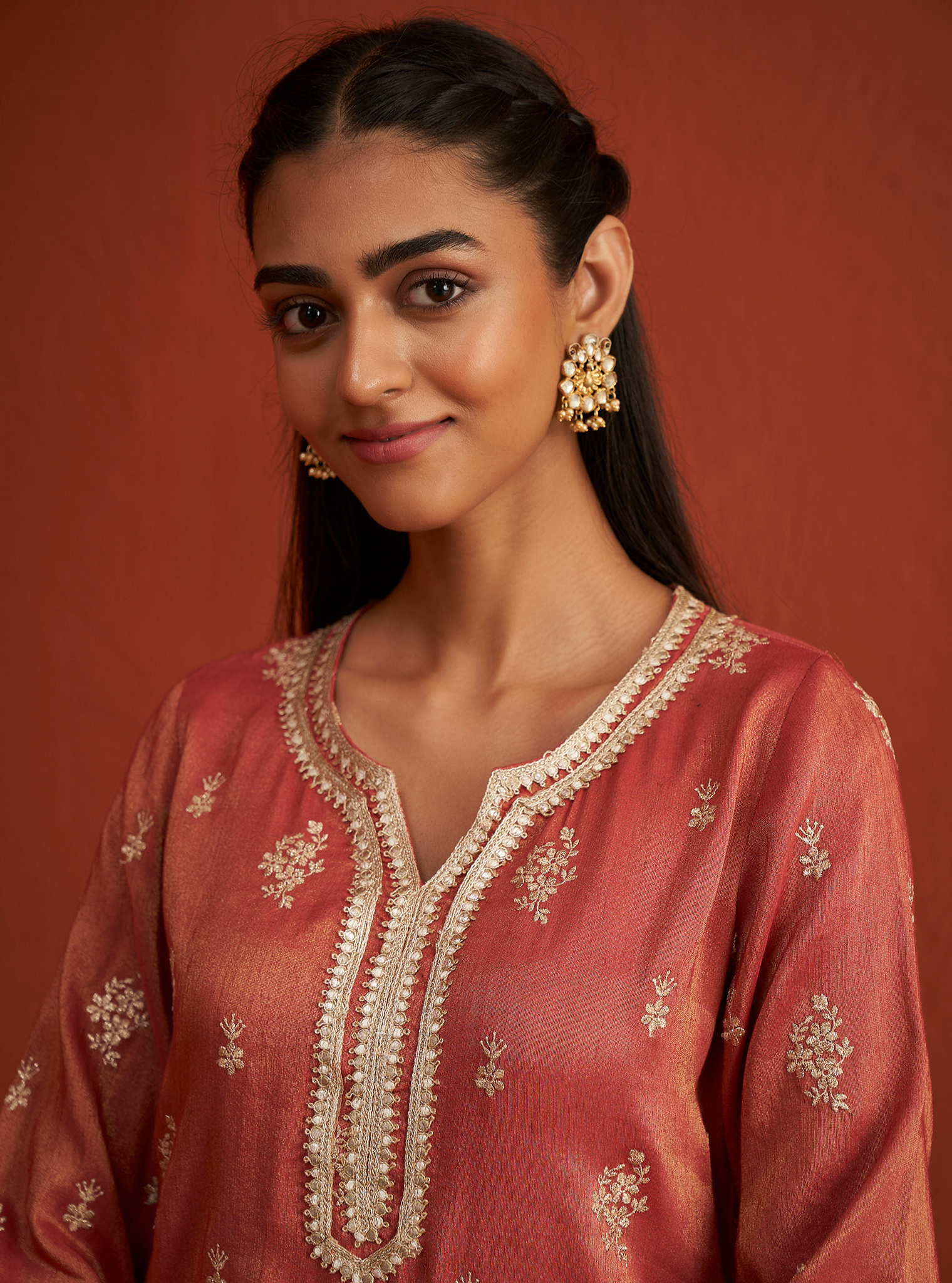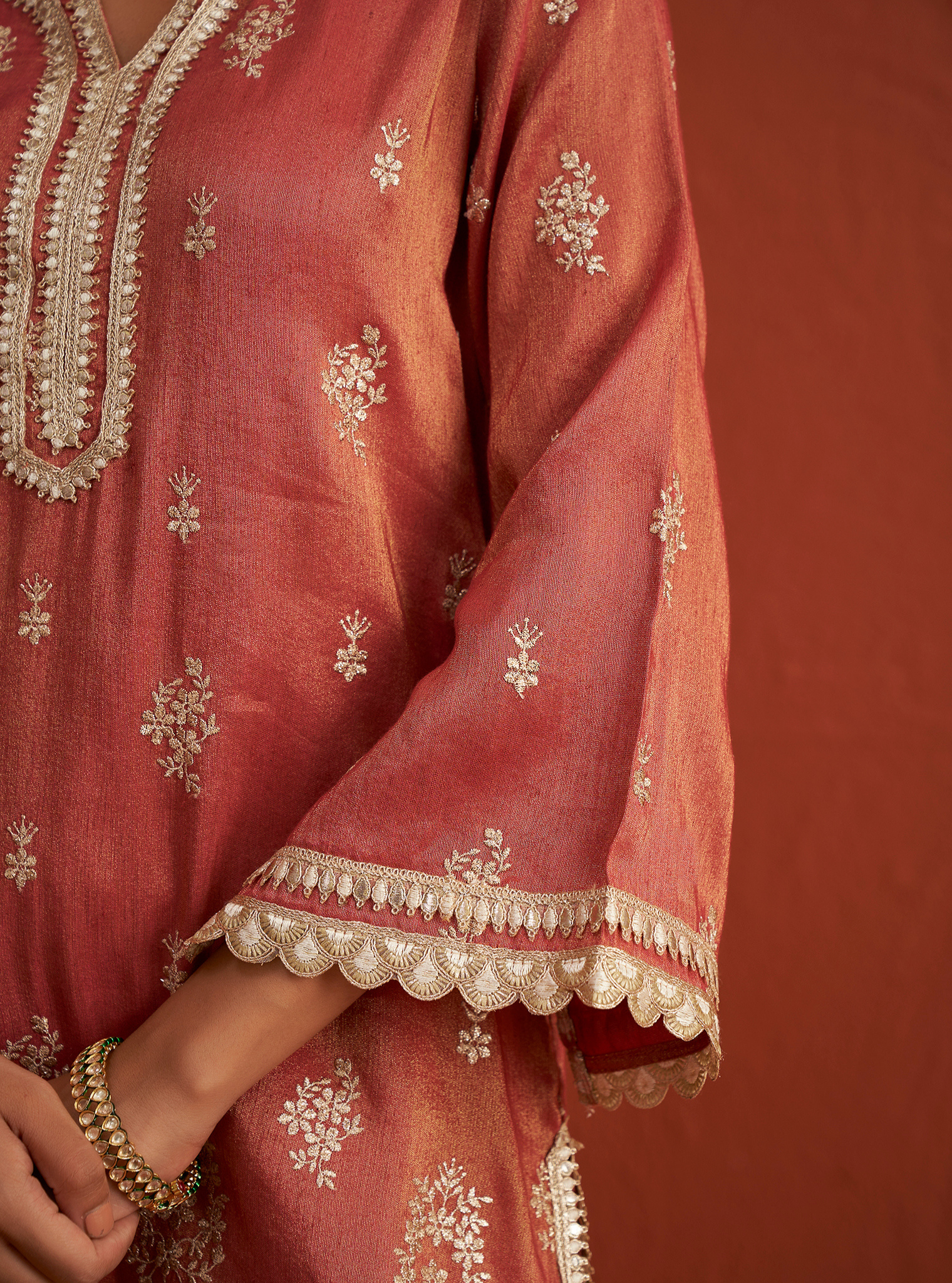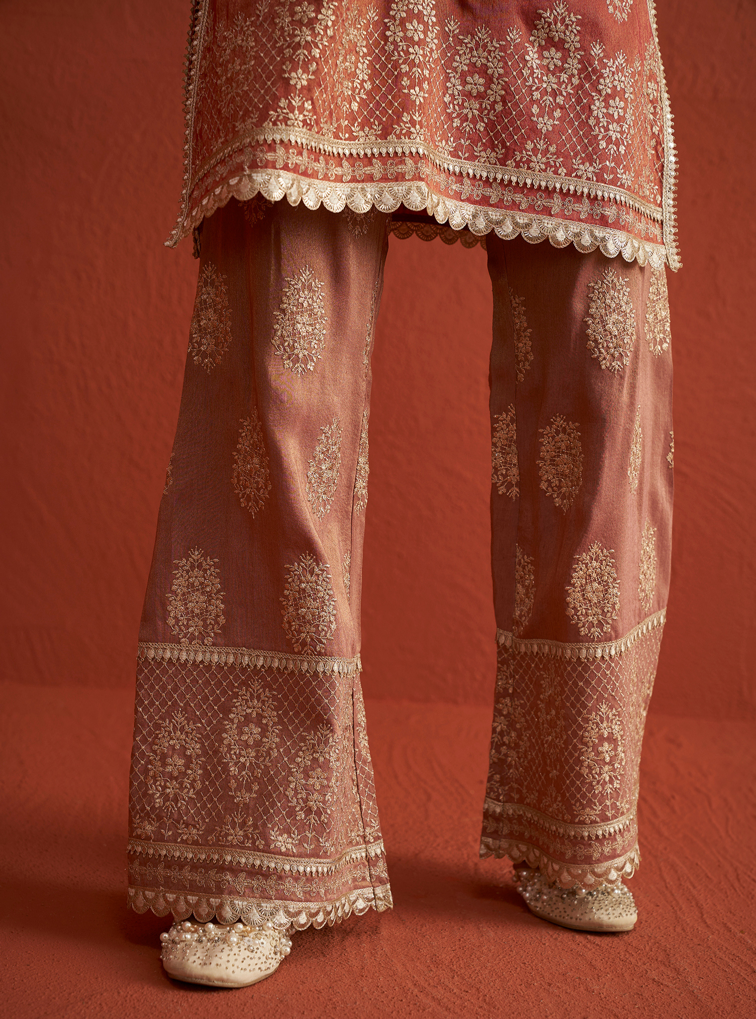 A stunning contemporary style for those who prefer a youthful flair to the traditional. Executed in a rich red/Navy color, the kurta is adorned with intricate embroidery all over, accentuated with gotta work at the neckline, sleeves, and hemline. It is paired with broad palazzo bottoms that feature the same embroidery and gotta detailing at the hem. The traditional embroidery motif imparts a regal touch to the ensemble. Pair it with the matching dupatta, finished with a broad gotta border.