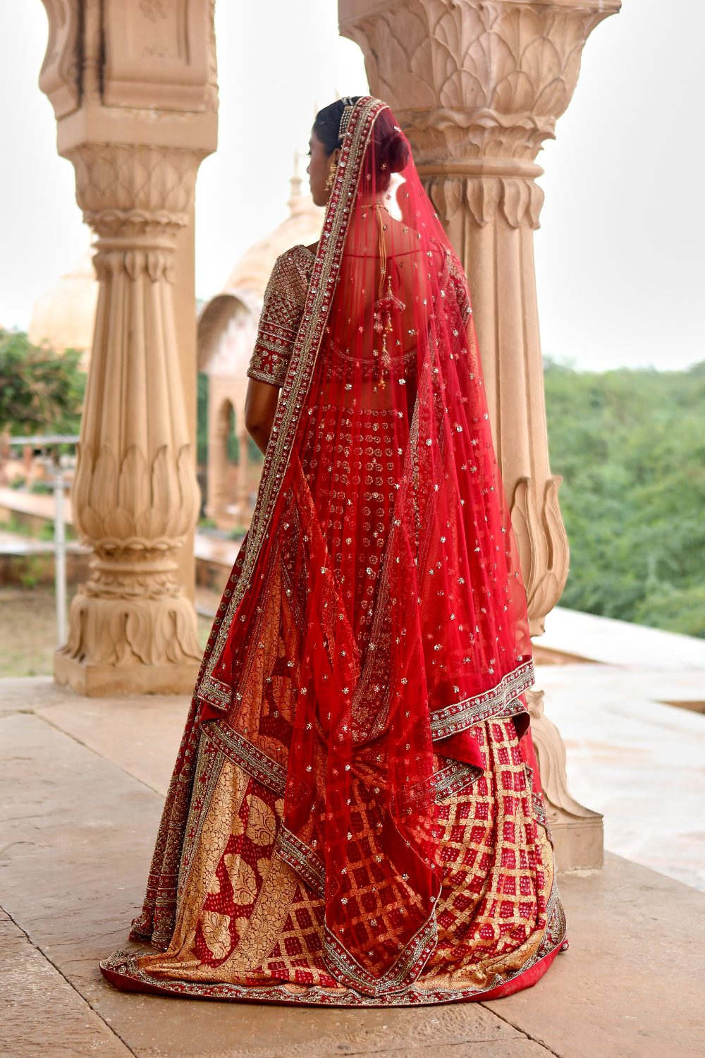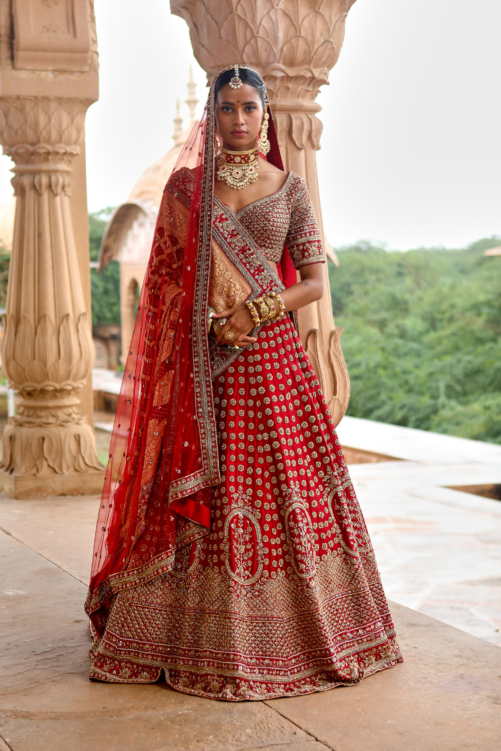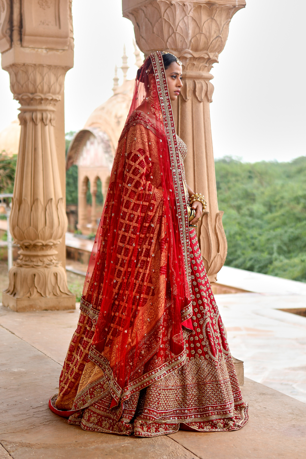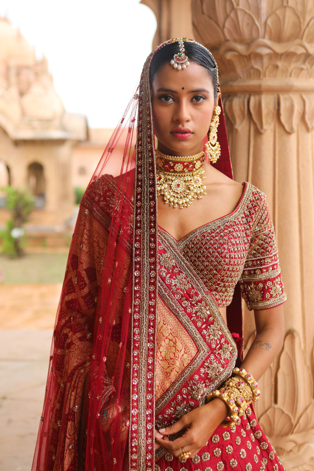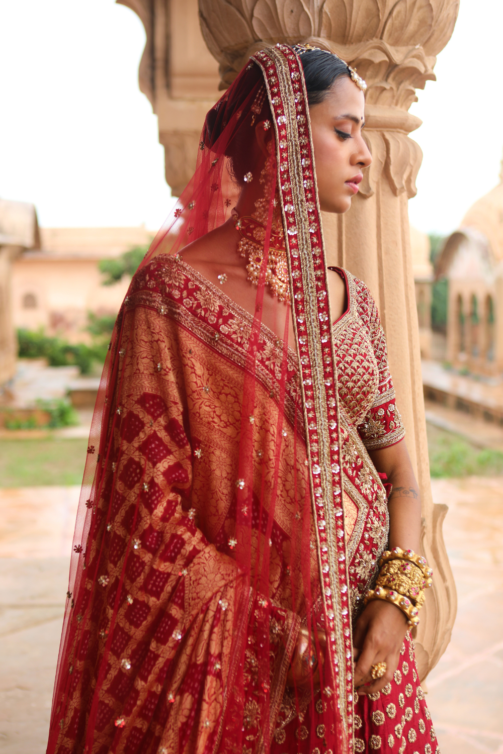 Featuring a Red raw-silk bridal lehenga set paired with a butterfly net base and banarsi dupatta with gold zardosi and aari embroidery on it.