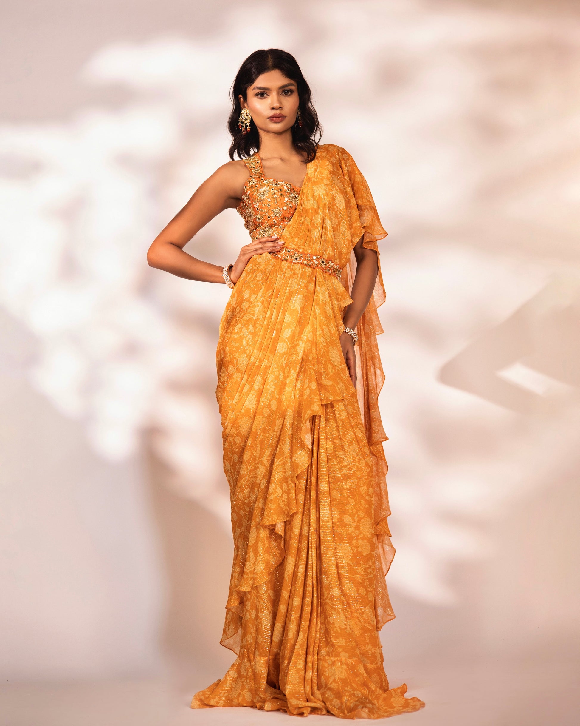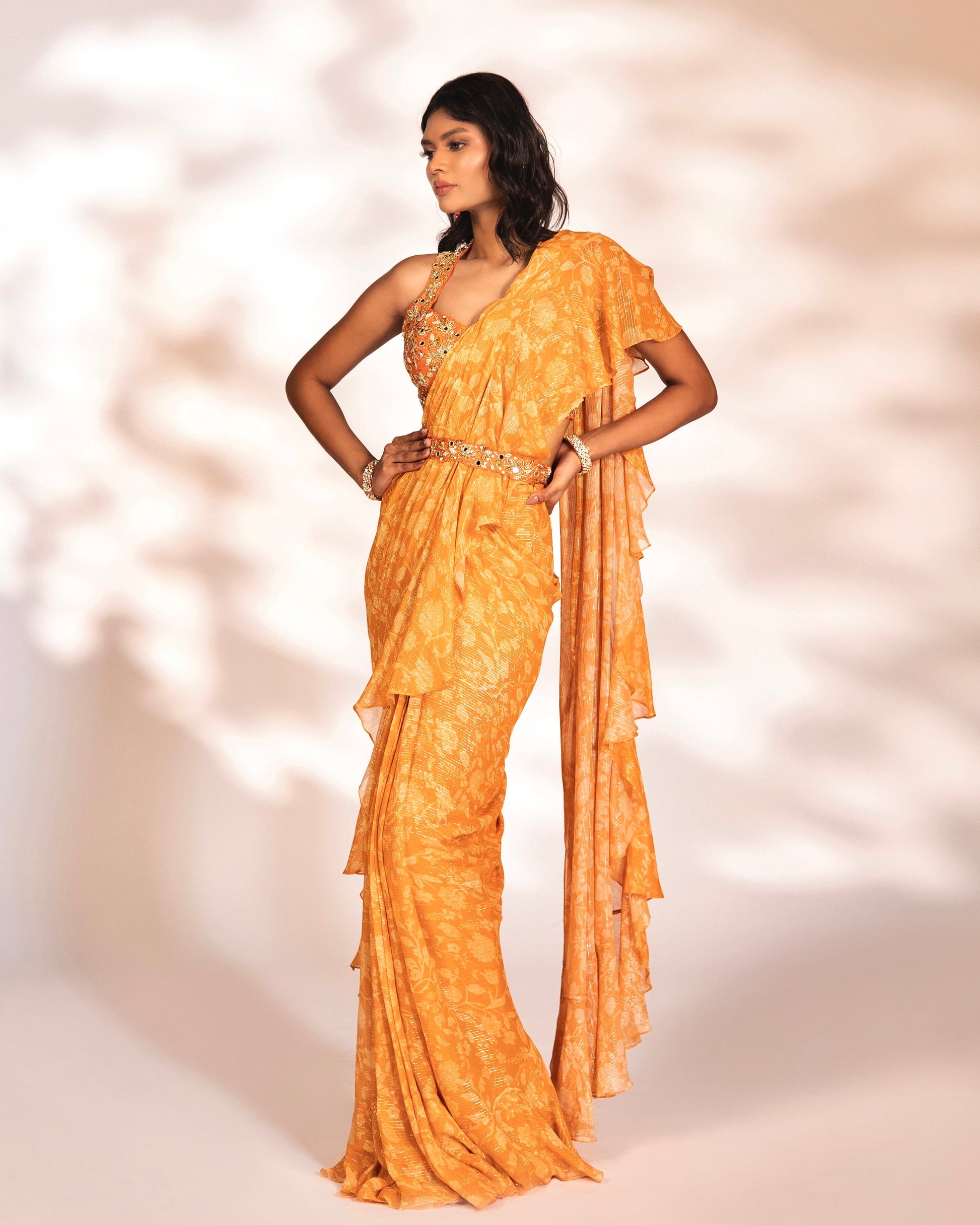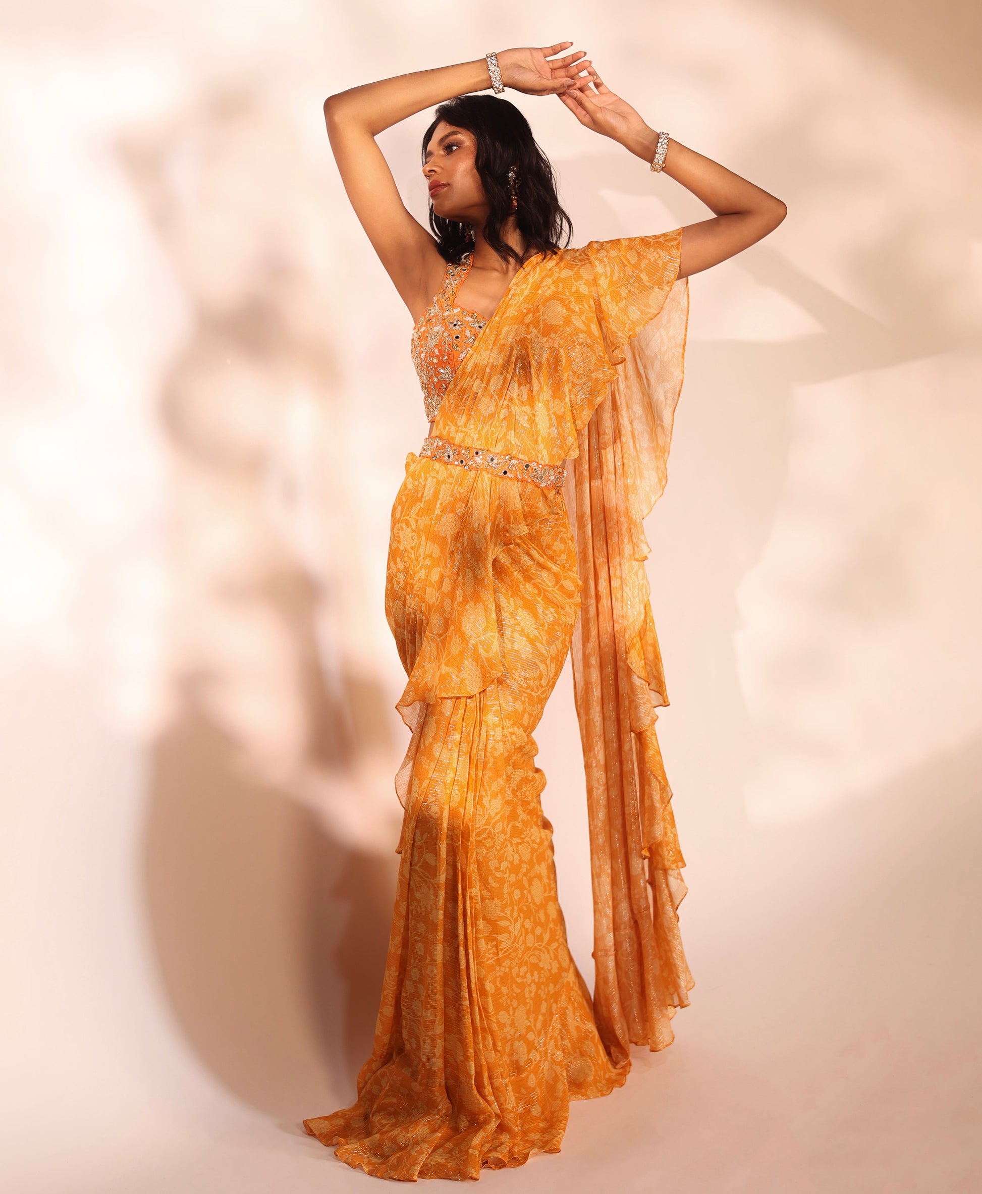 Orange printed ruffled saree with an embroidered blouse and waist belt.