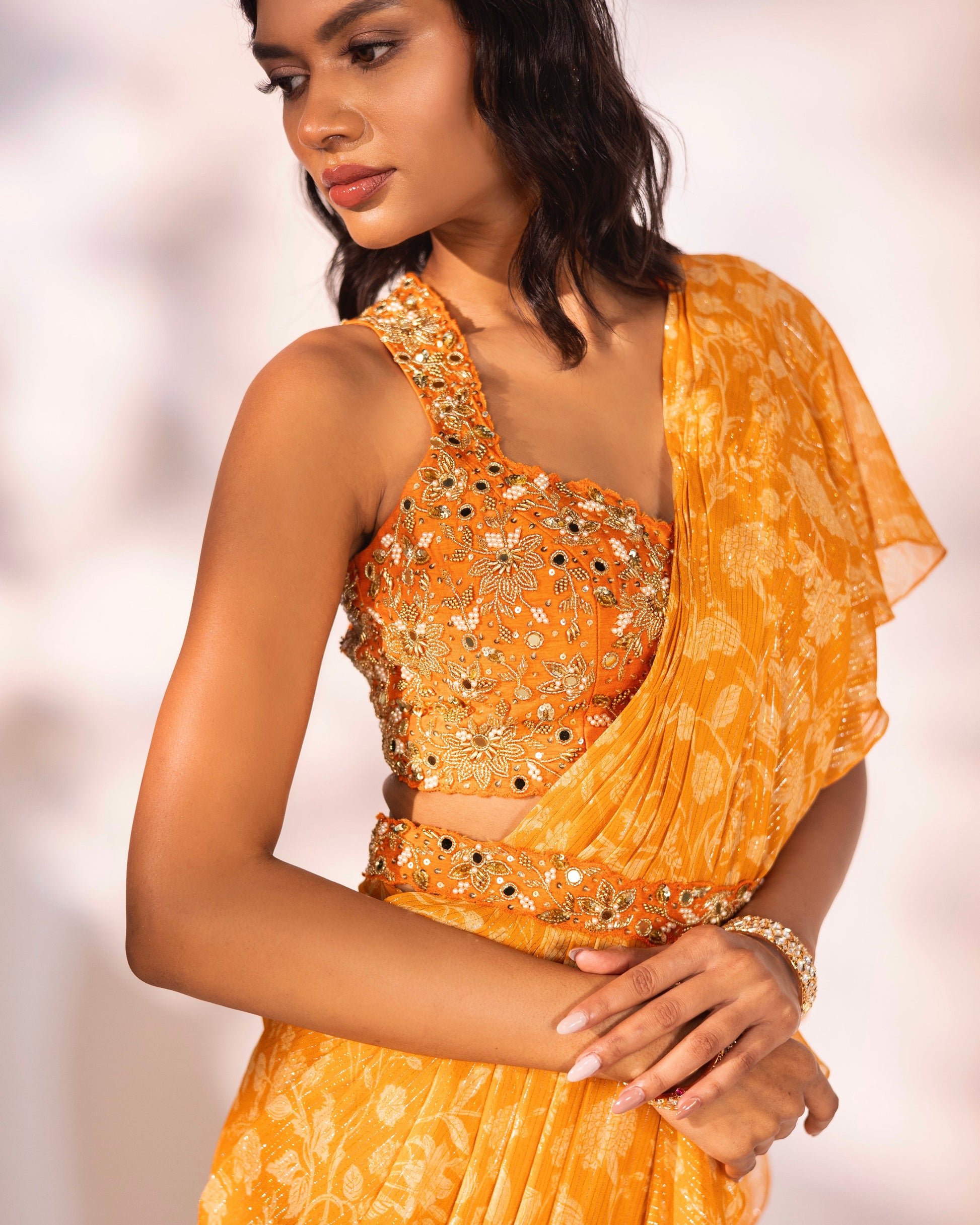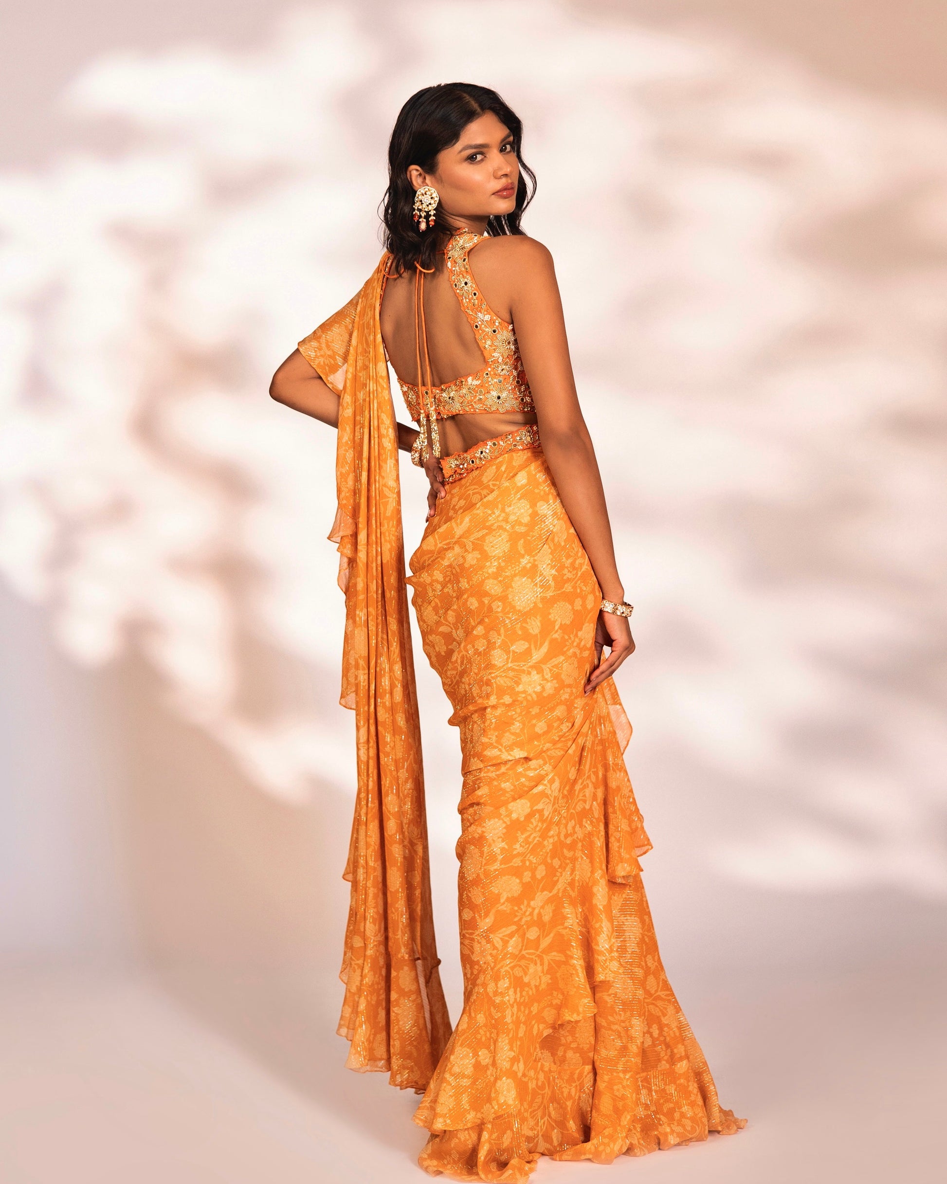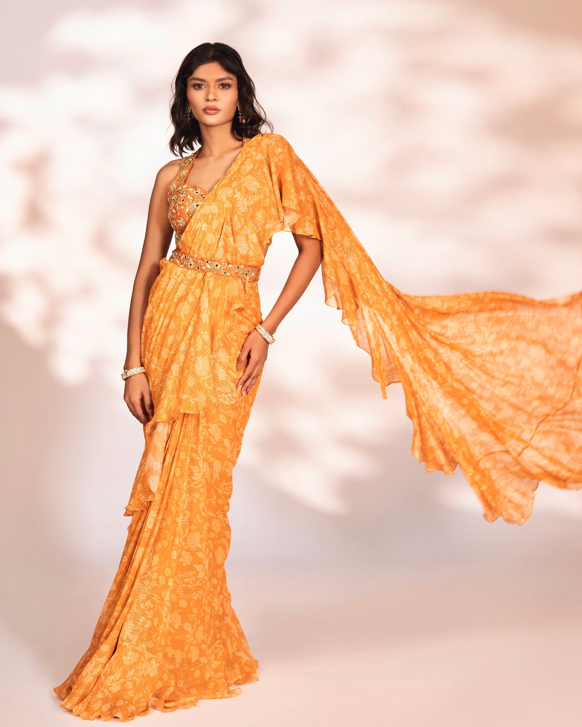 Orange printed ruffled saree with an embroidered blouse and waist belt.