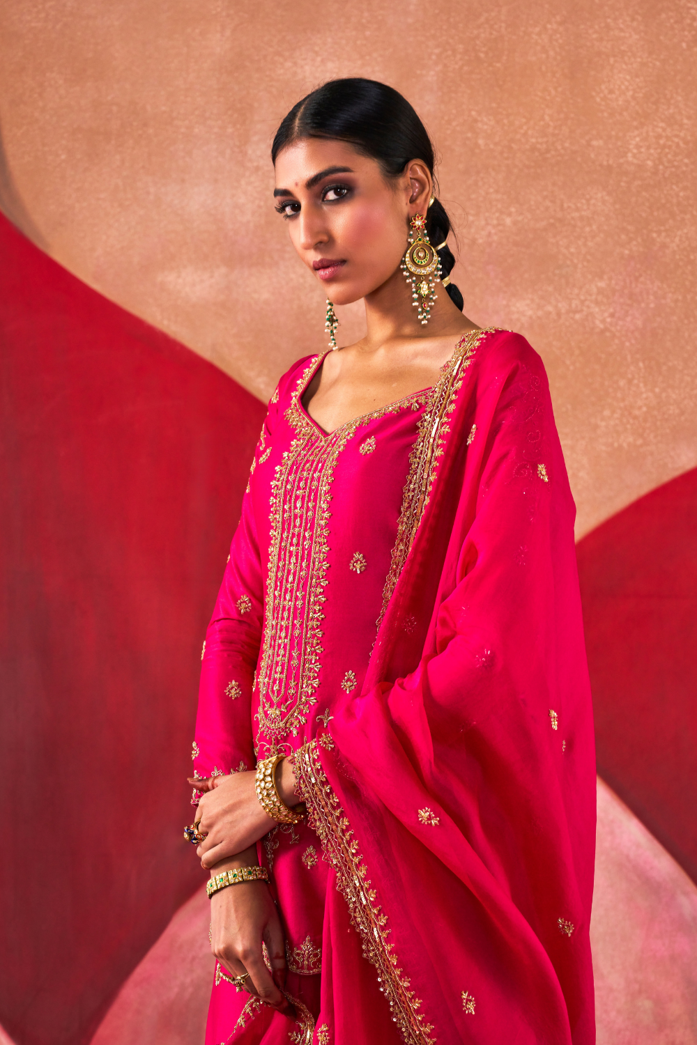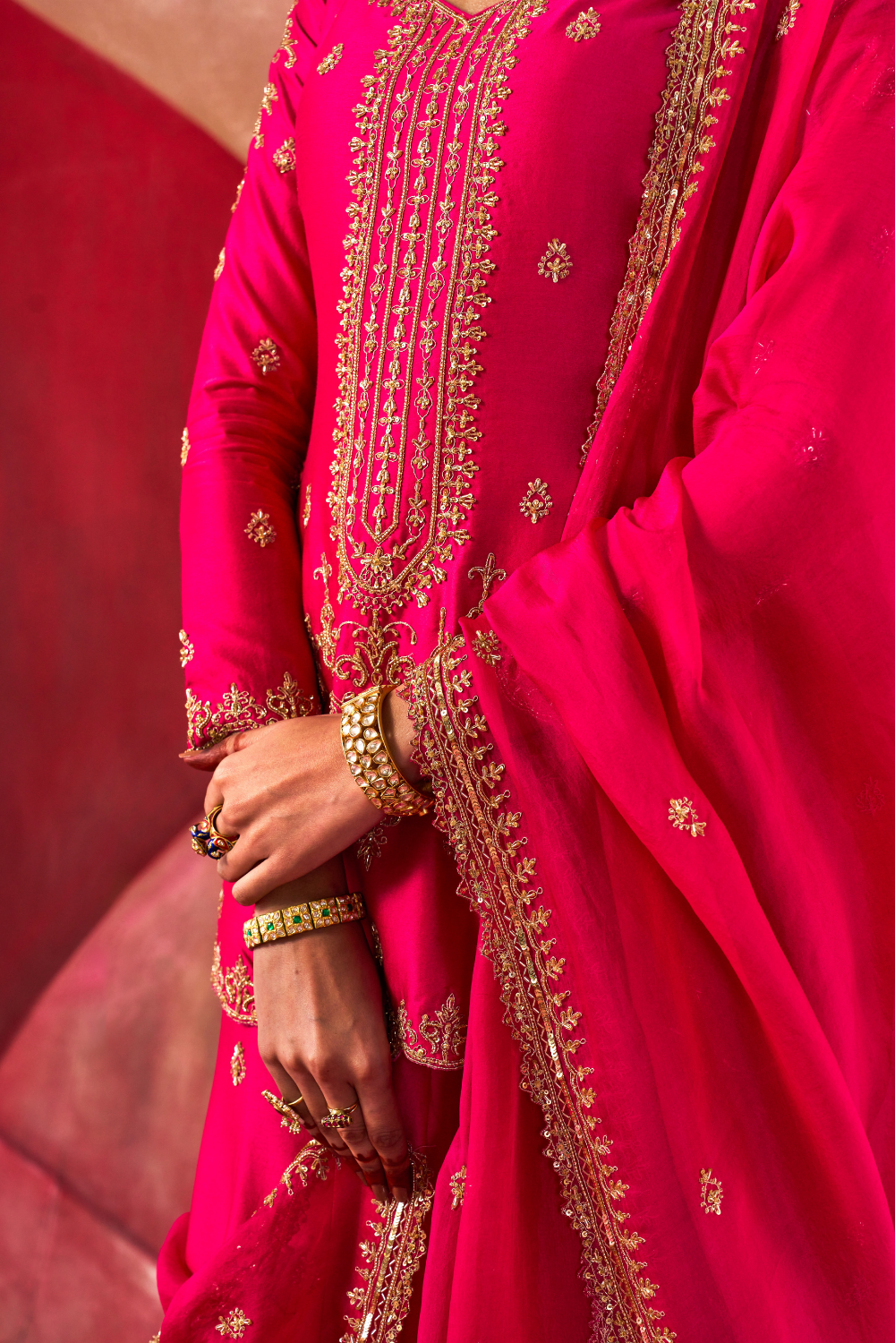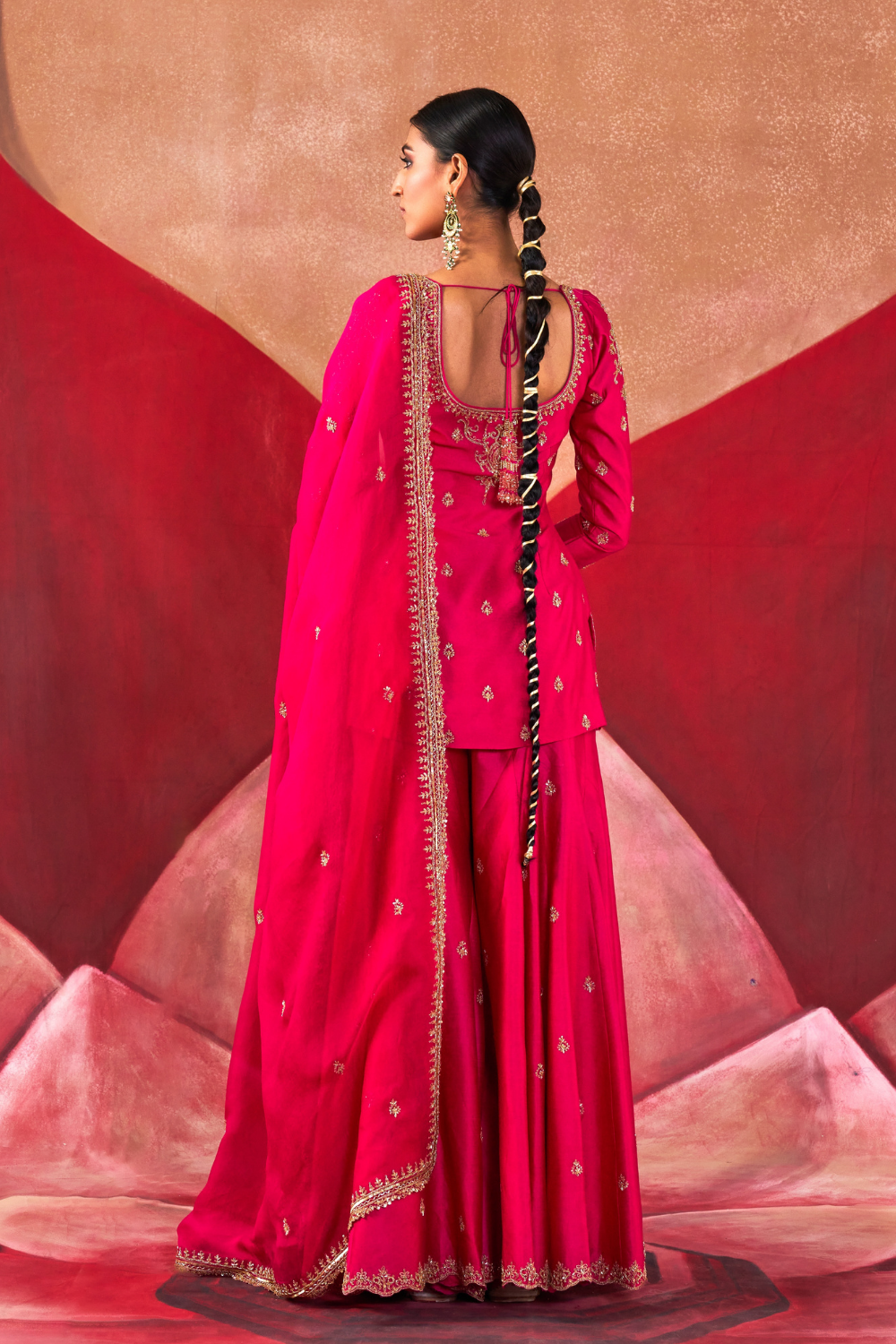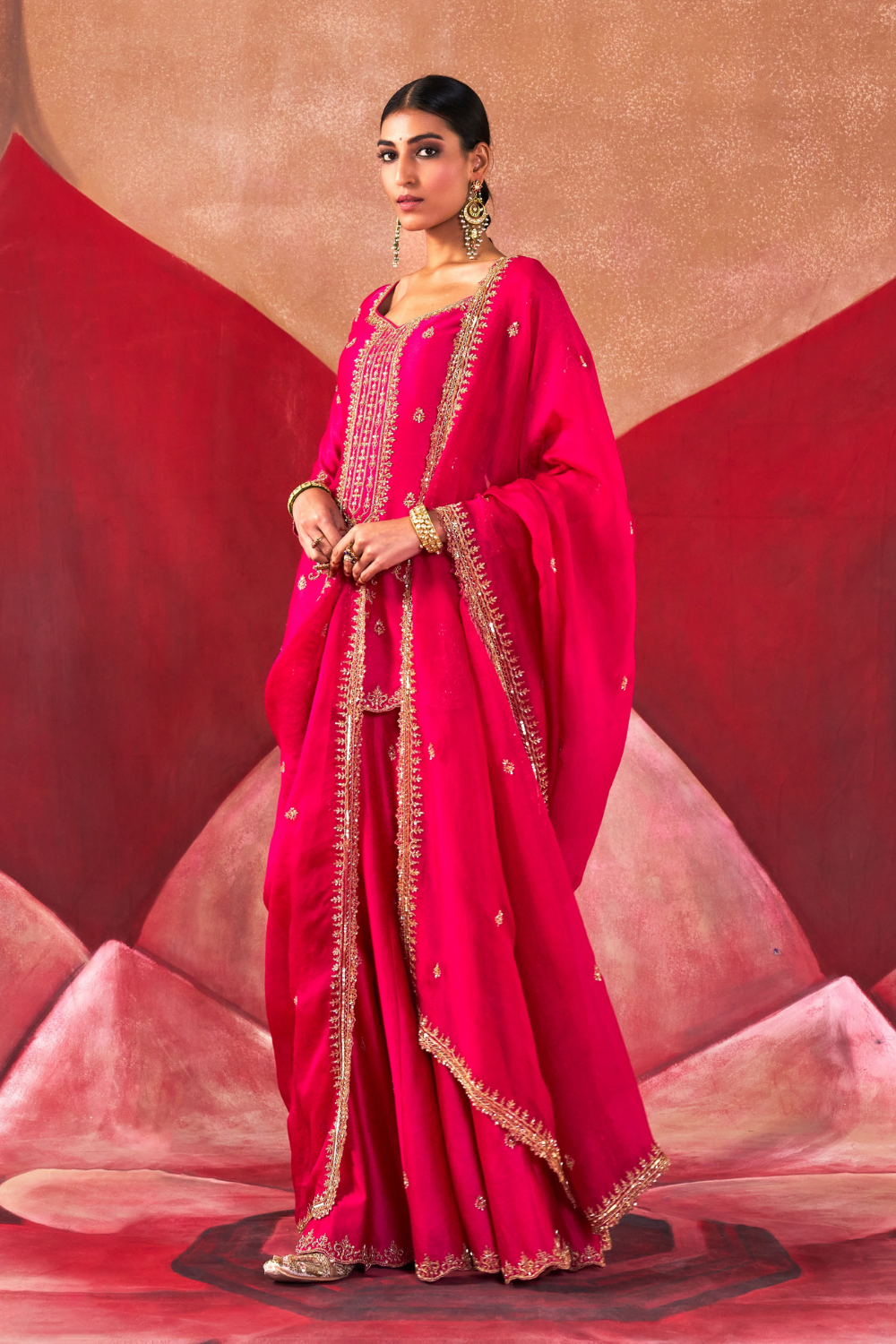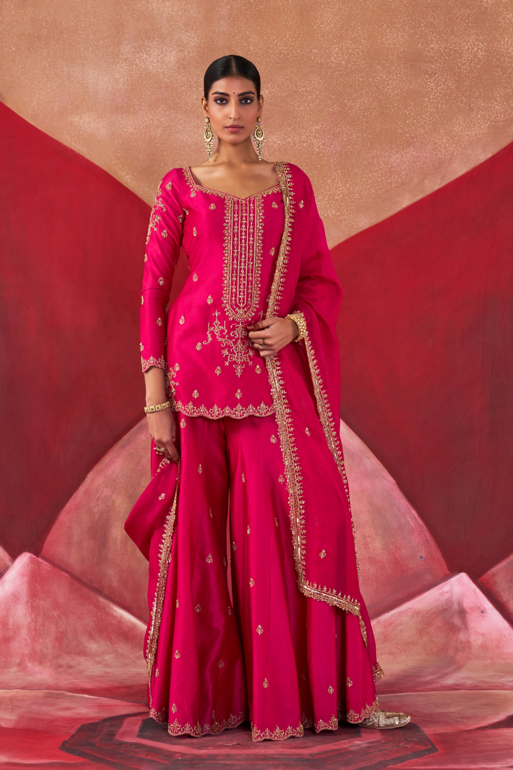 Featuring a hot pink chanderi silk sharara set paired with an organza base dupatta with antique gold dori and embellished hand embroidery.