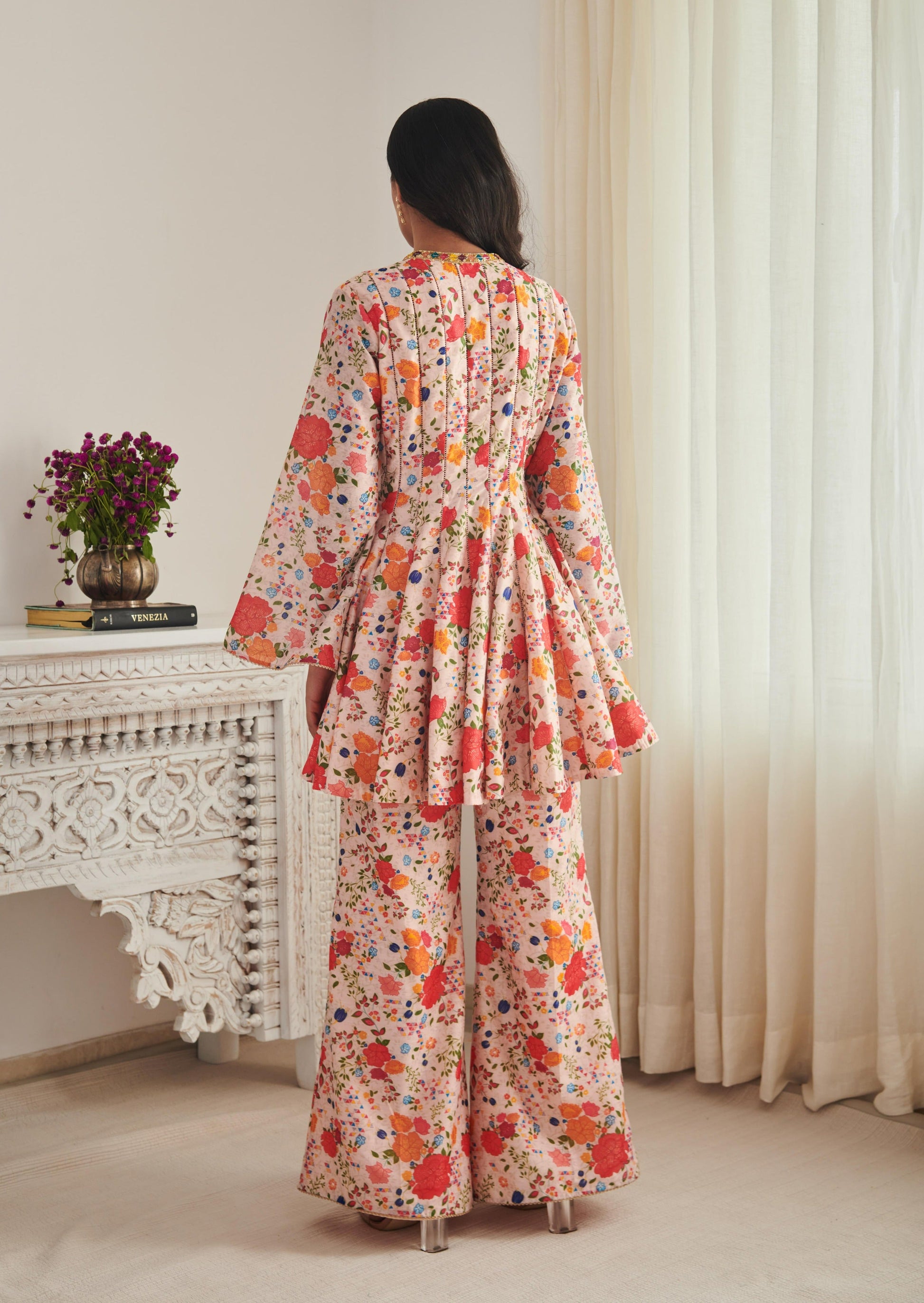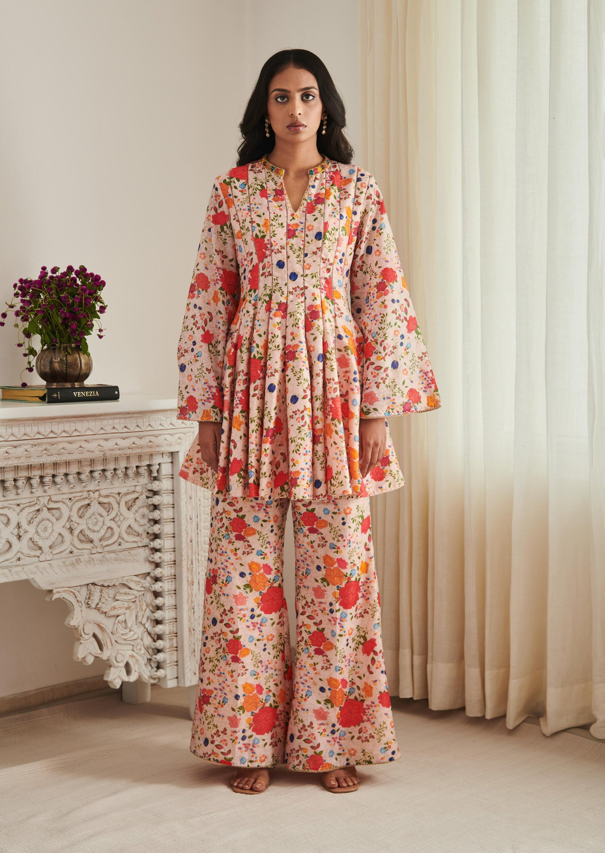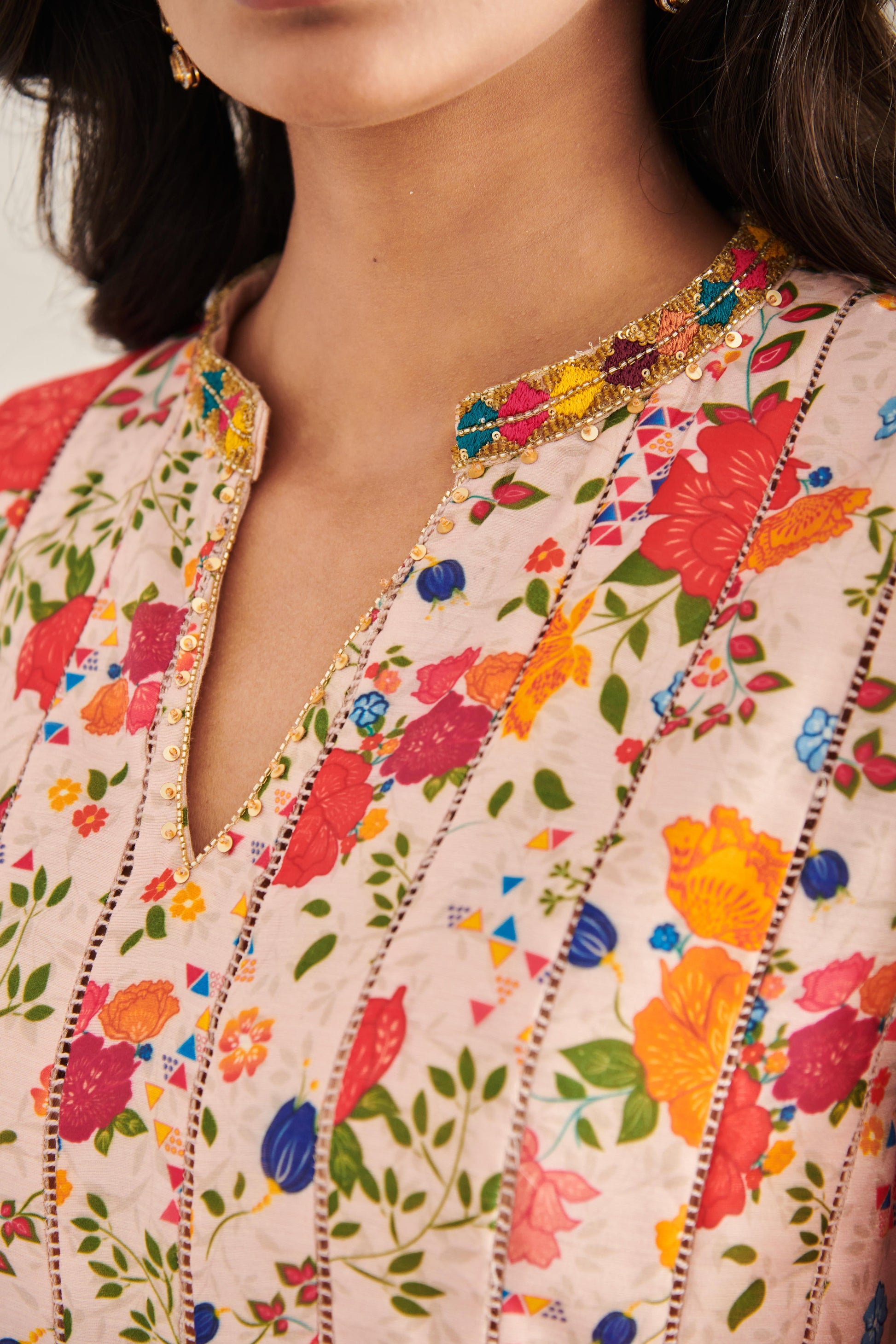 Champagne coloured floral printed kurta with peplums and multicoloured embroidery details with flared pants.