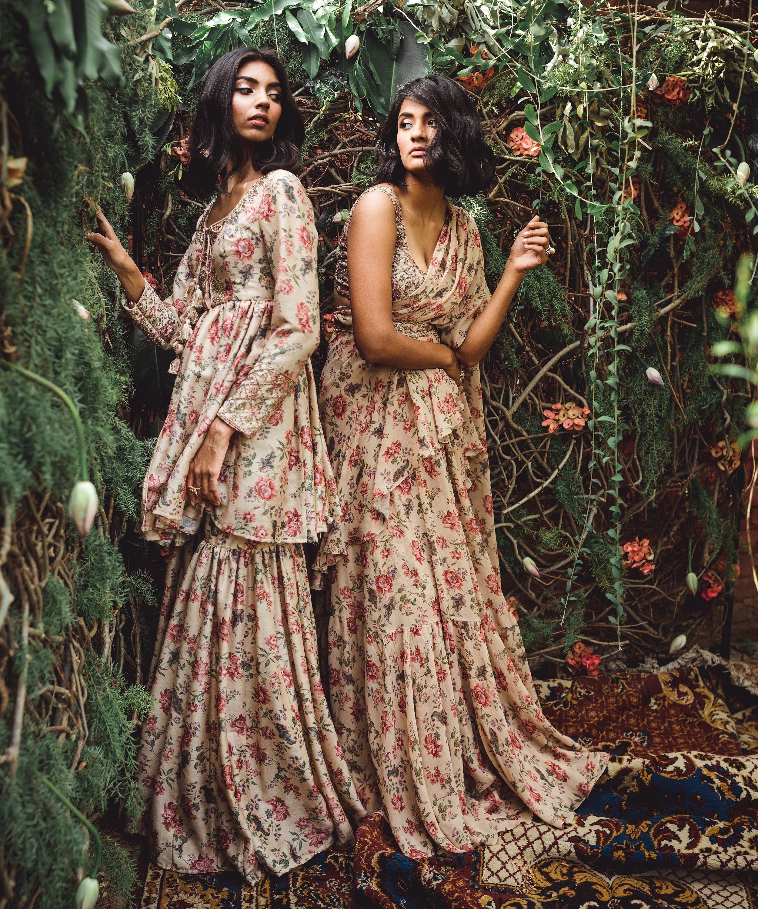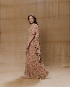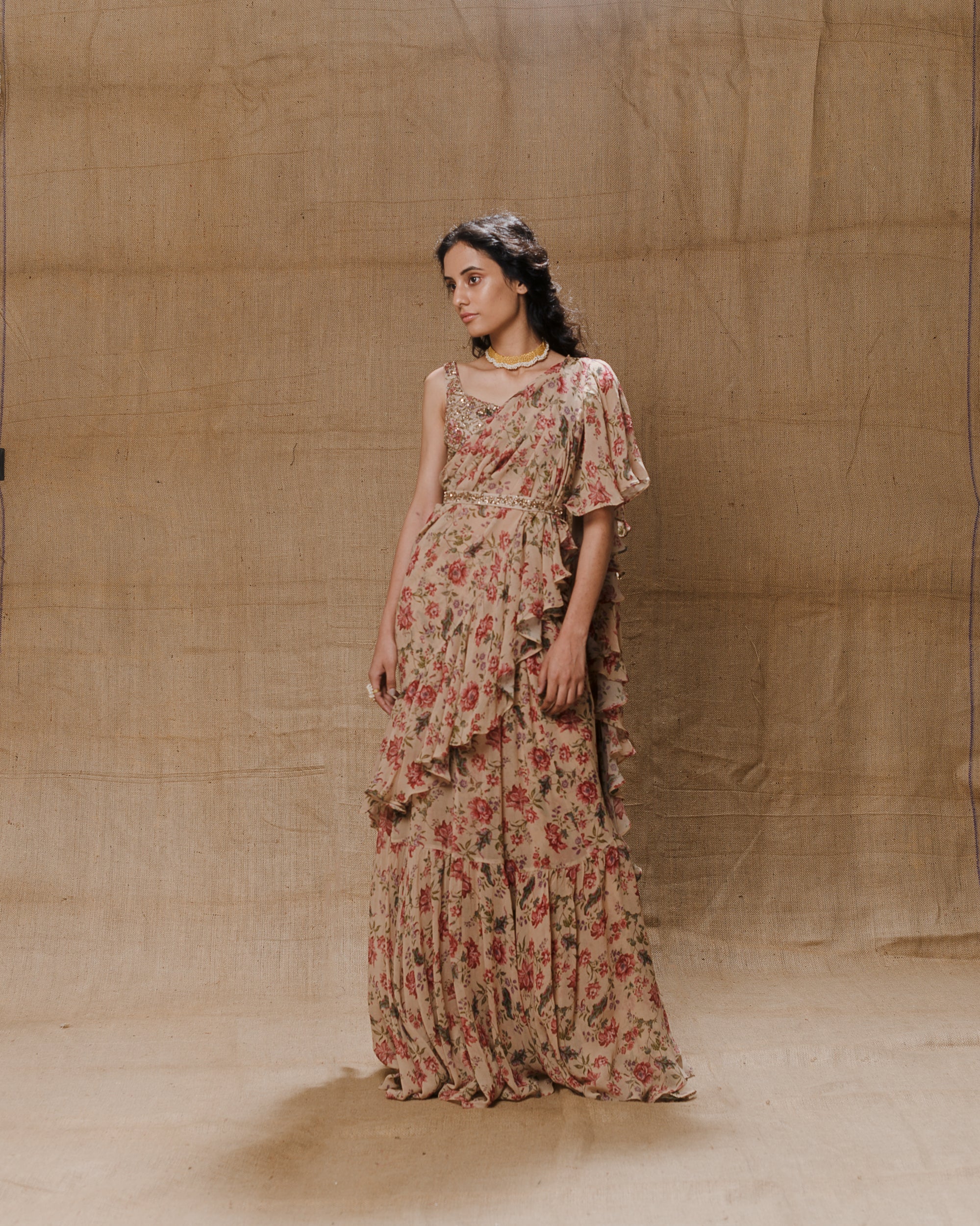 Featuring a VINTAGE PRINTED RUFFLE SAREE SET IN GEORJETTE.