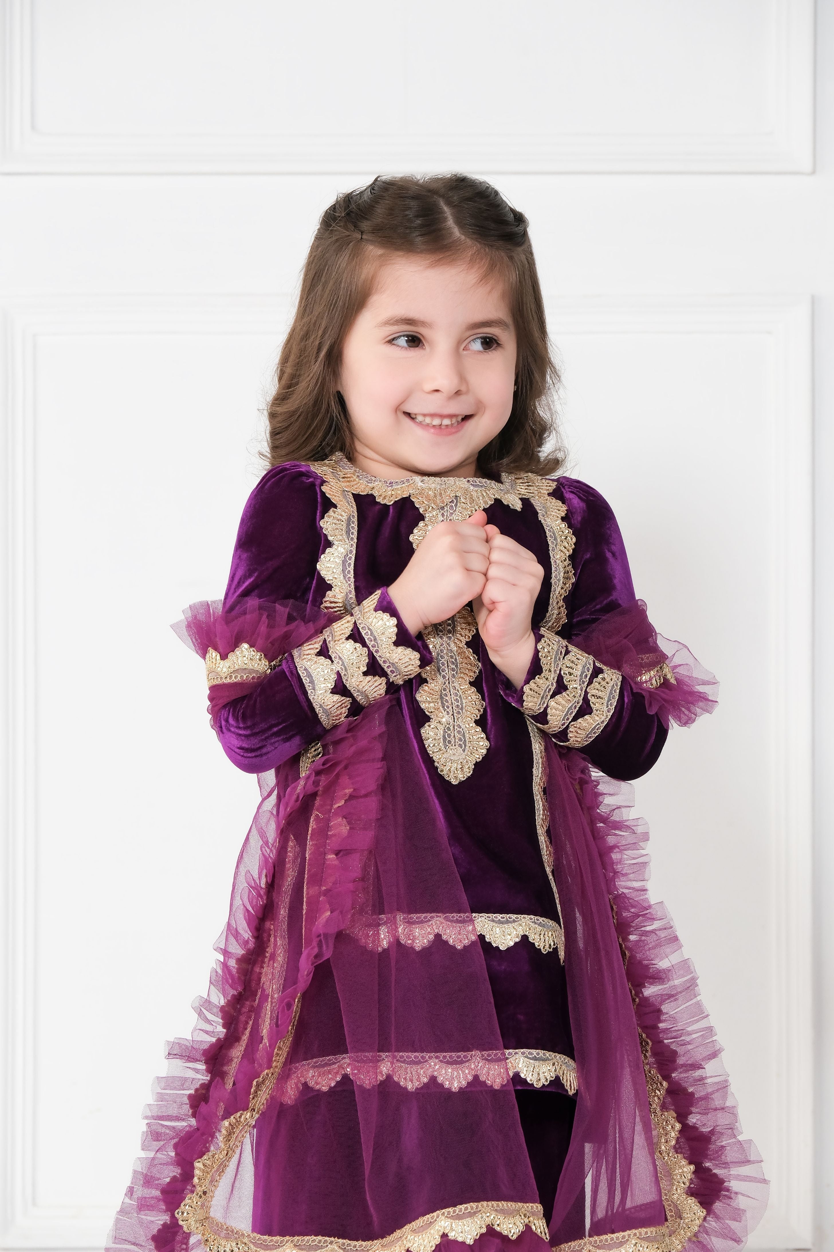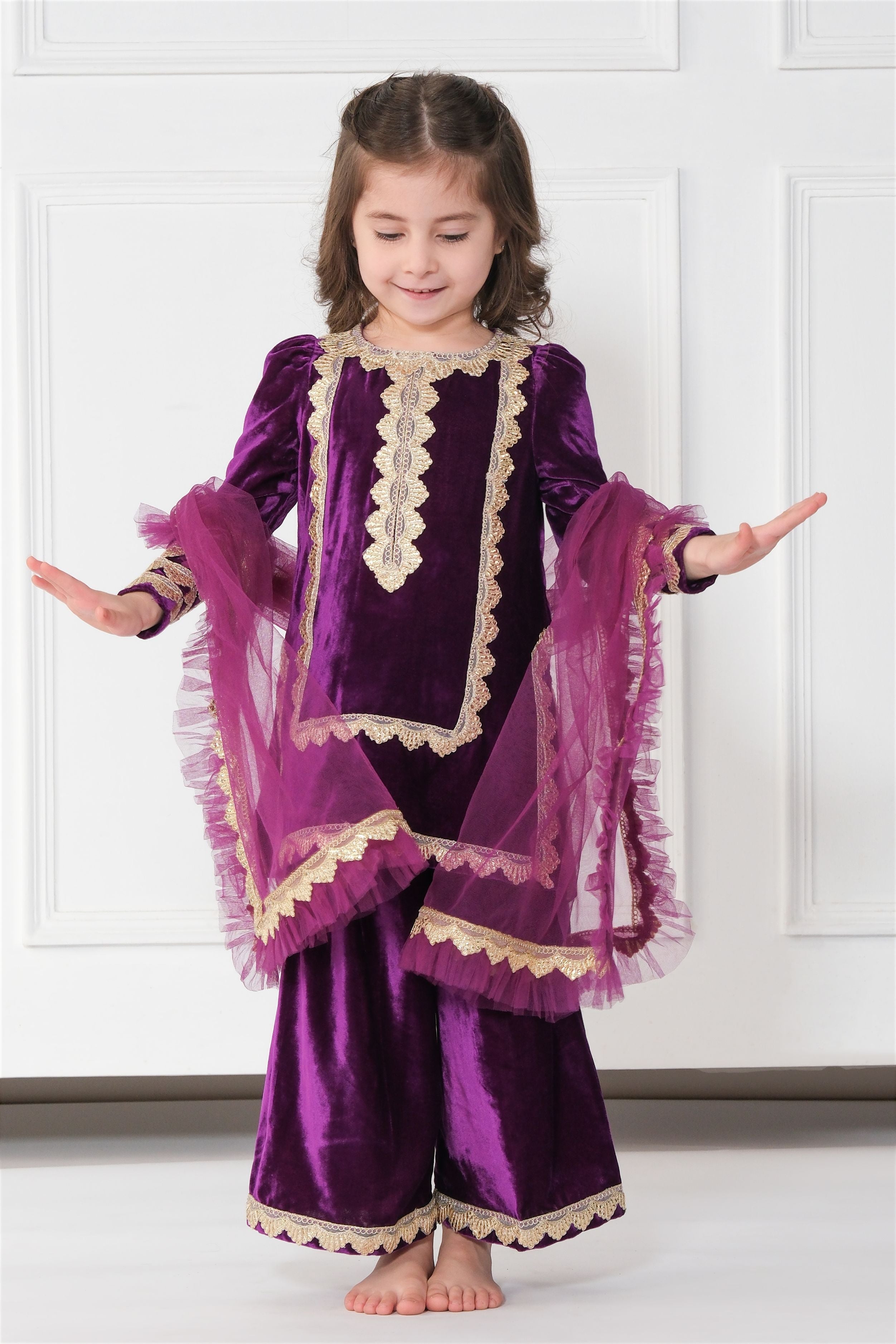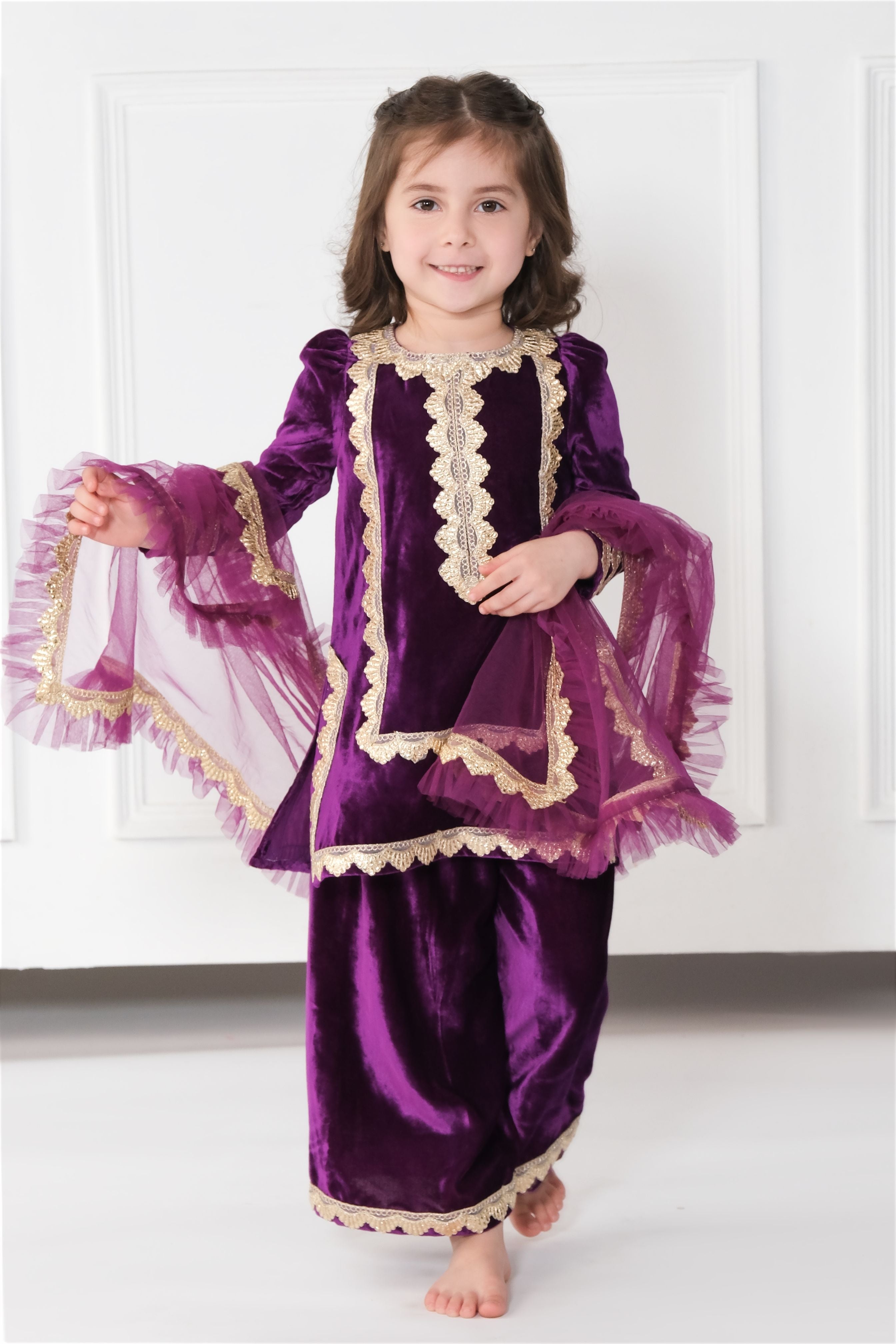 - Made in purple velvet, embellished with beautiful gold gota.