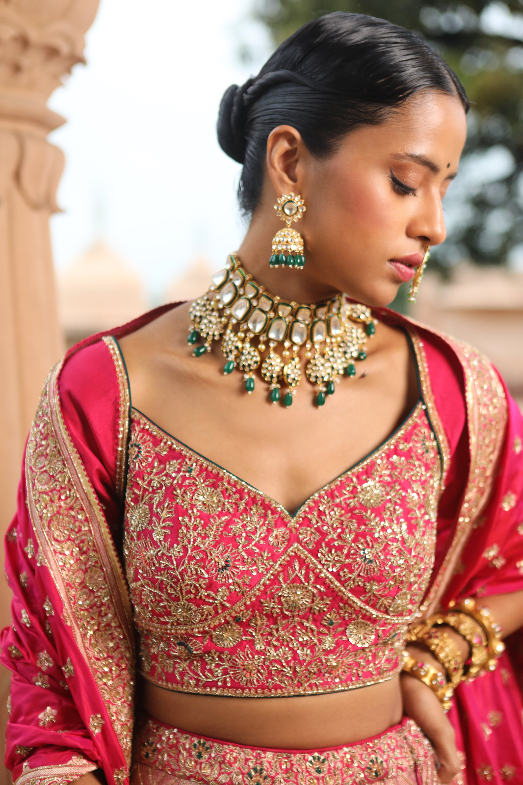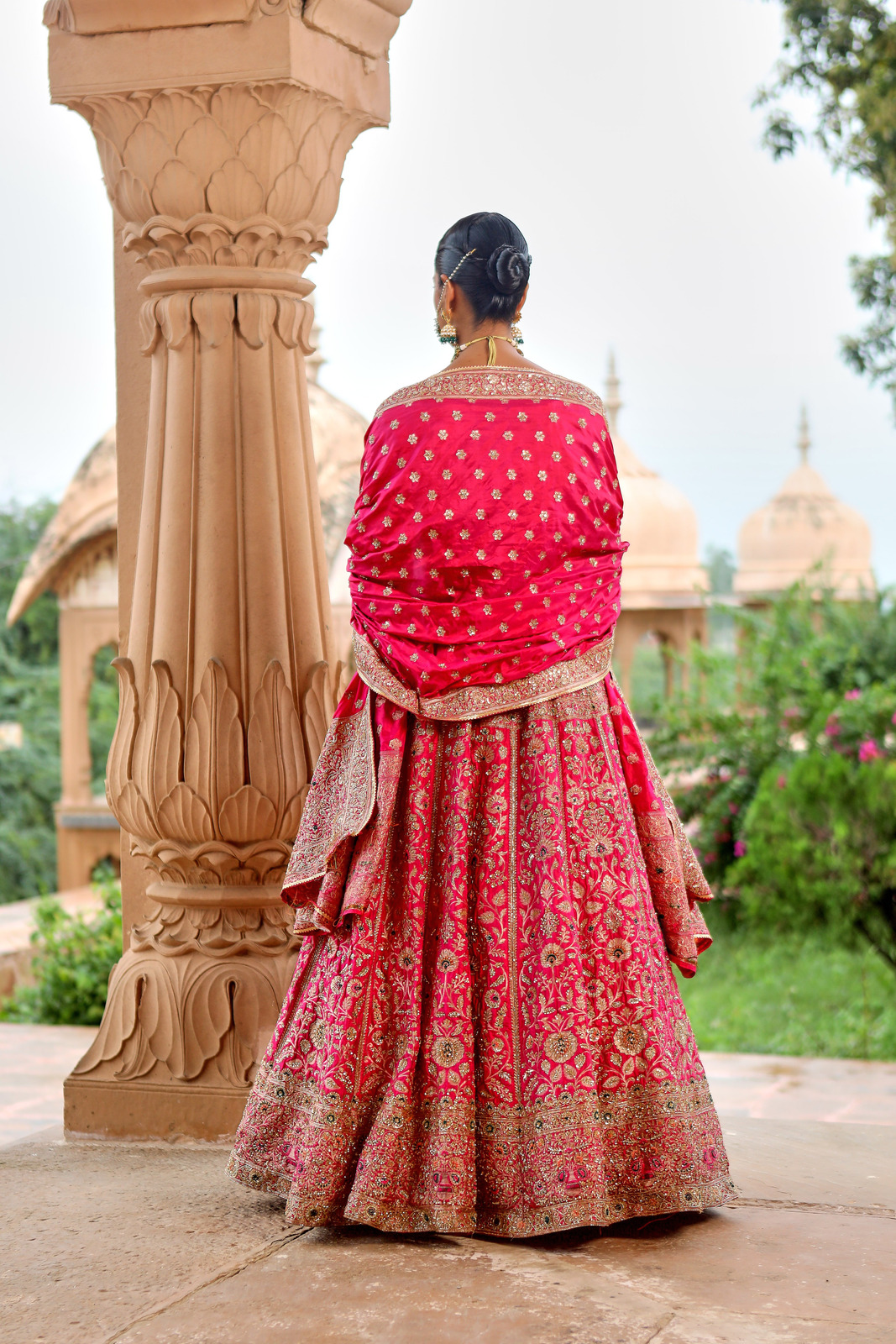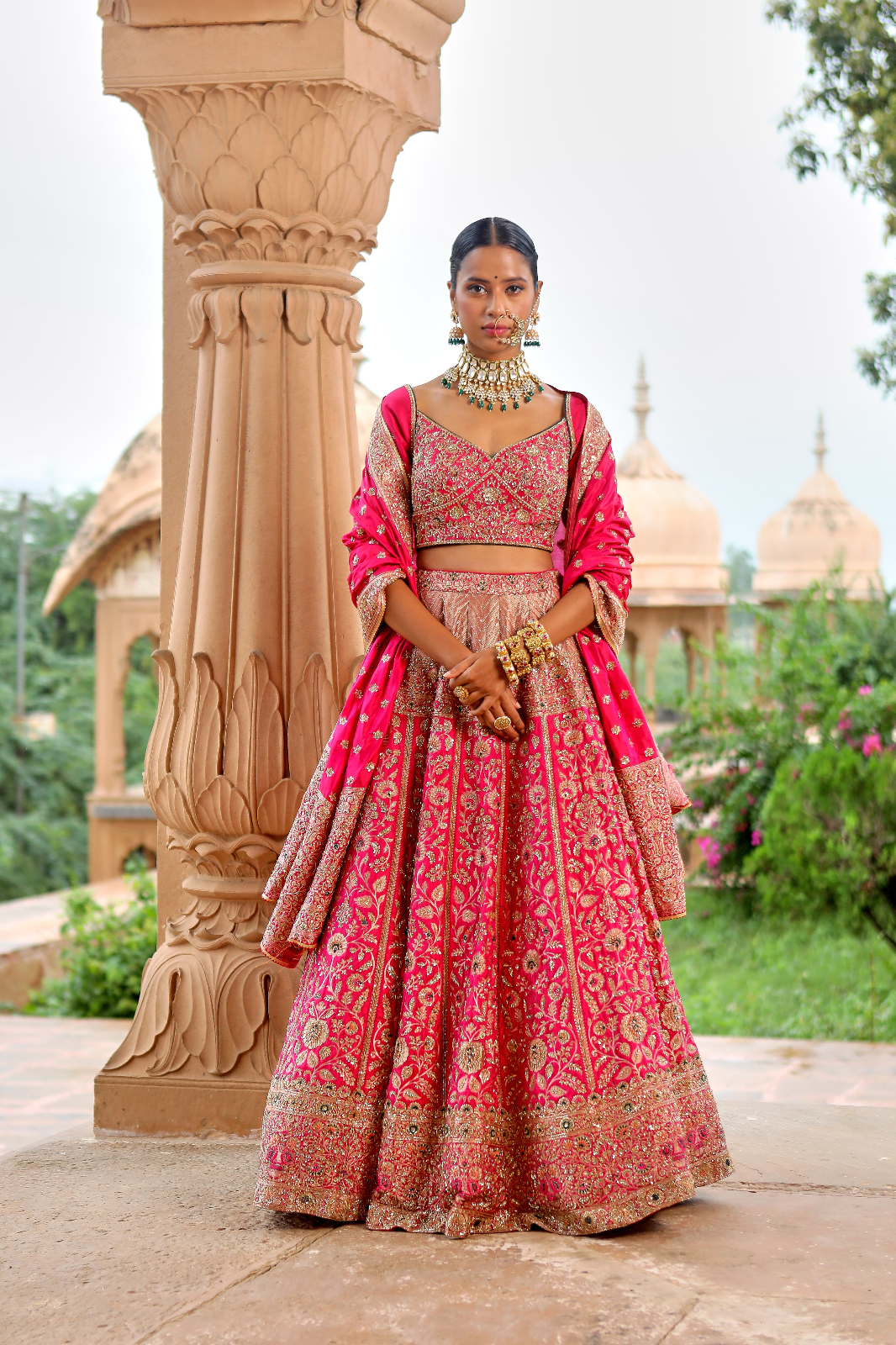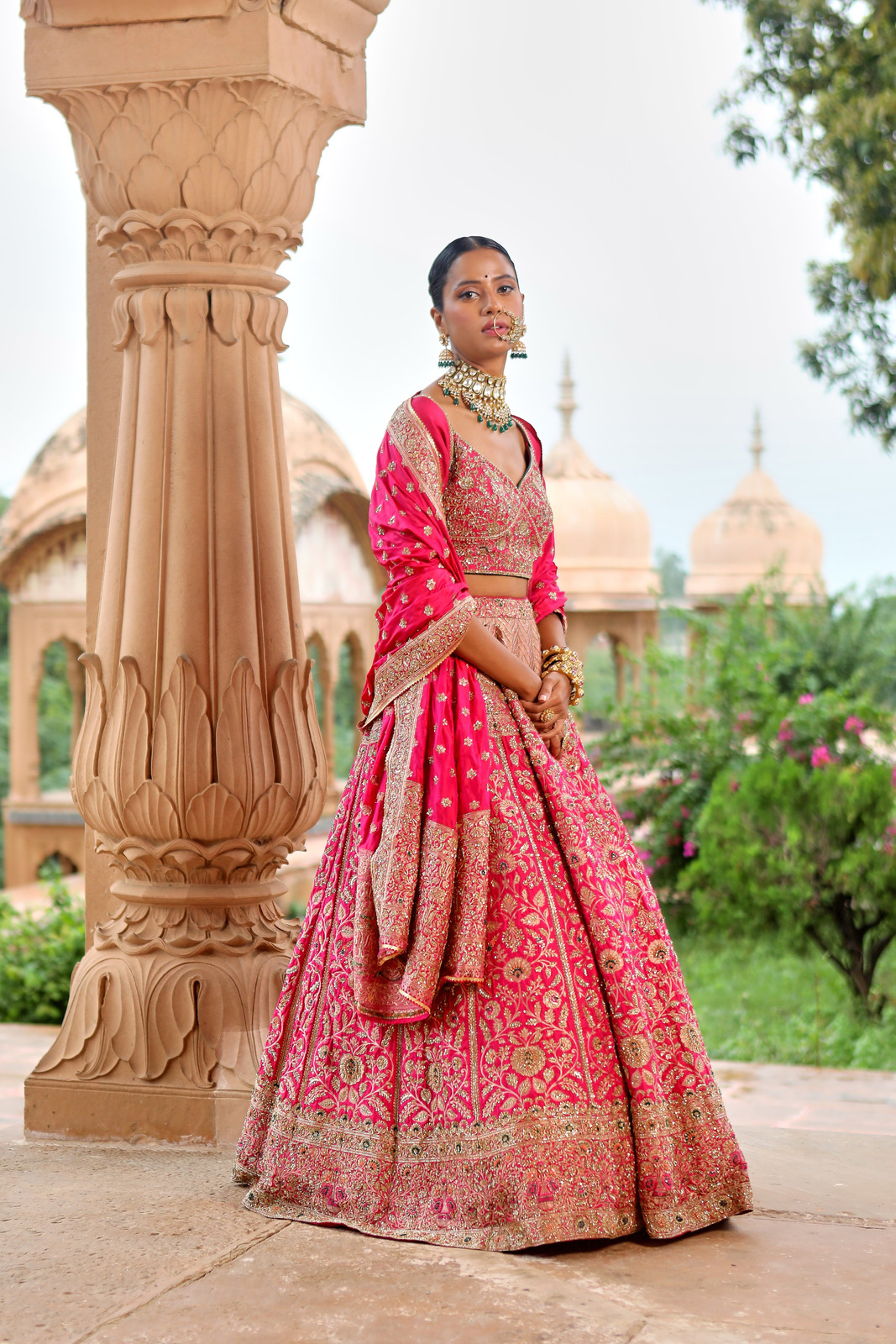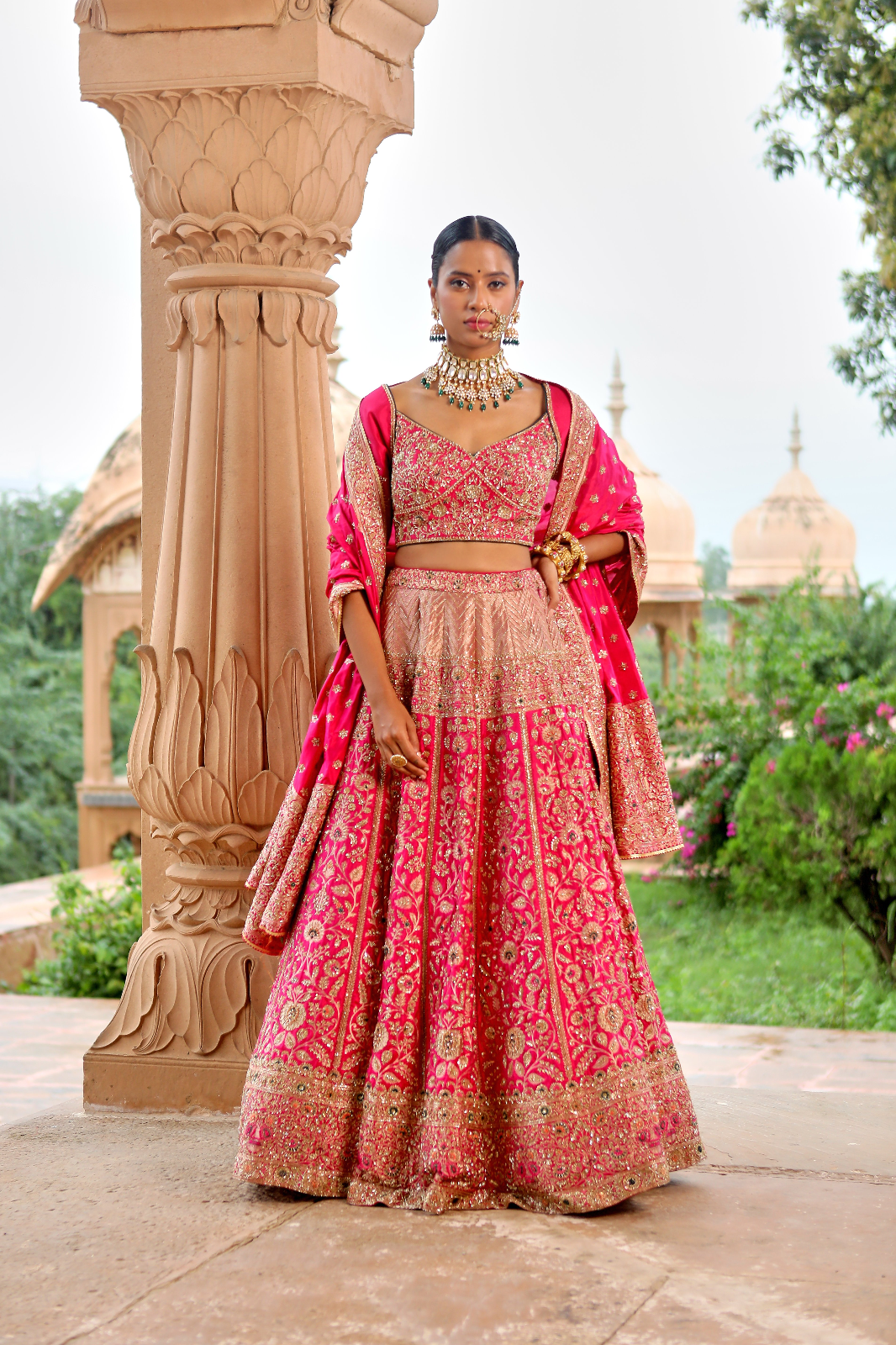 Featuring a fuchsia pink Banarsi Silk bridal lehenga set paired with a Butterfly Net and banarsi dupatta with gold zardozi & aari embroidery