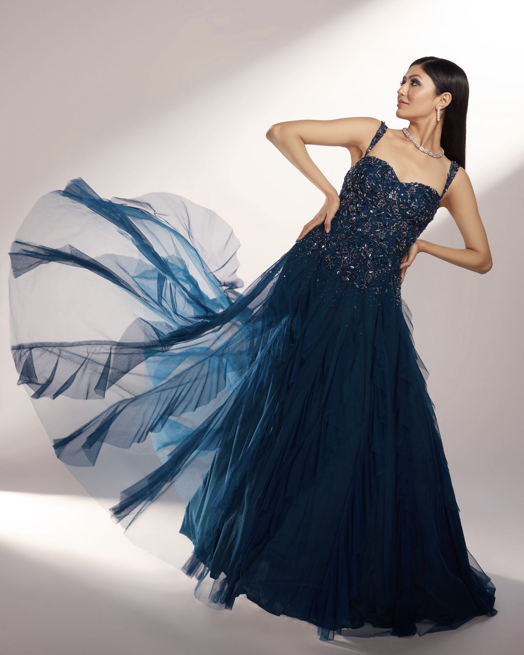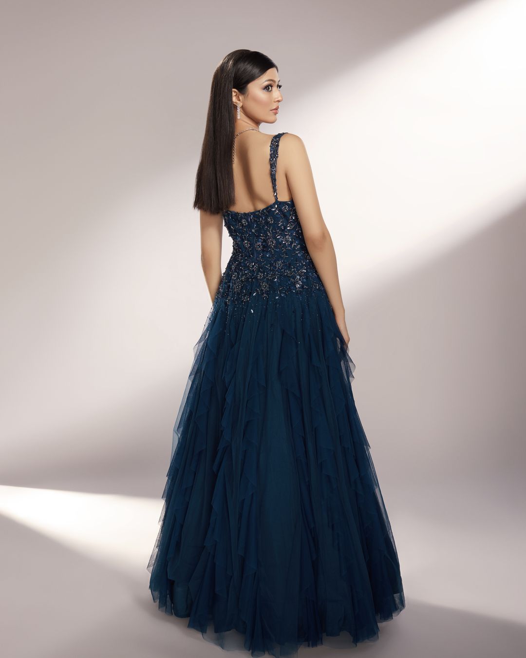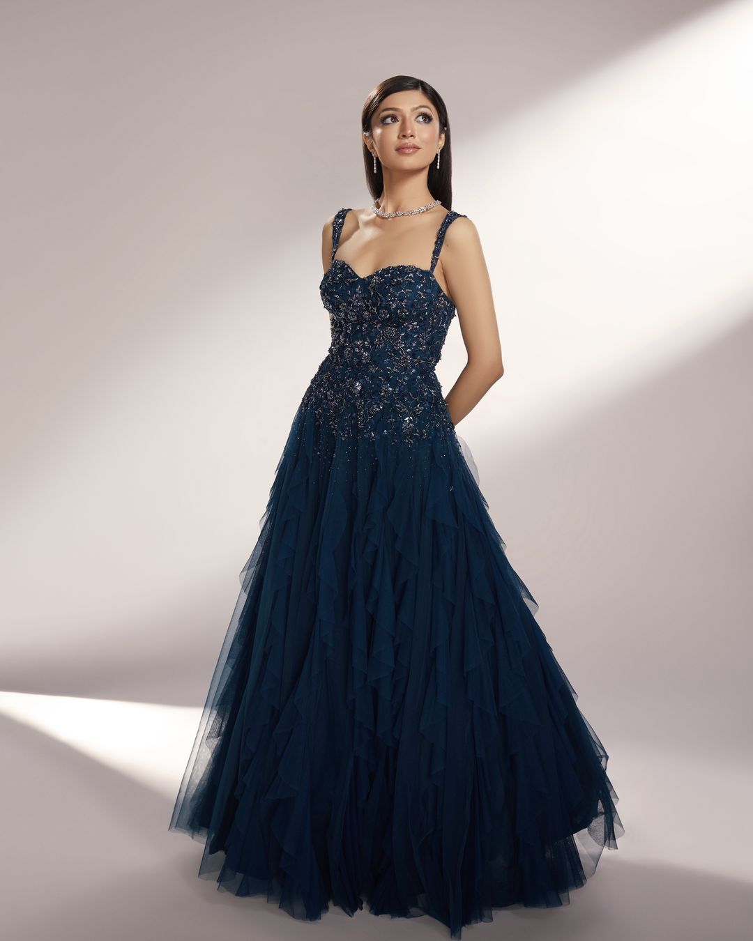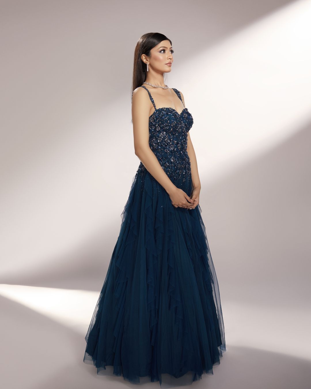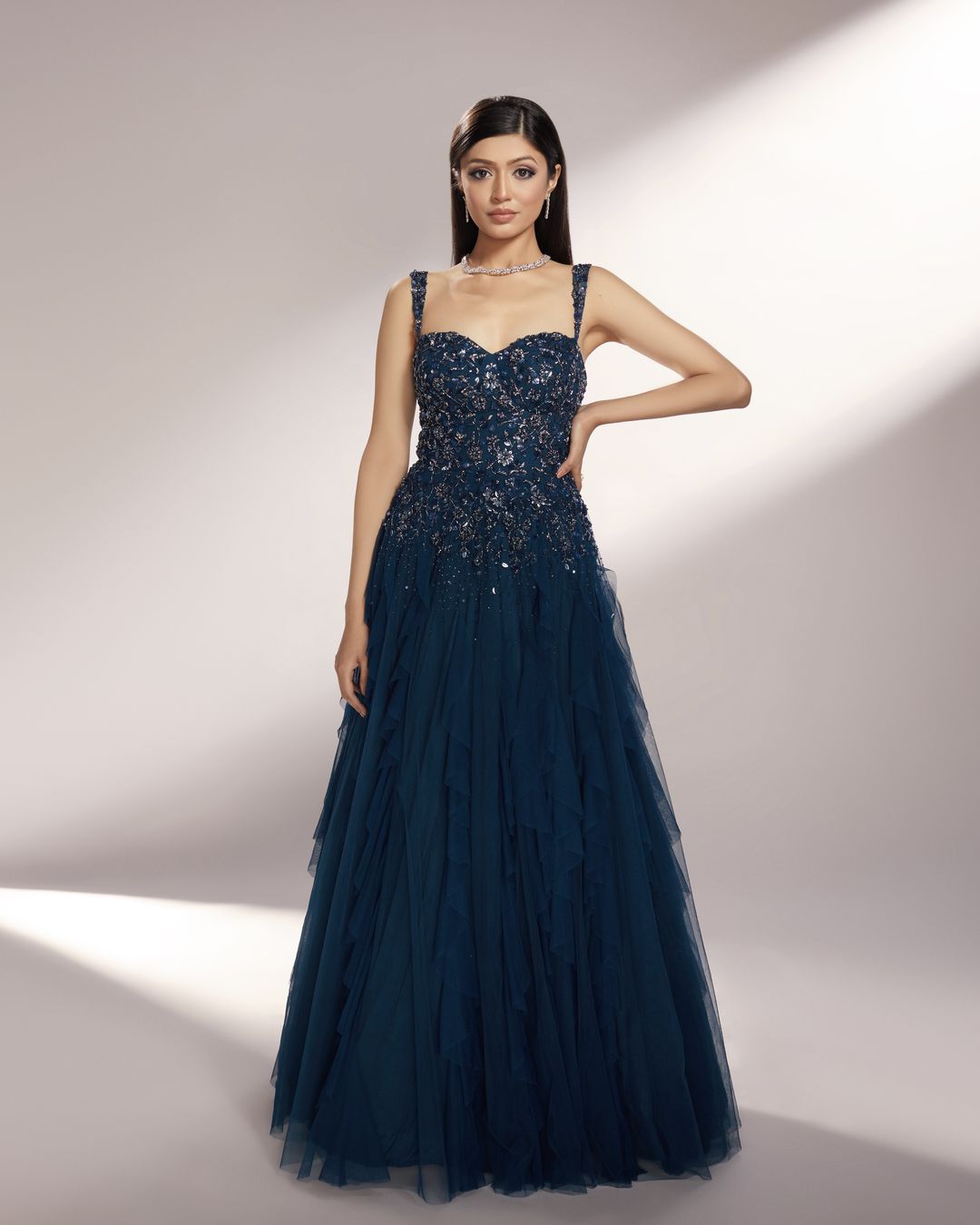 Deep Teal toned ruffled gown paired with delicate floral embroidery with sequins, glass beads and pearls.