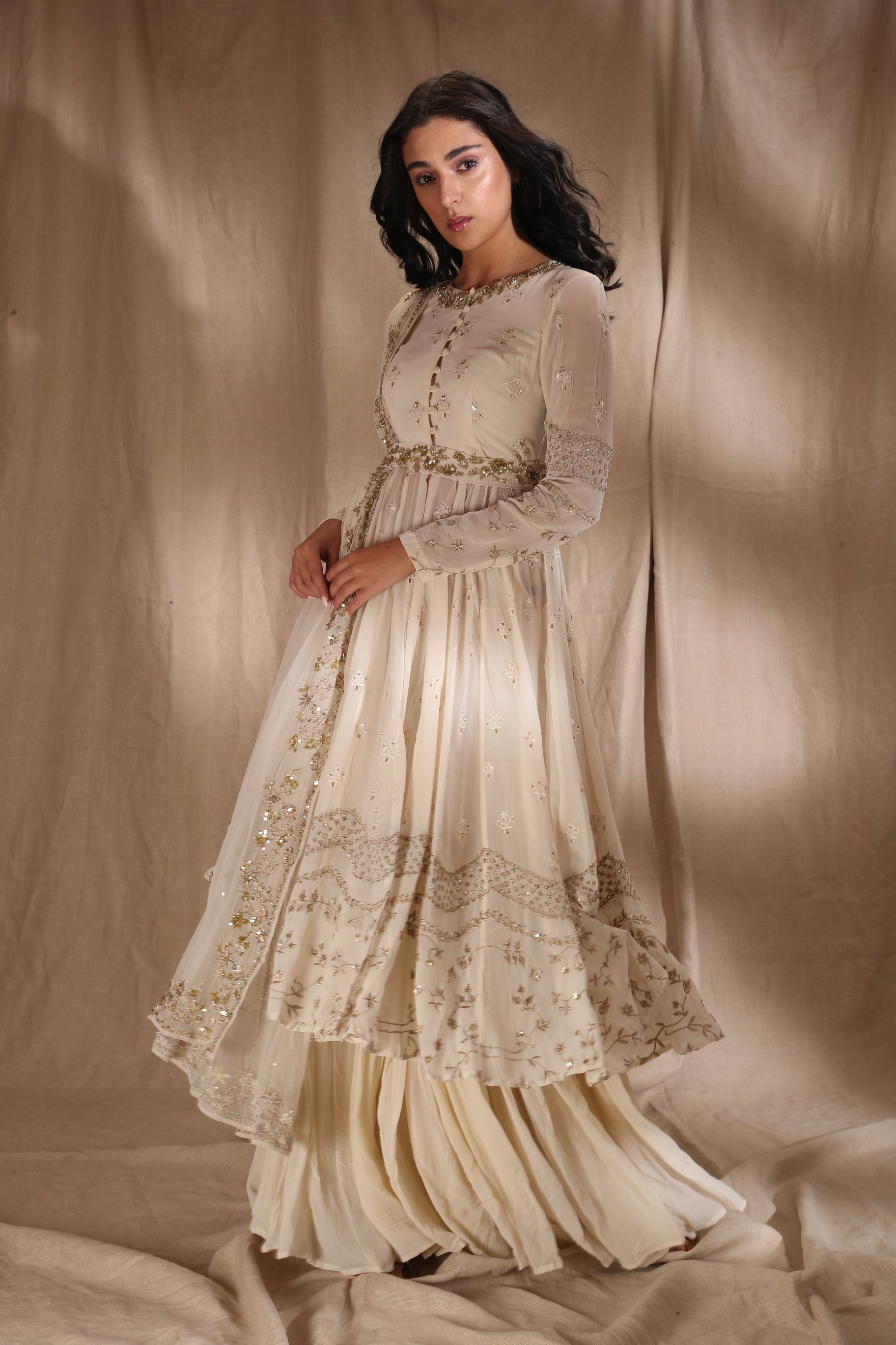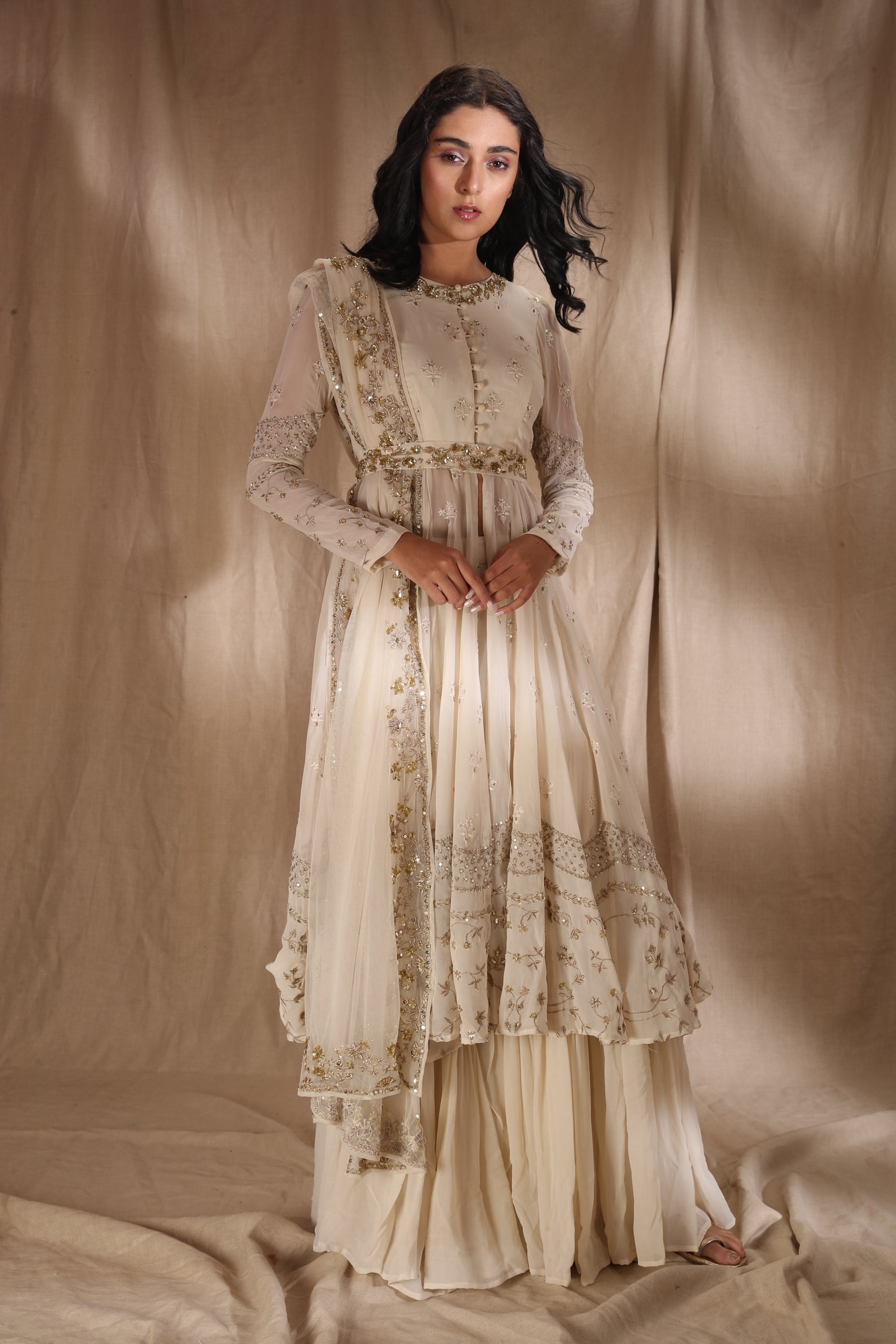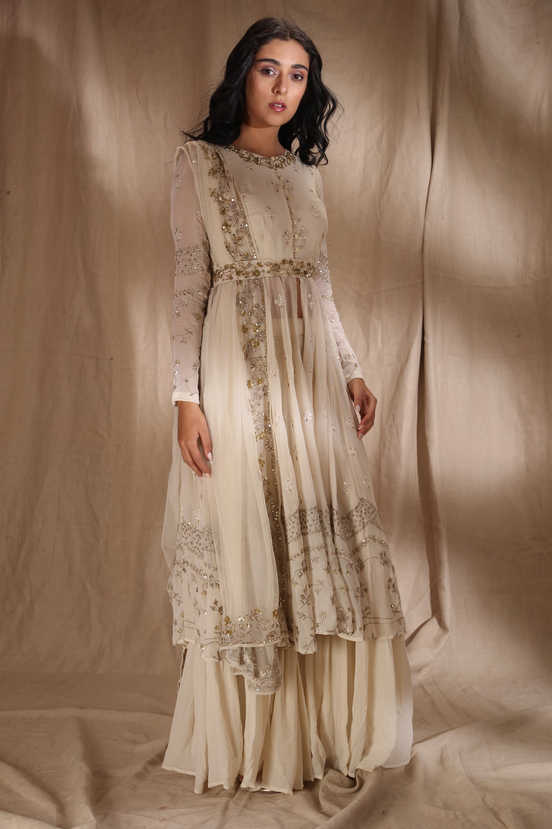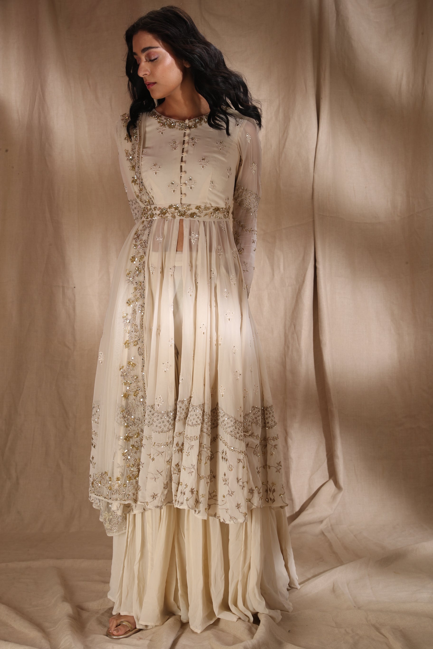 Featuring a WHITE AND GOLD ZARI FRONT OPEN JACKET SET IN GEORGETTE.