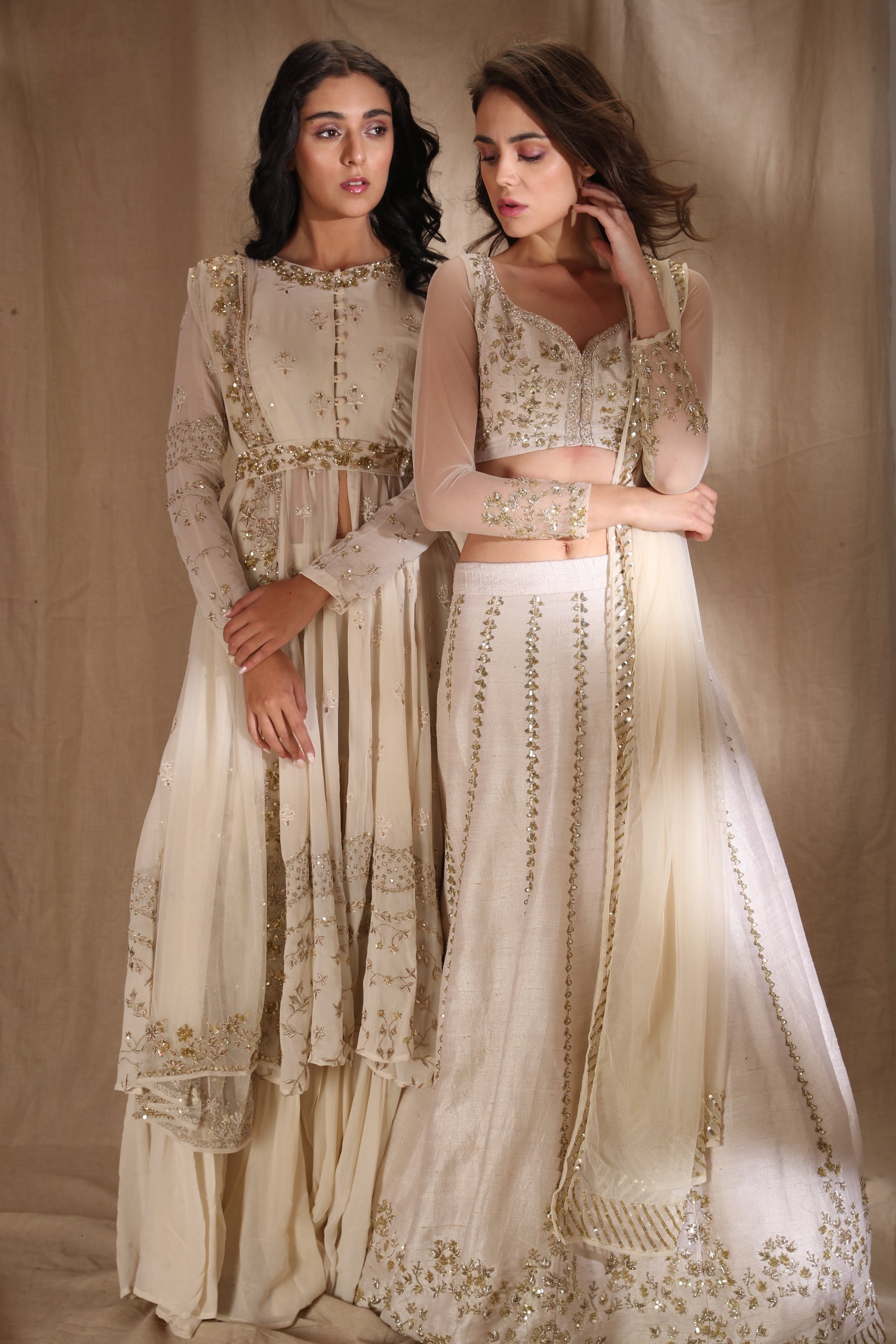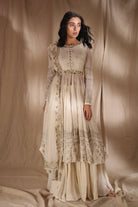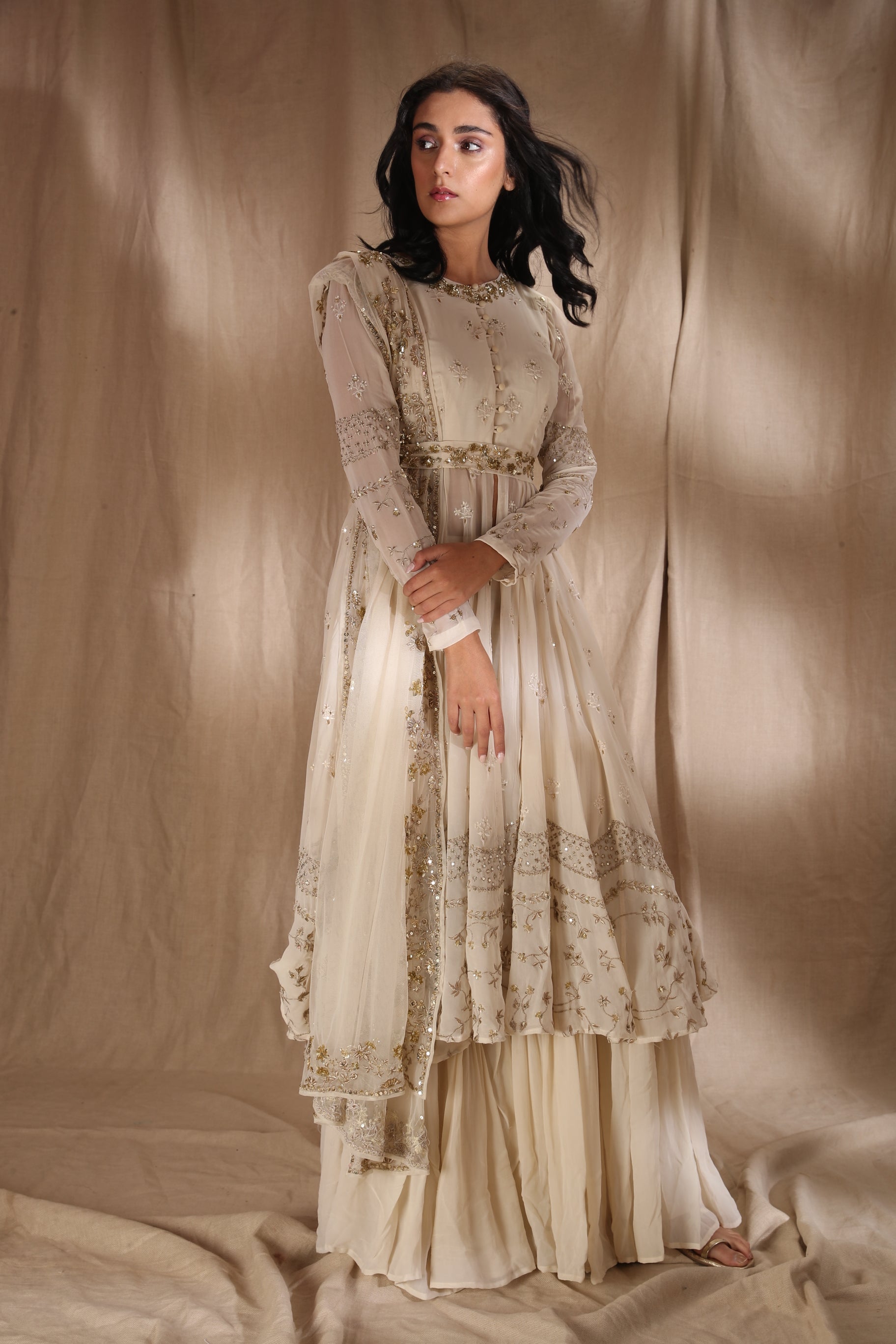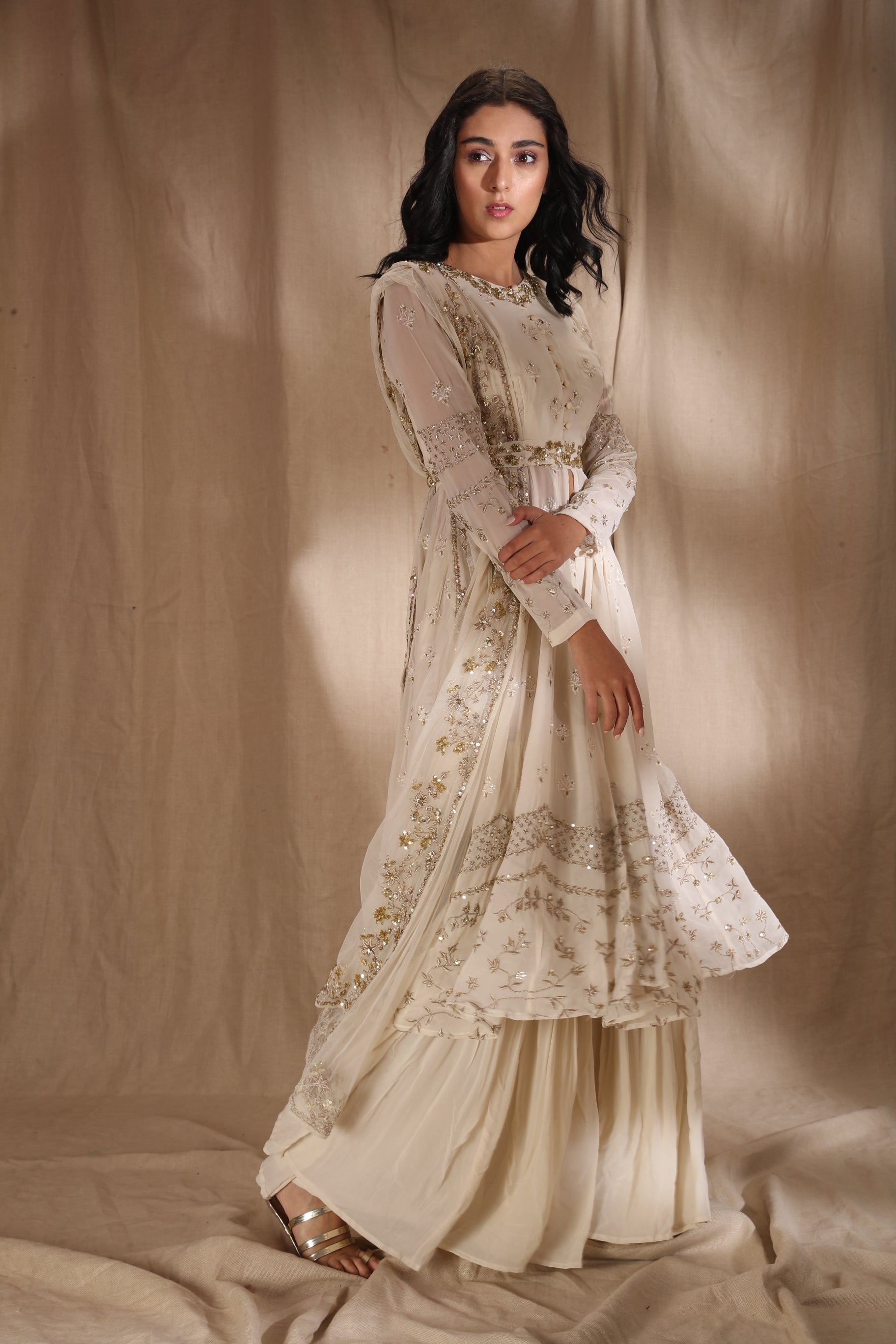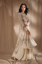 Featuring a WHITE AND GOLD ZARI FRONT OPEN JACKET SET IN GEORGETTE.
