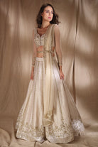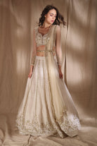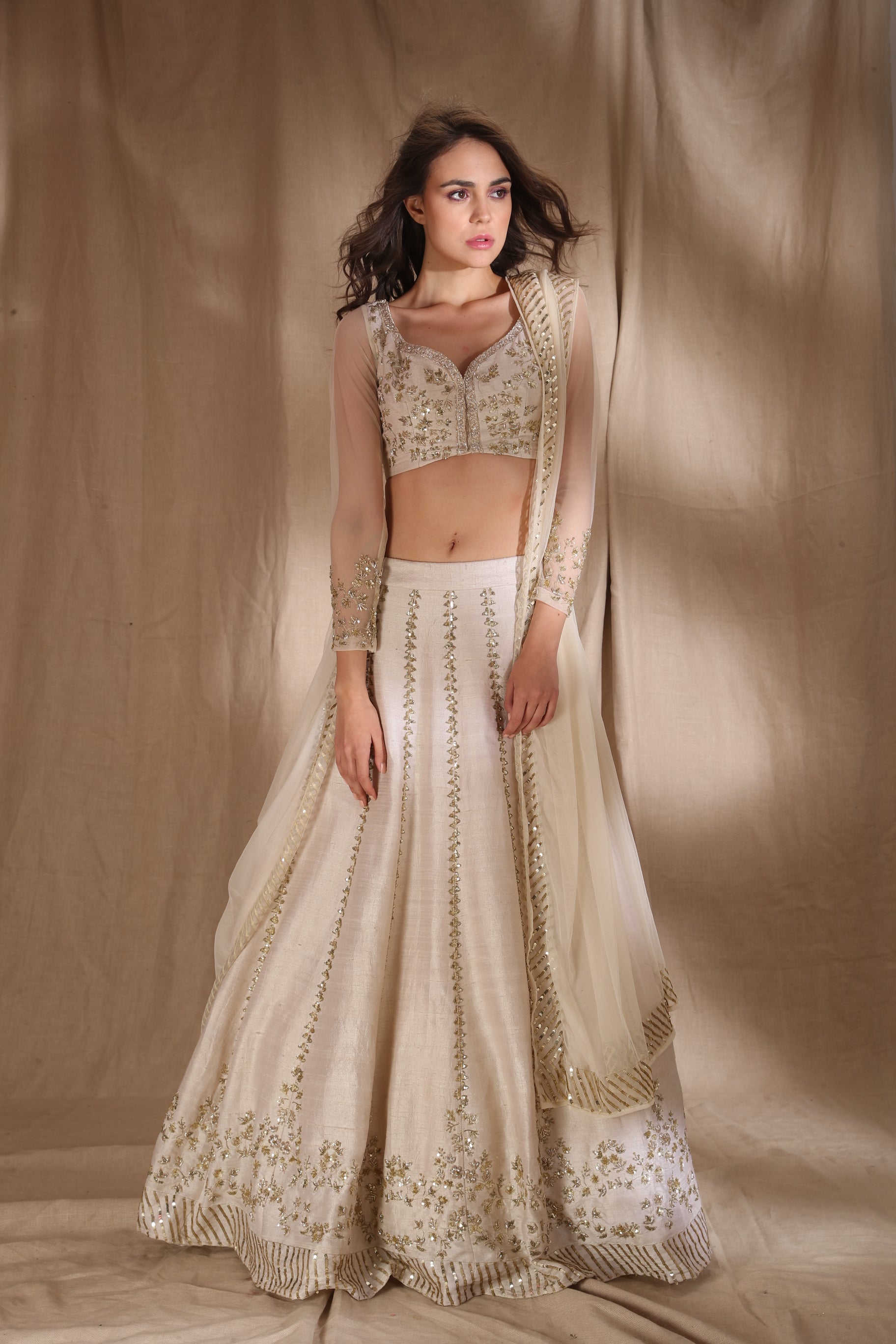 Featuring a WHITE AND GOLD ZARI SEQUIN LEHENGA IN RAW SILK.