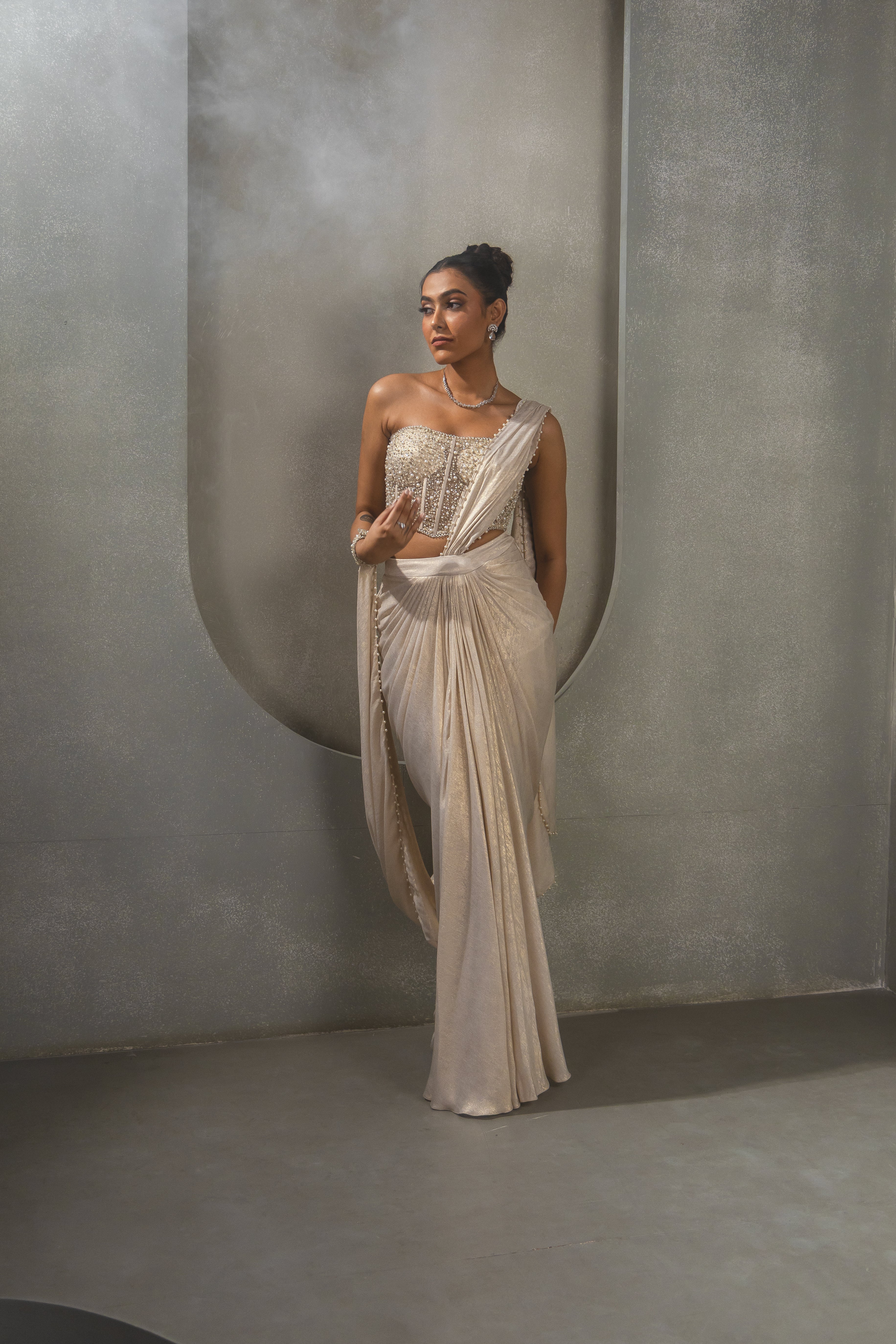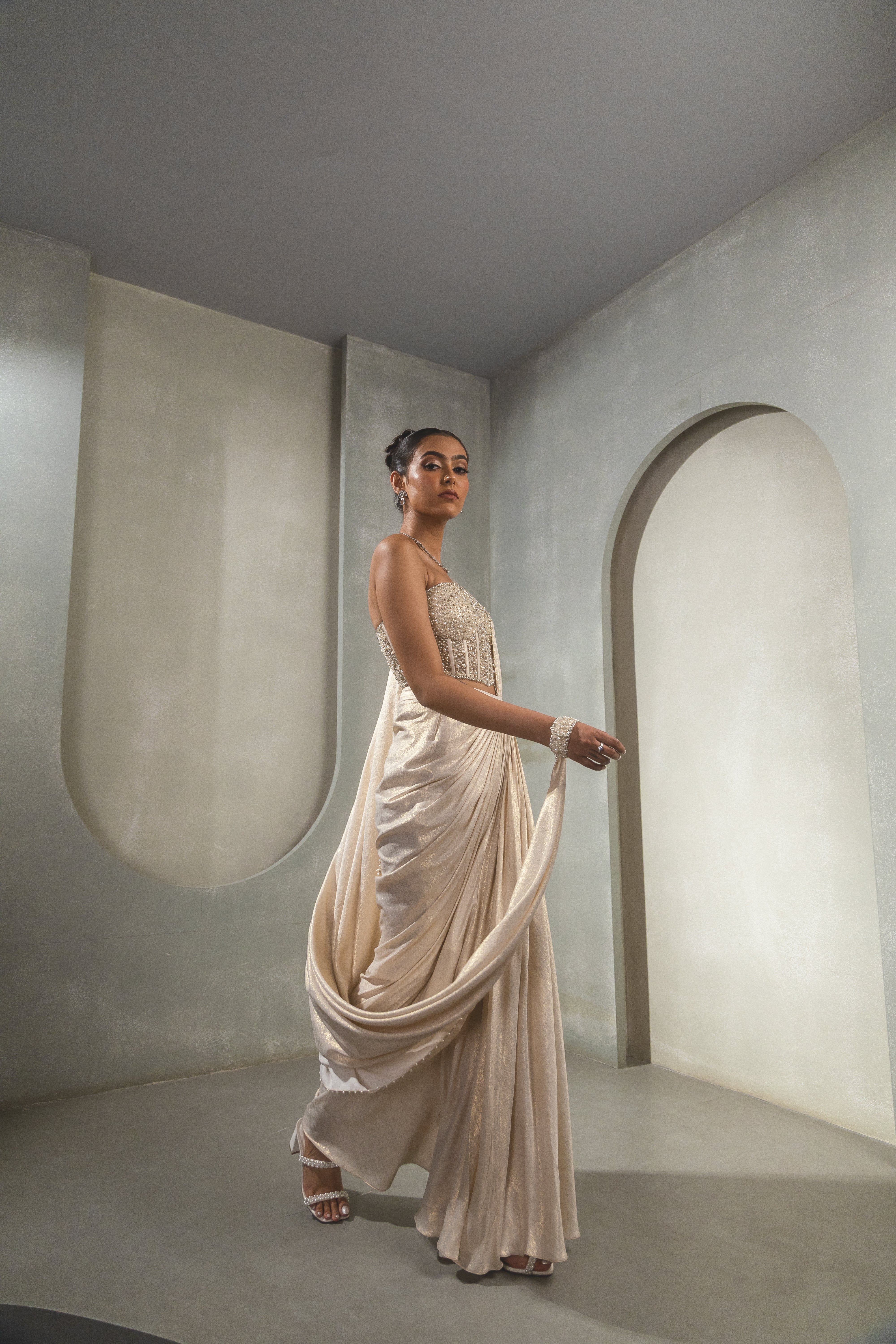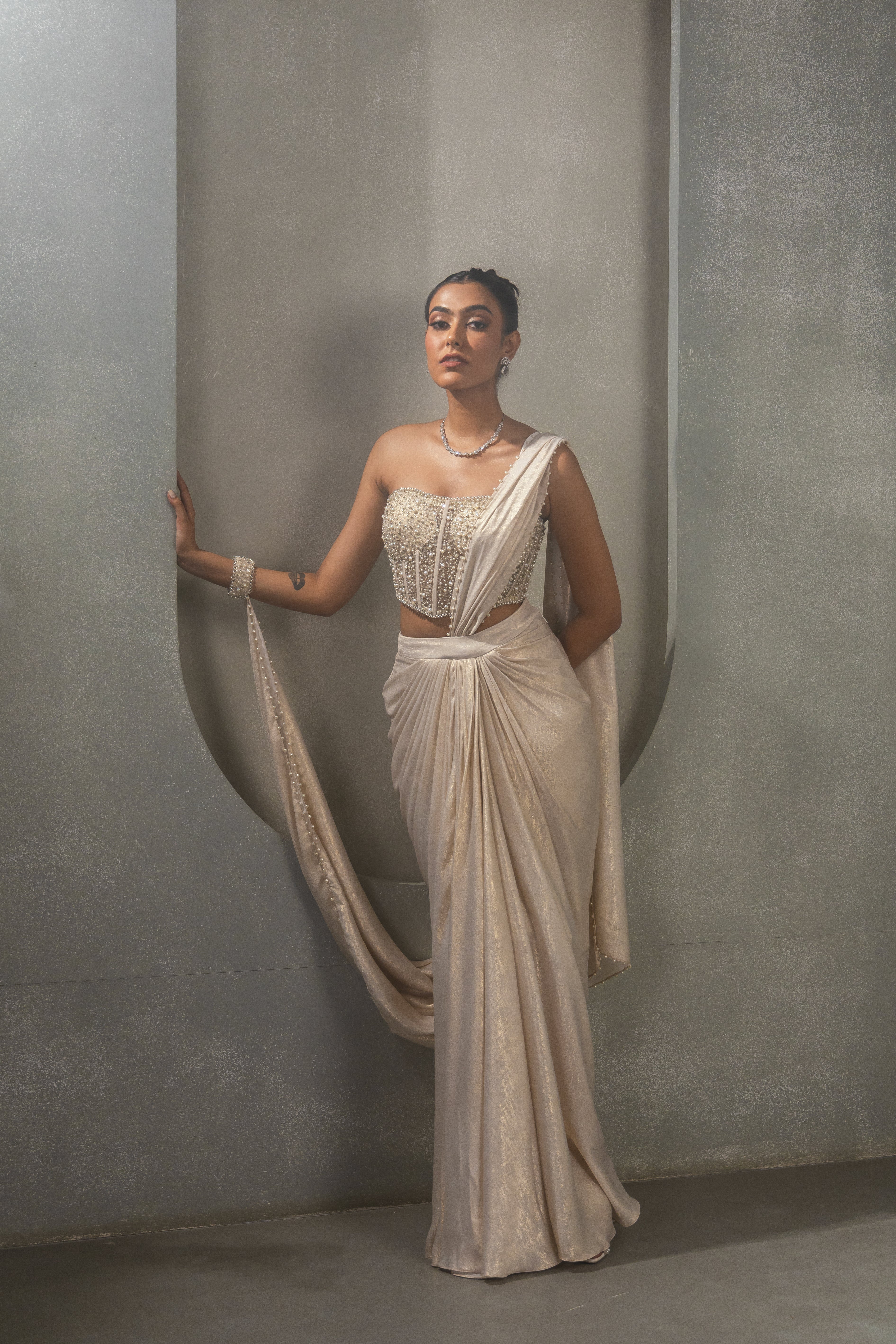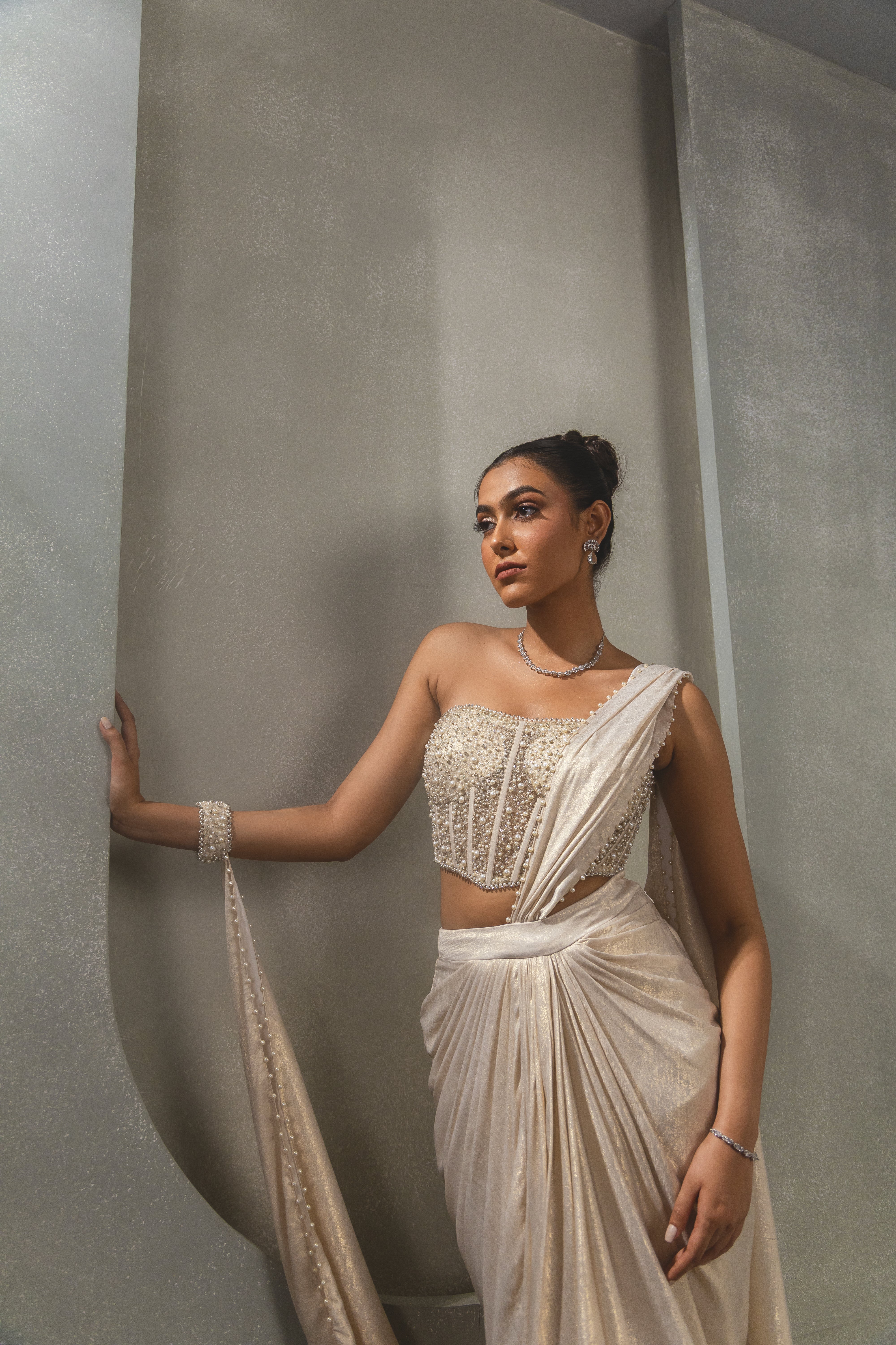 Shop White Gold Saree Drape with structured corset blouse and metallic finesse for a bold festive look. Buy online from Paaro!