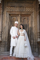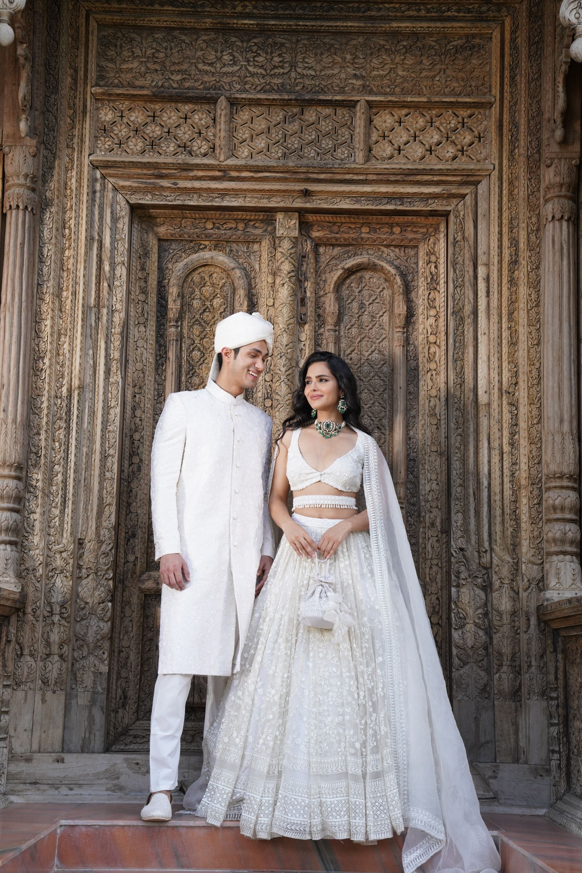 Featuring a White on White Heavy Jaal Work Lehenga set in Organza.